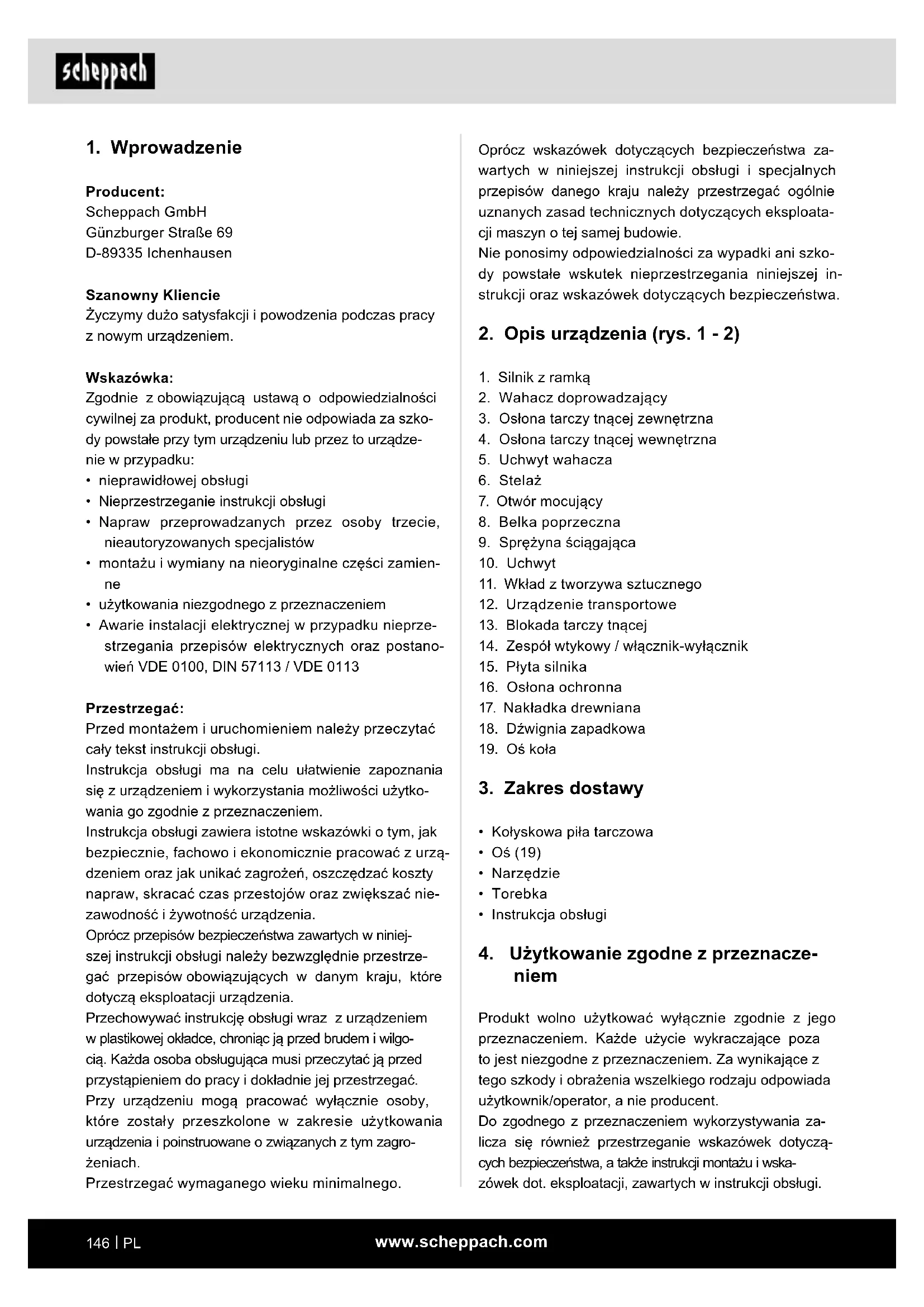 - Awarie instalacji elektrycznej w przypadku nieprze- strzegania przepisów elektrycznych oraz postano- wień VDE 0100, DIN 57113 / VDE 0113 Przestrzegać: Przed montażem i uruchomieniem należy przeczytać cały tekst instrukcji obsługi. Instrukcja obsługi ma na celu ułatwienie zapoznania się z urządzeniem i wykorzystania możliwości użytko- wania go zgodnie z przeznaczeniem. Instrukcja obsługi zawiera istotne wskazówki o tym, jak bezpiecznie, fachowo i ekonomicznie pracować z urzą- dzeniem oraz jak unikać zagrożeń, oszczędzać koszty napraw, skracać czas przestojów oraz zwiększać nie- zawodność i żywotność urządzenia. Oprócz przepisów bezpieczeństwa zawartych w niniej- szej instrukcji obsługi należy bezwzględnie przestrze- gać przepisów obowiązujących w danym kraju, które dotyczą eksploatacji urządzenia. Przechowywać instrukcję obsługi wraz z urządzeniem w plastikowej okładce, chroniąc ją przed brudem i wilgo- cią. Każda osoba obsługująca musi przeczytać ją przed przystąpieniem do pracy i dokładnie jej przestrzegać. Przy urządzeniu mogą pracować wyłącznie osoby, które zostały przeszkolone w zakresie użytkowania urządzenia i poinstruowane o związanych z tym zagro- żeniach. Przestrzegać wymaganego wieku minimalnego.www.scheppach.com
