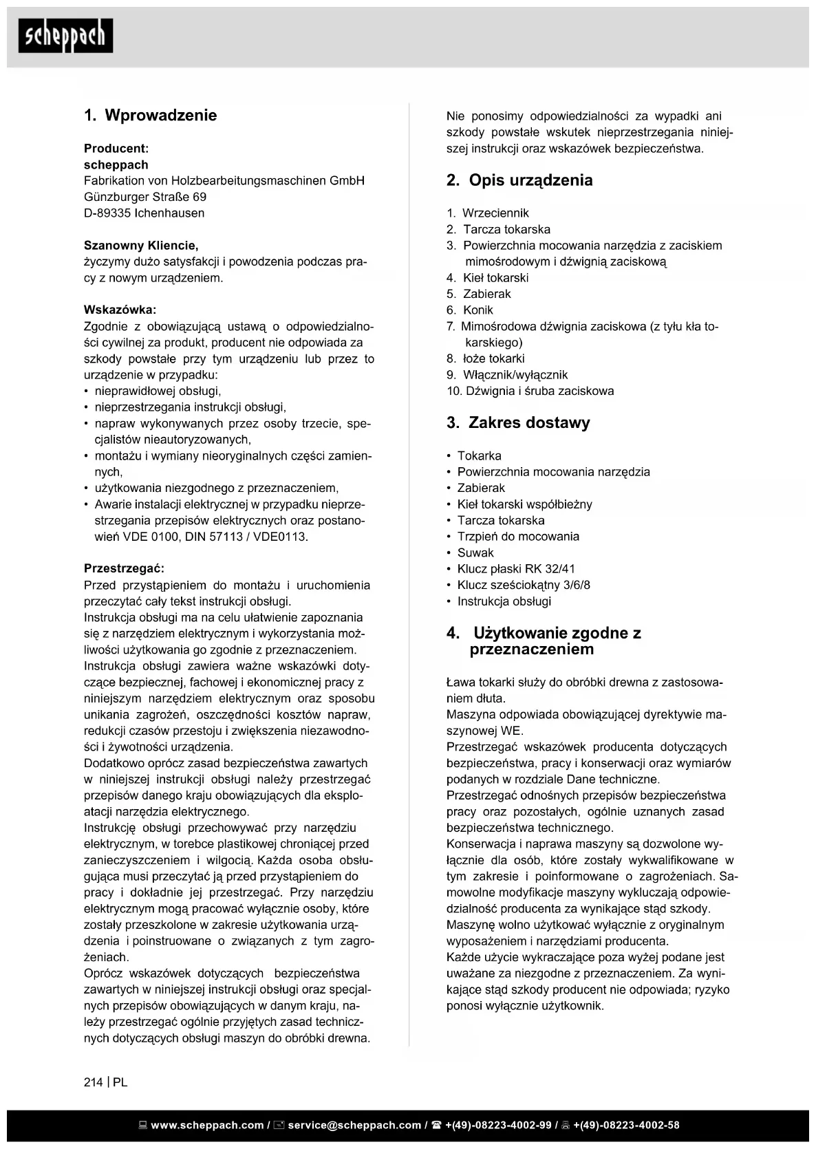 - Awarie instalacji elektrycznej w przypadku nieprze- strzegania przepisów elektrycznych oraz postano- wień VDE 0100, DIN 57113 / VDE0113. Przestrzegać: Przed przystąpieniem do montażu i uruchomienia przeczytać cały tekst instrukcji obsługi. Instrukcja obsługi ma na celu ułatwienie zapoznania się z narzędziem elektrycznym i wykorzystania moż- liwości użytkowania go zgodnie z przeznaczeniem. Instrukcja obsługi zawiera ważne wskazówki doty- czące bezpiecznej, fachowej i ekonomicznej pracy z niniejszym narzędziem elektrycznym oraz sposobu unikania zagrożeń, oszczędności kosztów napraw, redukcji czasów przestoju i zwiększenia niezawodno- ści i żywotności urządzenia. Dodatkowo oprócz zasad bezpieczeństwa zawartych w niniejszej instrukcji obsługi należy przestrzegać przepisów danego kraju obowiązujących dla eksplo- atacji narzędzia elektrycznego. Instrukcję obsługi przechowywać przy narzędziu elektrycznym, w torebce plastikowej chroniącej przed zanieczyszczeniem i wilgocią. Każda osoba obsłu- gująca musi przeczytać ją przed przystąpieniem do pracy i dokładnie jej przestrzegać. Przy narzędziu elektrycznym mogą pracować wyłącznie osoby, które zostały przeszkolone w zakresie użytkowania urzą- dzenia i poinstruowane o związanych z tym zagro- żeniach. Oprócz wskazówek dotyczących bezpieczeństwa zawartych w niniejszej instrukcji obsługi oraz specjal- nych przepisów obowiązujących w danym kraju, na- leży przestrzegać ogólnie przyjętych zasad technicz- nych dotyczących obsługi maszyn do obróbki drewna. www.scheppach.com / service@scheppach.com / +(49)-08223-4002-99 / +(49)-08223-4002-58