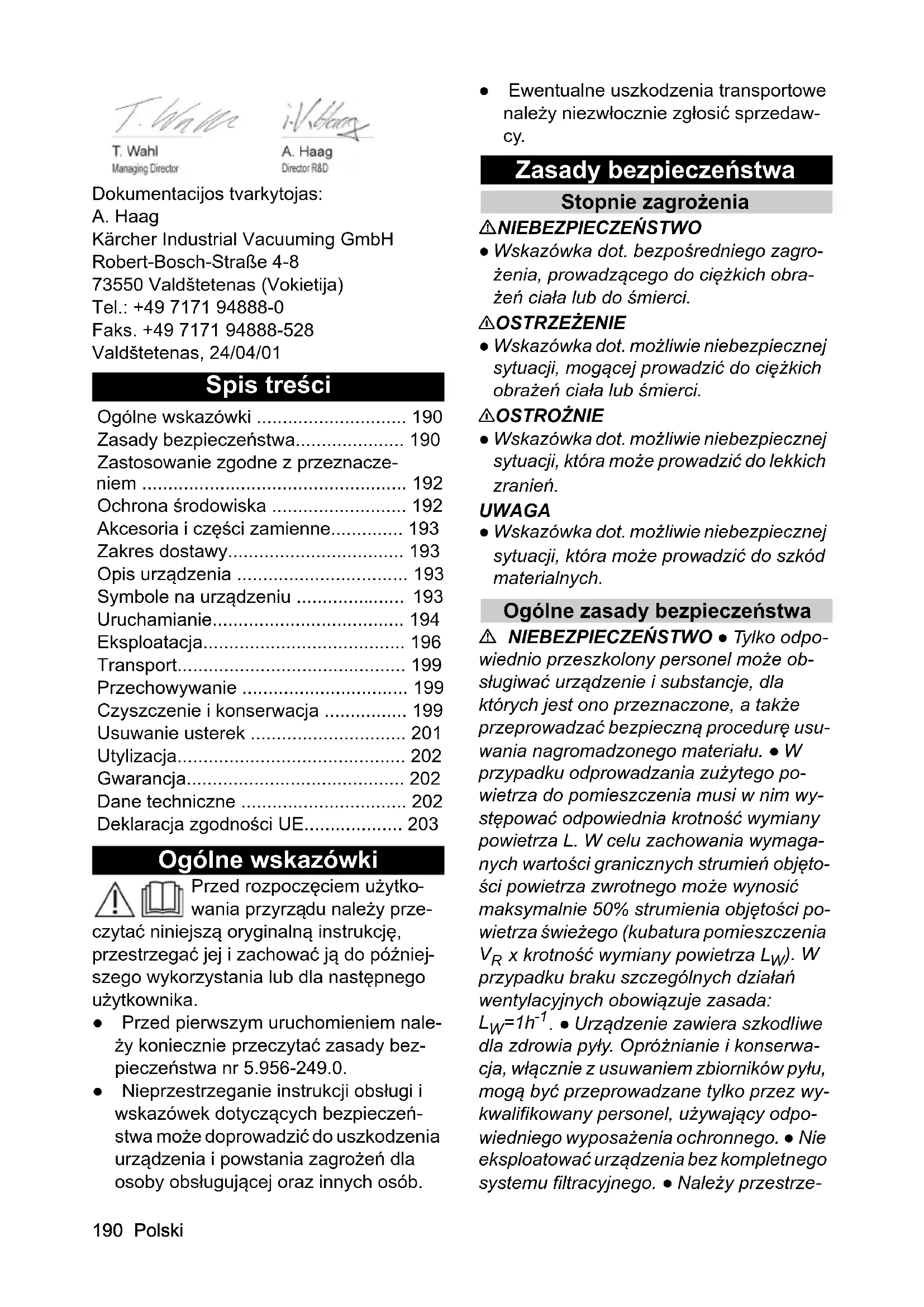Kabelio ilgis m 10190 Polski Dokumentacijos tvarkytojas: A. Haag Kärcher Industrial Vacuuming GmbH Robert-Bosch-Straße 4-8 73550 Valdštetenas (Vokietija) Tel.: +49 7171 94888-0 Faks. +49 7171 94888-528 Valdštetenas, 24/04/01 Spis treści Ogólne wskazówki Przed rozpoczęciem użytko- wania przyrządu należy prze- czytać niniejszą oryginalną instrukcję, przestrzegać jej i zachować ją do później- szego wykorzystania lub dla następnego użytkownika. ● Przed pierwszym uruchomieniem nale- ży koniecznie przeczytać zasady bez- pieczeństwa nr 5.956-249.0. ● Nieprzestrzeganie instrukcji obsługi i wskazówek dotyczących bezpieczeń- stwa może doprowadzić do uszkodzenia urządzenia i powstania zagrożeń dla osoby obsługującej oraz innych osób. ● Ewentualne uszkodzenia transportowe należy niezwłocznie zgłosić sprzedaw- cy. Zasady bezpieczeństwa Stopnie zagrożenia NIEBEZPIECZEŃSTWO ● Wskazówka dot. bezpośredniego zagro- żenia, prowadzącego do ciężkich obra- żeń ciała lub do śmierci. 몇 OSTRZEŻENIE ● Wskazówka dot. możliwie niebezpiecznej sytuacji, mogącej prowadzić do ciężkich obrażeń ciała lub śmierci. 몇 OSTROŻNIE ● Wskazówka dot. możliwie niebezpiecznej sytuacji, która może prowadzić do lekkich zranień. UWAGA ● Wskazówka dot. możliwie niebezpiecznej sytuacji, która może prowadzić do szkód materialnych. Ogólne zasady bezpieczeństwa NIEBEZPIECZEŃSTWO ● Tylko odpo- wiednio przeszkolony personel może ob- sługiwać urządzenie i substancje, dla których jest ono przeznaczone, a także przeprowadzać bezpieczną procedurę usu- wania nagromadzonego materiału. ● W przypadku odprowadzania zużytego po- wietrza do pomieszczenia musi w nim wy- stępować odpowiednia krotność wymiany powietrza L. W celu zachowania wymaga- nych wartości granicznych strumień objęto- ści powietrza zwrotnego może wynosić maksymalnie 50% strumienia objętości po- wietrza świeżego (kubatura pomieszczenia