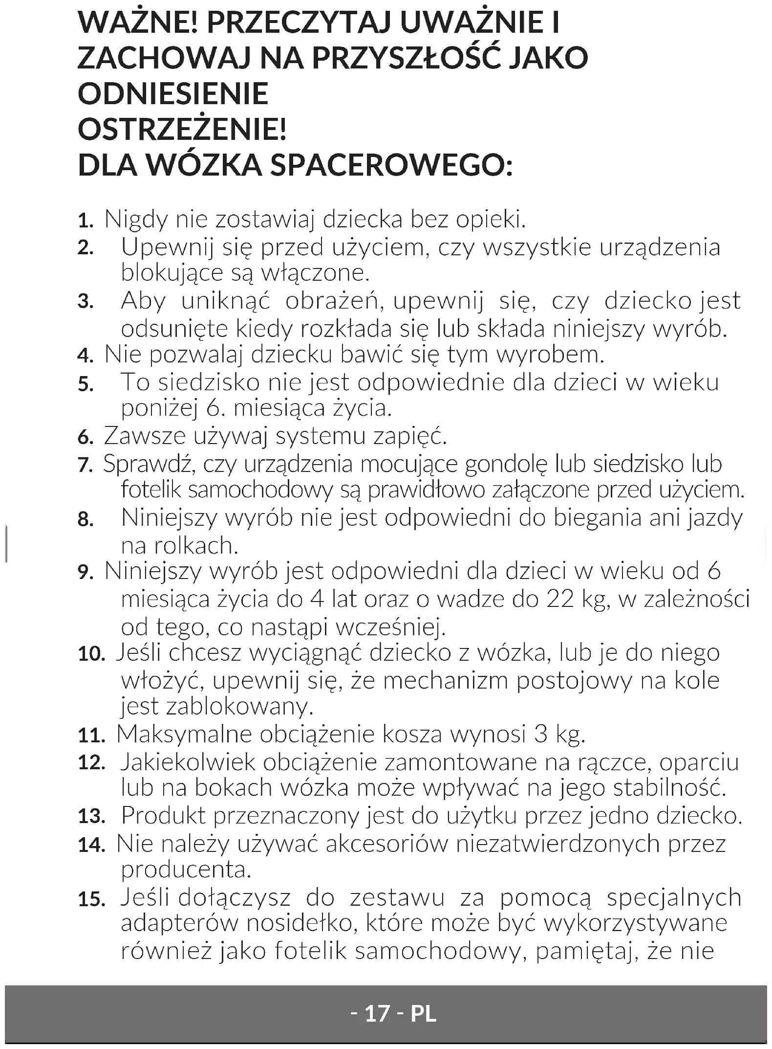 Jeśli dołączysz do zestawu za pomocą specjalnych adapterów nosidełko, które może być wykorzystywane również jako fotelik samochodowy, pamiętaj, że nie‑ 18 ‑PL zastępuje ono łóżeczka. Jeśli dziecko potrzebuje snu, umieść je w odpowiednim łóżeczku.