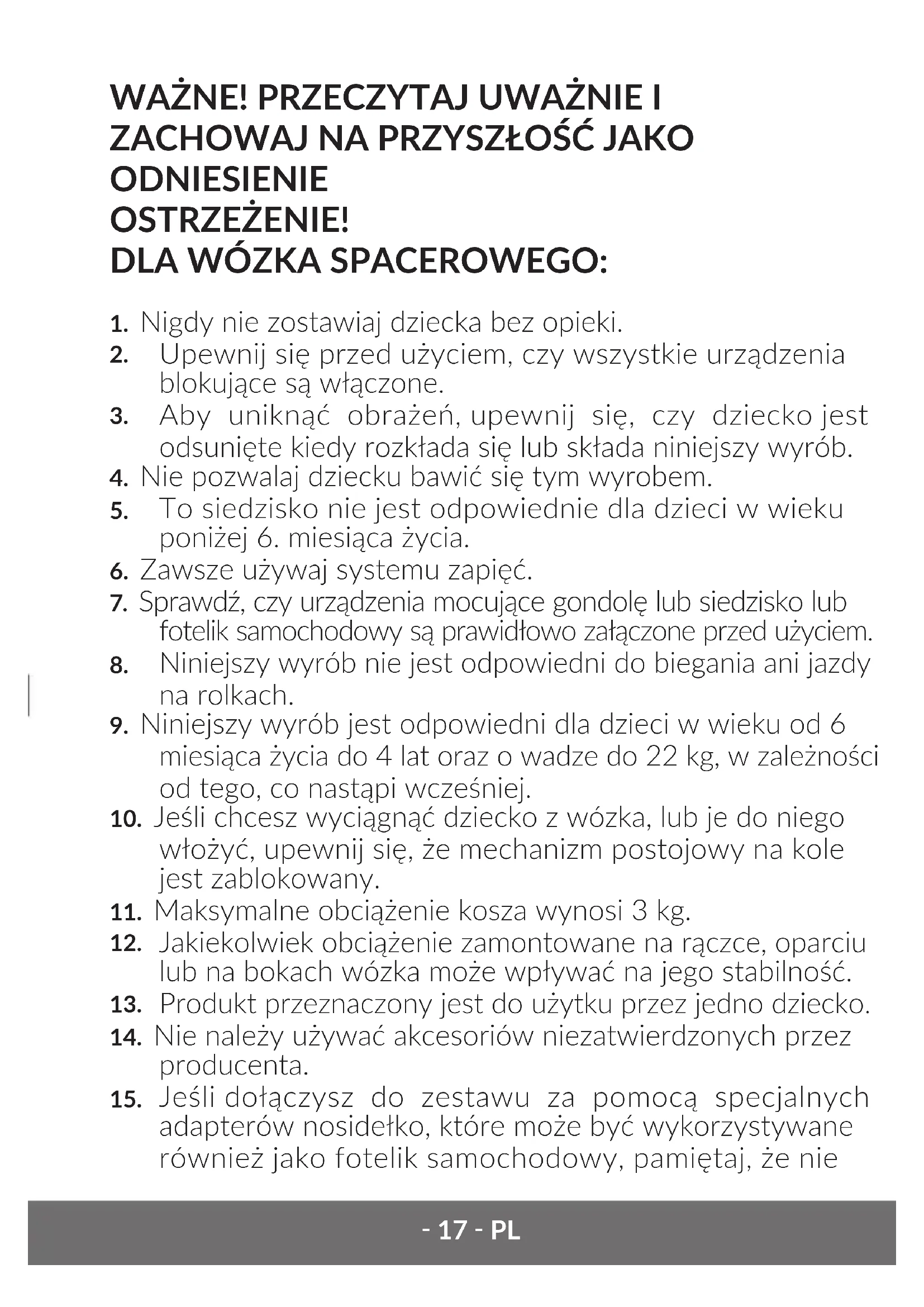 Jeśli dołączysz do zestawu za pomocą specjalnych adapterów nosidełko, które może być wykorzystywane również jako fotelik samochodowy, pamiętaj, że nie‑ 18 ‑PL zastępuje ono łóżeczka. Jeśli dziecko potrzebuje snu, umieść je w odpowiednim łóżeczku.