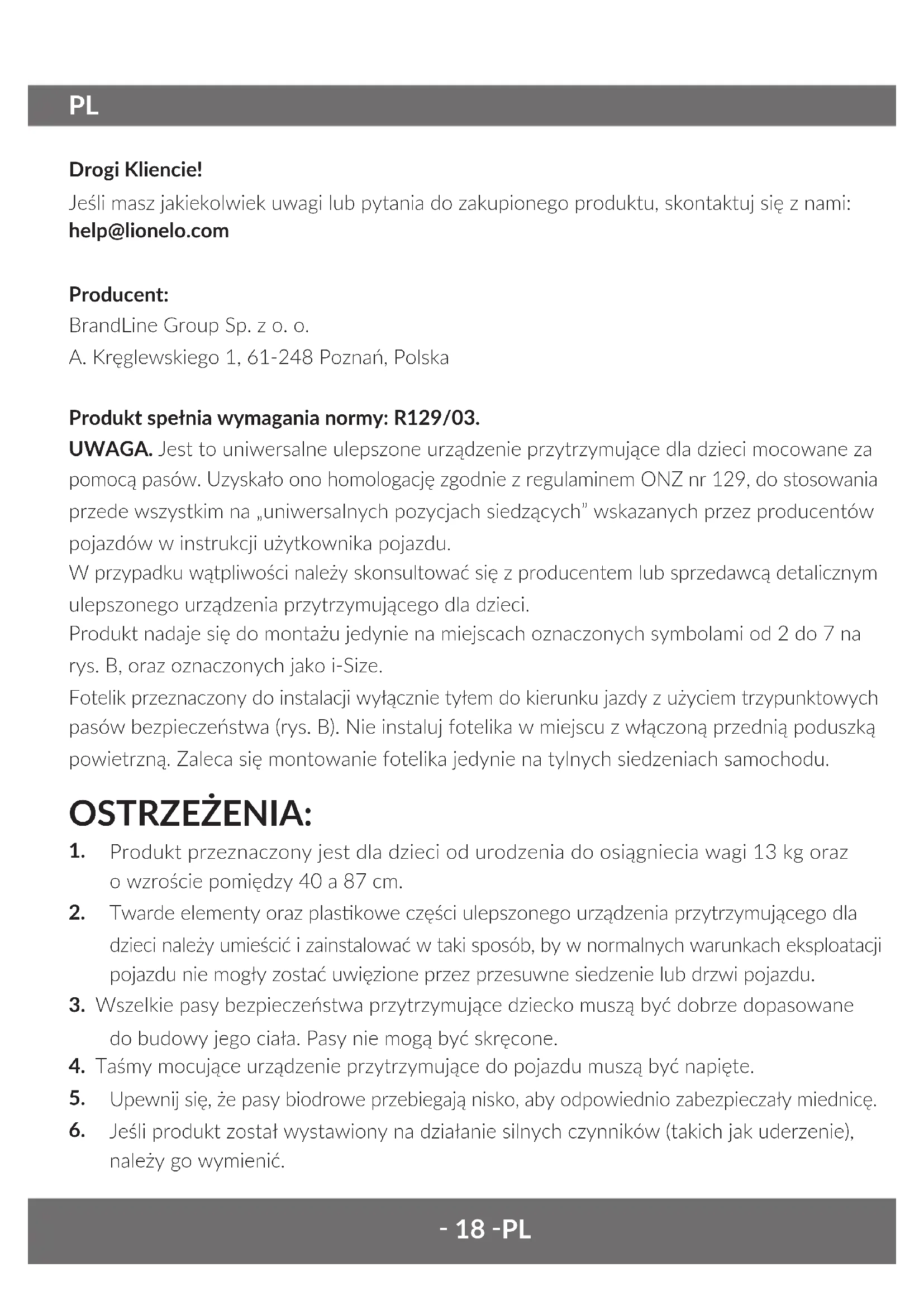 Drogi Kliencie! Jeśli masz jakiekolwiek uwagi lub pytania do zakupionego produktu, skontaktuj się z nami: help@lionelo.com Producent: BrandLine Group Sp. z o. o. A. Kręglewskiego 1, 61-248 Poznań, Polska Produkt spełnia wymagania normy: R129/03. UWAGA. Jest to uniwersalne ulepszone urządzenie przytrzymujące dla dzieci mocowane za pomocą pasów. Uzyskało ono homologację zgodnie z regulaminem ONZ nr 129, do stosowania przede wszystkim na „uniwersalnych pozycjach siedzących” wskazanych przez producentów pojazdów w instrukcji użytkownika pojazdu. W przypadku wątpliwości należy skonsultować się z producentem lub sprzedawcą detalicznym ulepszonego urządzenia przytrzymującego dla dzieci. Produkt nadaje się do montażu jedynie na miejscach oznaczonych symbolami od 2 do 7 na rys. B, oraz oznaczonych jako i-Size. Fotelik przeznaczony do instalacji wyłącznie tyłem do kierunku jazdy z użyciem trzypunktowych pasów bezpieczeństwa (rys. B). Nie instaluj fotelika w miejscu z włączoną przednią poduszką powietrzną. Zaleca się montowanie fotelika jedynie na tylnych siedzeniach samochodu. OSTRZEŻENIA:
