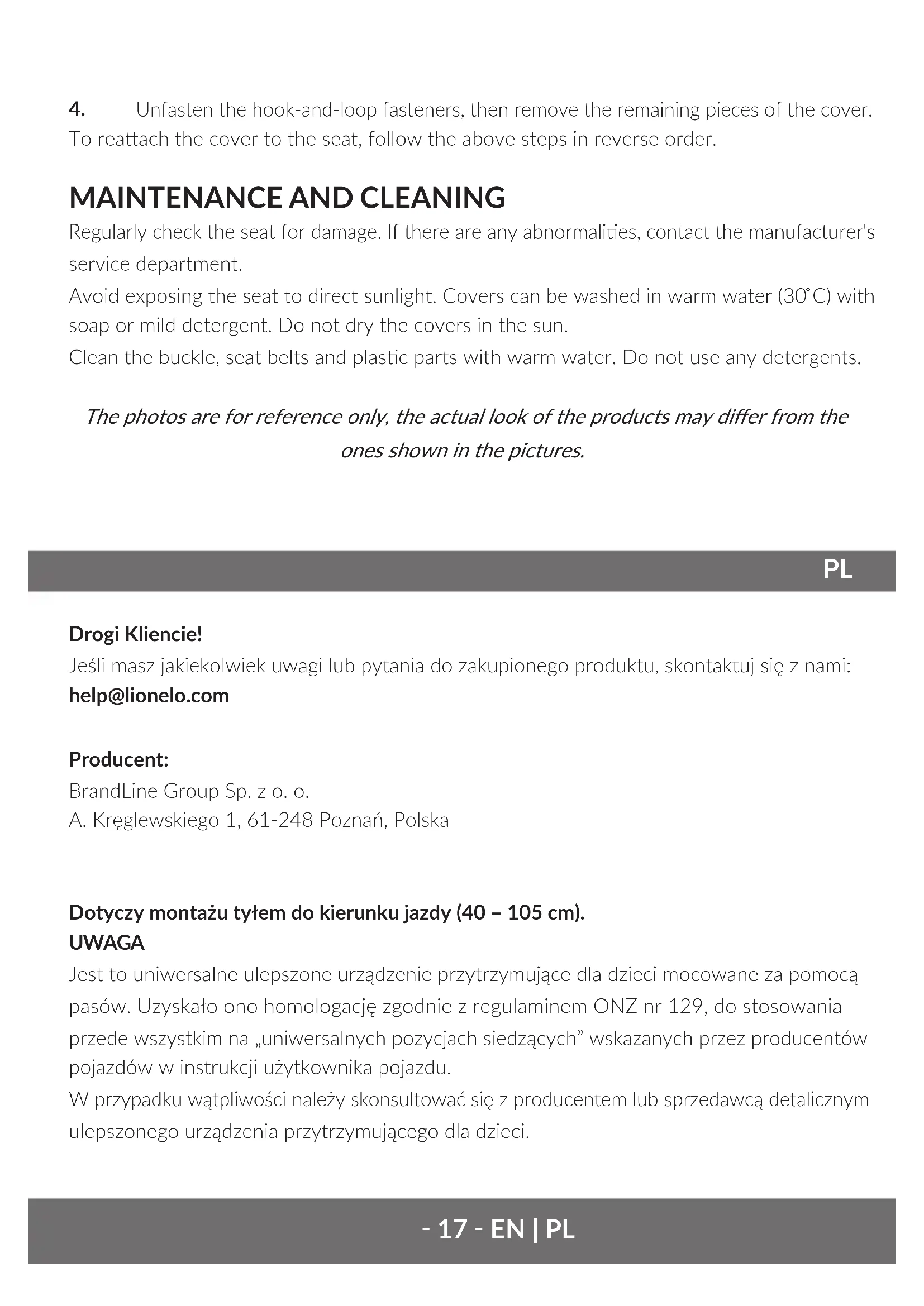 Drogi Kliencie! Jeśli masz jakiekolwiek uwagi lub pytania do zakupionego produktu, skontaktuj się z nami: help@lionelo.com Producent: BrandLine Group Sp. z o. o. A. Kręglewskiego 1, 61-248 Poznań, Polska Dotyczy montażu tyłem do kierunku jazdy (40 – 105 cm). UWAGA Jest to uniwersalne ulepszone urządzenie przytrzymujące dla dzieci mocowane za pomocą pasów. Uzyskało ono homologację zgodnie z regulaminem ONZ nr 129, do stosowania przede wszystkim na „uniwersalnych pozycjach siedzących” wskazanych przez producentów pojazdów w instrukcji użytkownika pojazdu. W przypadku wątpliwości należy skonsultować się z producentem lub sprzedawcą detalicznym ulepszonego urządzenia przytrzymującego dla dzieci.‑ 18 ‑PL Dotyczy montażu przodem do kierunku jazdy (100 – 150 cm). UWAGA To jest ulepszone urządzenie przytrzymujące dla dzieci typu „siedzenie podwyższające kategorii i-Size”. Uzyskało ono homologację zgodnie z regulaminem ONZ nr 129, do stosowania przede wszystkim na pozycjach siedzących dla „i-Size” wskazanych przez producentów pojazdów w instrukcji użytkownika pojazdu. W przypadku wątpliwości należy skonsultować się z producentem lub sprzedawcą detalicznym ulepszonego urządzenia przytrzymującego dla dzieci. Produkt nadaje się do montażu jedynie na miejscach oznaczonych symbolem na rys. B. Produkt nadaje się do montażu na miejscu oznaczonym symbolem na rys. B. wyłącznie przodem do kierunku jazdy oraz z nieaktywną poduszką powietrzną. Zaleca się montowanie fotelika jedynie na tylnych siedzeniach samochodu. Fotelik nadaje się do montażu na miejscu oznaczonym symbolem na rys. B wyłącznie jeśli miejsce wyposażone jest w 3-punktowe pasy bezpieczeństwa (rys. C). OSTRZEŻENIA: