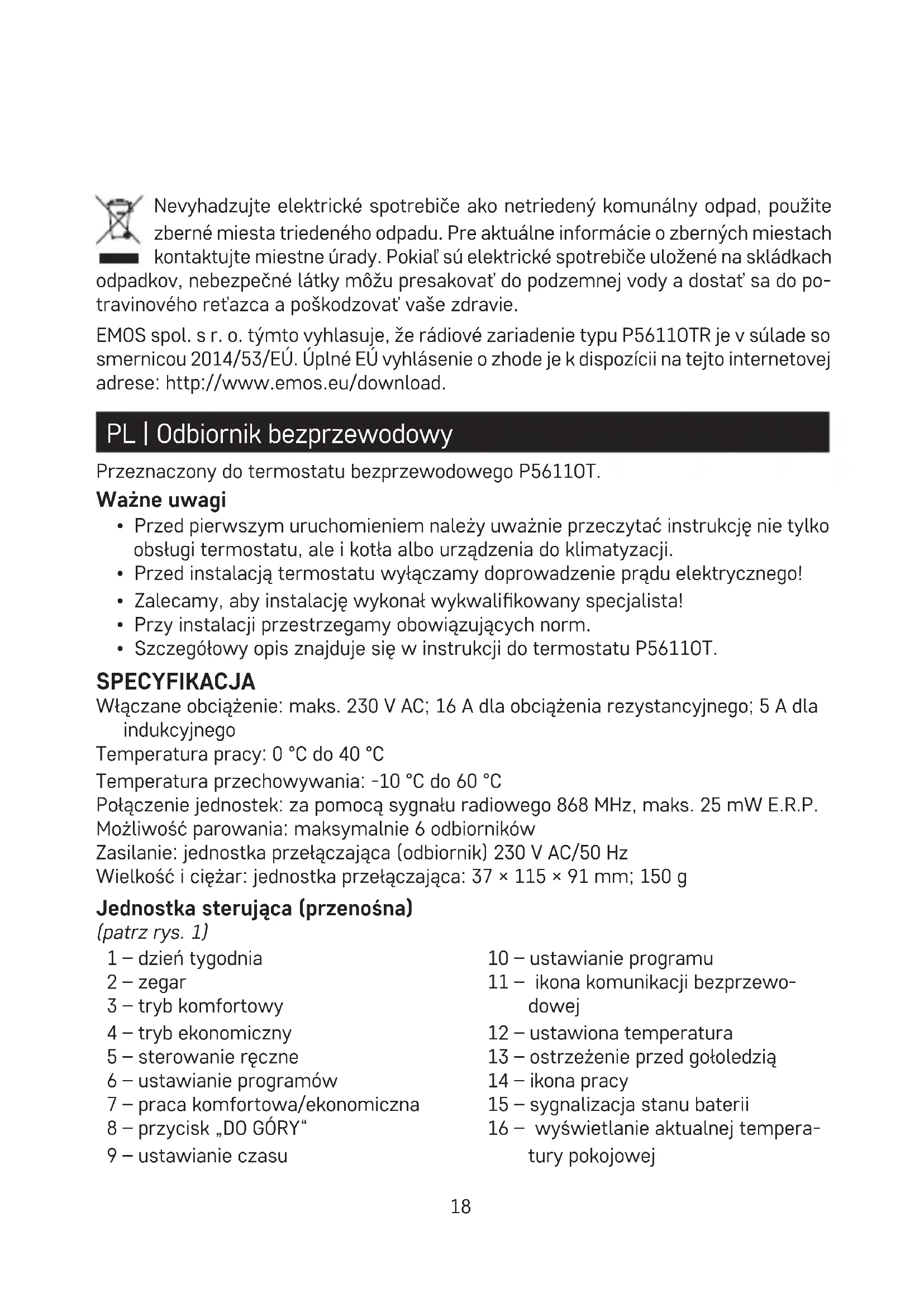 - To urządzenie nie jest przeznaczone do użytkowania przez osoby (w tym dzieci), którym brak predyspozycji zycznych, umysłowych albo mentalnych oraz brak wiedzy albo doświadczenia uniemożliwia bezpieczne korzystanie z tego wyrobu,23 jeżeli nie jest nad nimi sprawowany nadzór albo, jeżeli nie zostały poinstruowane, co do zasad korzystania z tego produktu przez osobę, która jest odpowiedzialna za ich bezpieczeństwo. Konieczne jest zapewnienie takiej opieki nad dziećmi, żeby nie mogły się bawić tym wyrobem. Zgodnie z przepisami Ustawy o ZSEiE zabronione jest umieszczanie łącznie z innymi odpadami zużytego sprzętu oznakowanego symbolem przekreślonego kosza. Użytkownik, chcąc pozbyć się sprzętu elektronicznego i elektrycznego, jest zobowiązany do oddania go do punktu zbierania zużytego sprzętu. W sprzęcie nie znajdują się składniki niebezpieczne, które mają szczególnie negatywny wpływ na środowisko i zdrowie ludzi. EMOS spol. s r. o. niniejszym oświadcza, że typ urządzenia radiowego P5611OTR jest zgodny z dyrektywą 2014/53/UE. Pełny tekst deklaracji zgodności UE jest dostępny pod następującym adresem internetowym: http://www.emos.eu/download. HU | Vezeték nélküli vevő A P5611OT vezeték nélküli termosztáthoz használható. Fontos gyelmeztetés
