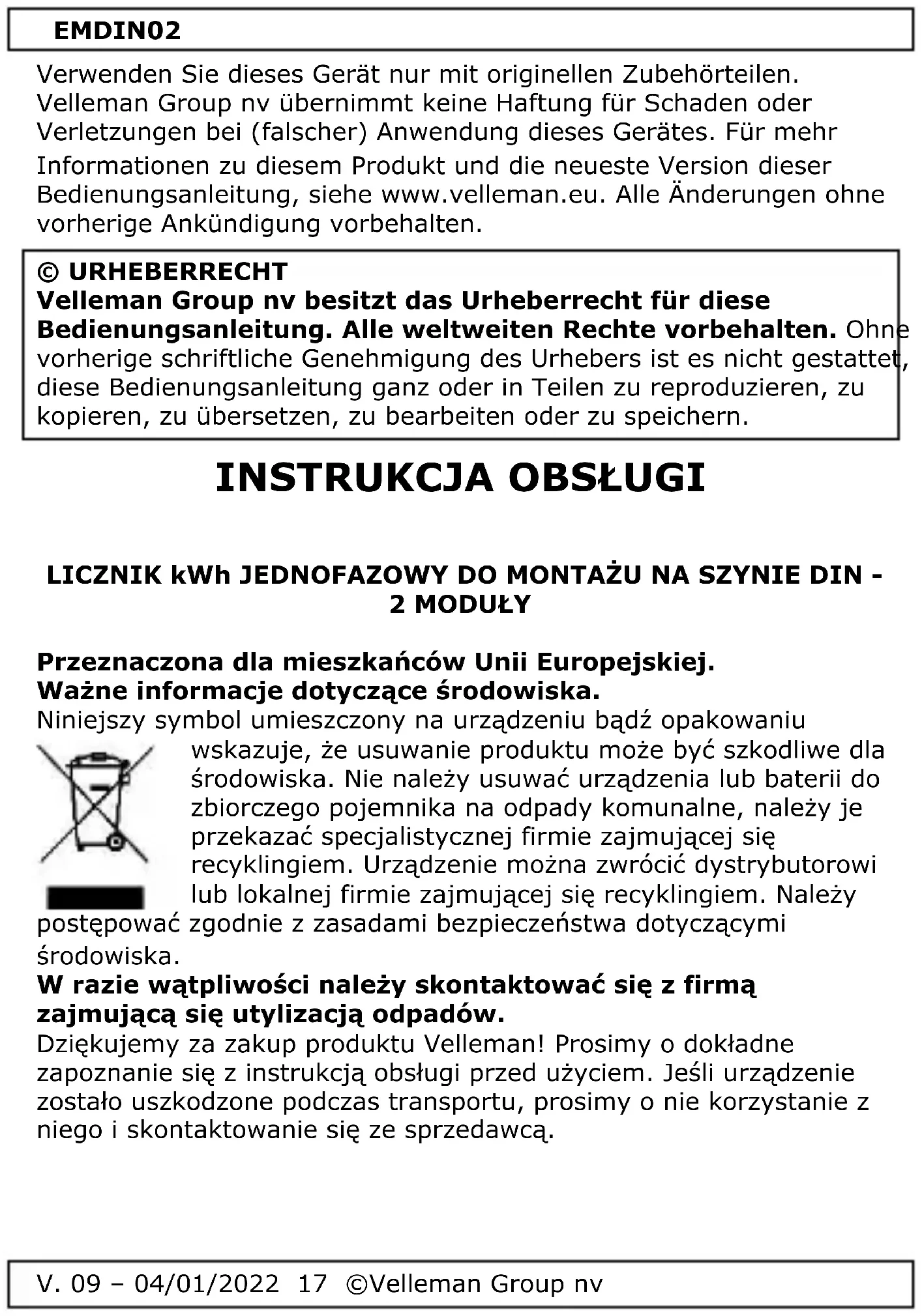 LICZNIK kWh JEDNOFAZOWY DO MONTAŻU NA SZYNIE DIN - 2 MODUŁY Przeznaczona dla mieszkańców Unii Europejskiej. Ważne informacje dotyczące środowiska. Niniejszy symbol umieszczony na urządzeniu bądź opakowaniu wskazuje, że usuwanie produktu może być szkodliwe dla środowiska. Nie należy usuwać urządzenia lub baterii do zbiorczego pojemnika na odpady komunalne, należy je przekazać specjalistycznej firmie zajmującej się recyklingiem. Urządzenie można zwrócić dystrybutorowi lub lokalnej firmie zajmującej się recyklingiem. Należy postępować zgodnie z zasadami bezpieczeństwa dotyczącymi środowiska. W razie wątpliwości należy skontaktować się z firmą zajmującą się utylizacją odpadów. Dziękujemy za zakup produktu Velleman! Prosimy o dokładne zapoznanie się z instrukcją obsługi przed użyciem. Jeśli urządzenie zostało uszkodzone podczas transportu, prosimy o nie korzystanie z niego i skontaktowanie się ze sprzedawcą.EMDIN02