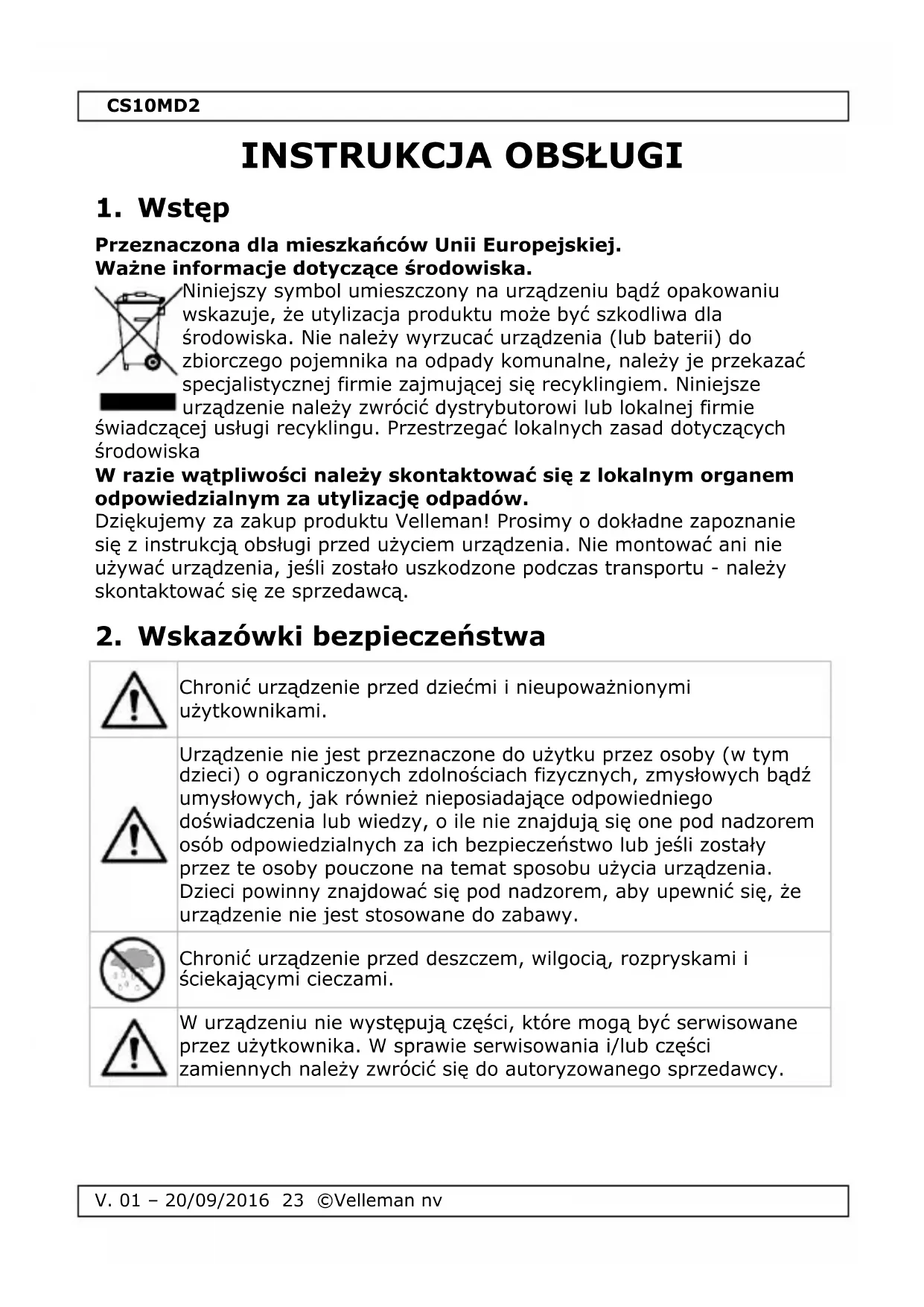 INSTRUKCJA OBSŁUGI CS10MD2 VELLEMAN
