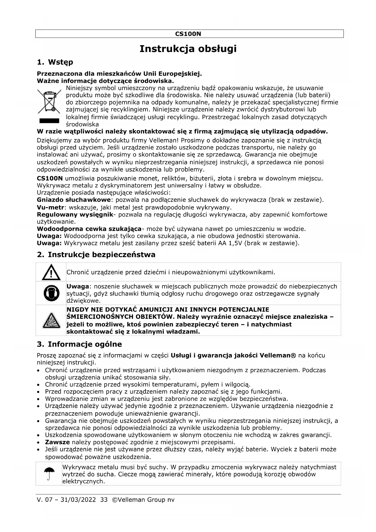 Niniejsza instrukcja obsługi jest chroniona prawem autorskim. Instrukcja jest własnością firmy Velleman Group nv i jest chroniona prawami autorskimi. Wszystkie prawa są zastrzeżone na całym świecie. Żadna część niniejszej instrukcji nie może być kopiowana, przedrukowywana, tłumaczona lub przenoszona na nośniki elektroniczne lub w inny sposób, bez uprzedniej pisemnej zgody właściciela praw autorskich.CS100N