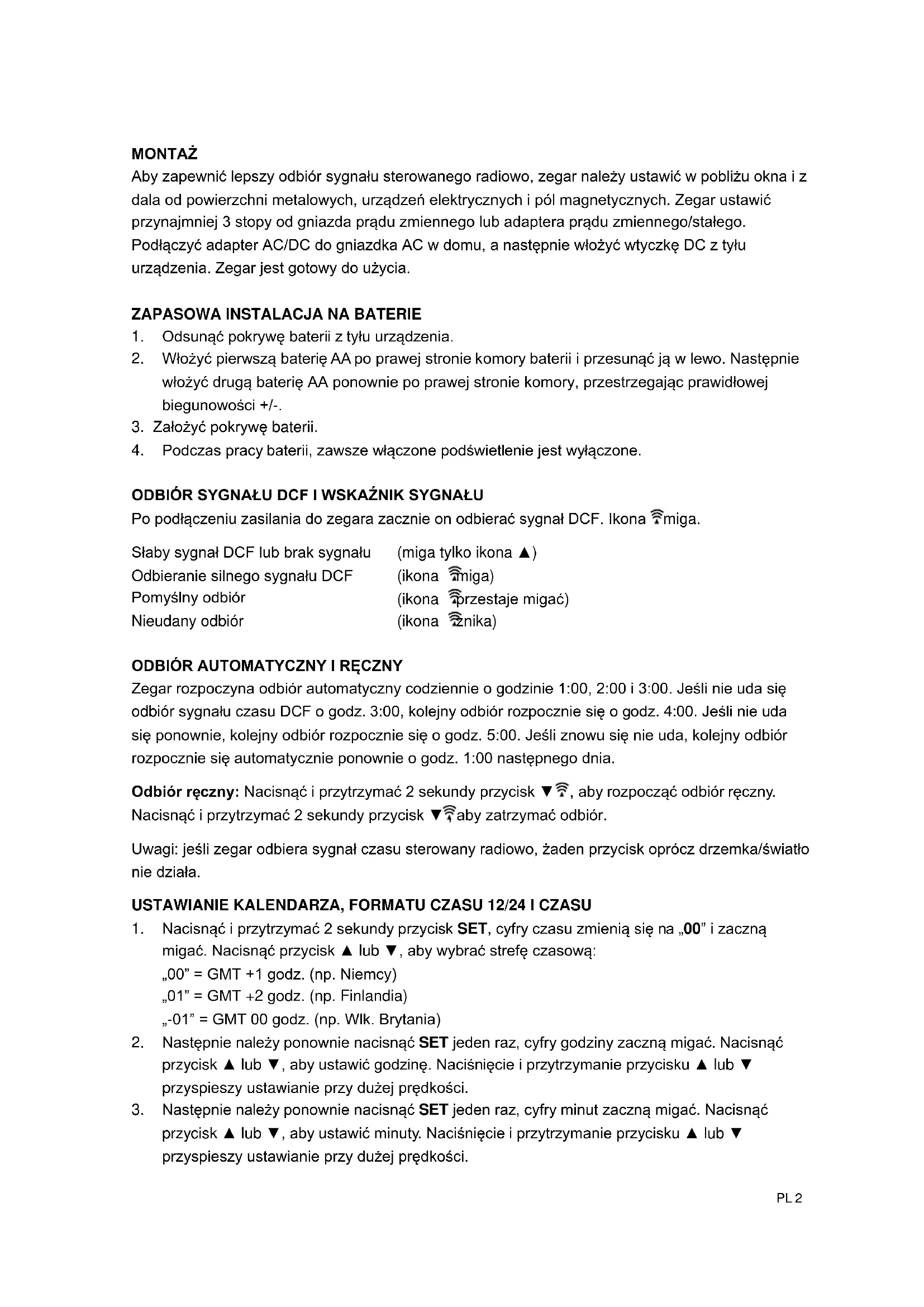 ODBIÓR SYGNAŁU DCF I WSKAŹNIK SYGNAŁU Po podłączeniu zasilania do zegara zacznie on odbierać sygnał DCF. Ikona miga. Słaby sygnał DCF lub brak sygnału (miga tylko ikona ▲) Odbieranie silnego sygnału DCF (ikona miga) Pomyślny odbiór (ikona przestaje migać) Nieudany odbiór (ikona znika)