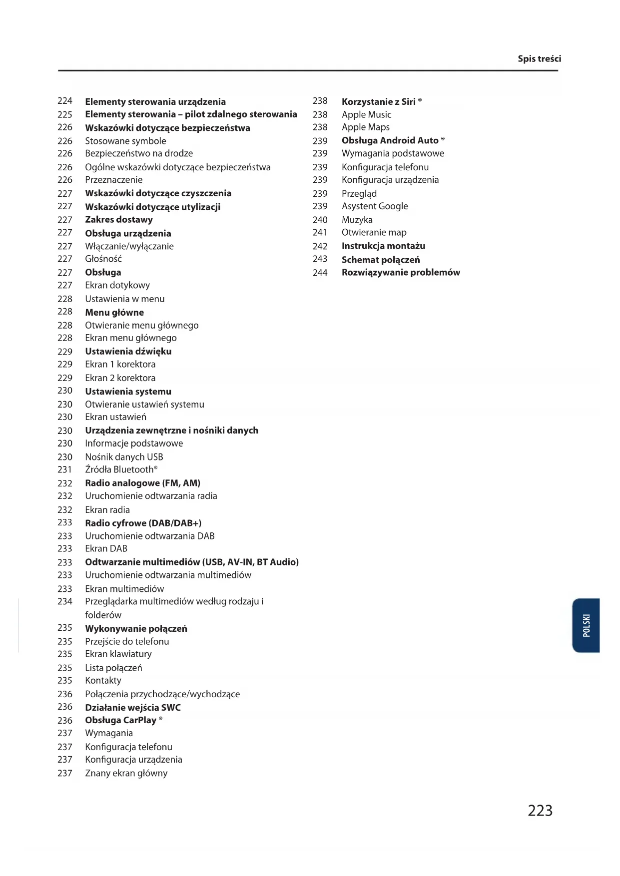 Korzystanie z Siri ® Apple Music Apple Maps Obsługa Android Auto ® Wymagania podstawowe Konguracja telefonu Konguracja urządzenia Przegląd Asystent Google Muzyka Otwieranie map Instrukcja montażu Schemat połączeń Rozwiązywanie problemów Spis treści POLSKI 223Elementy sterowania urządzenia