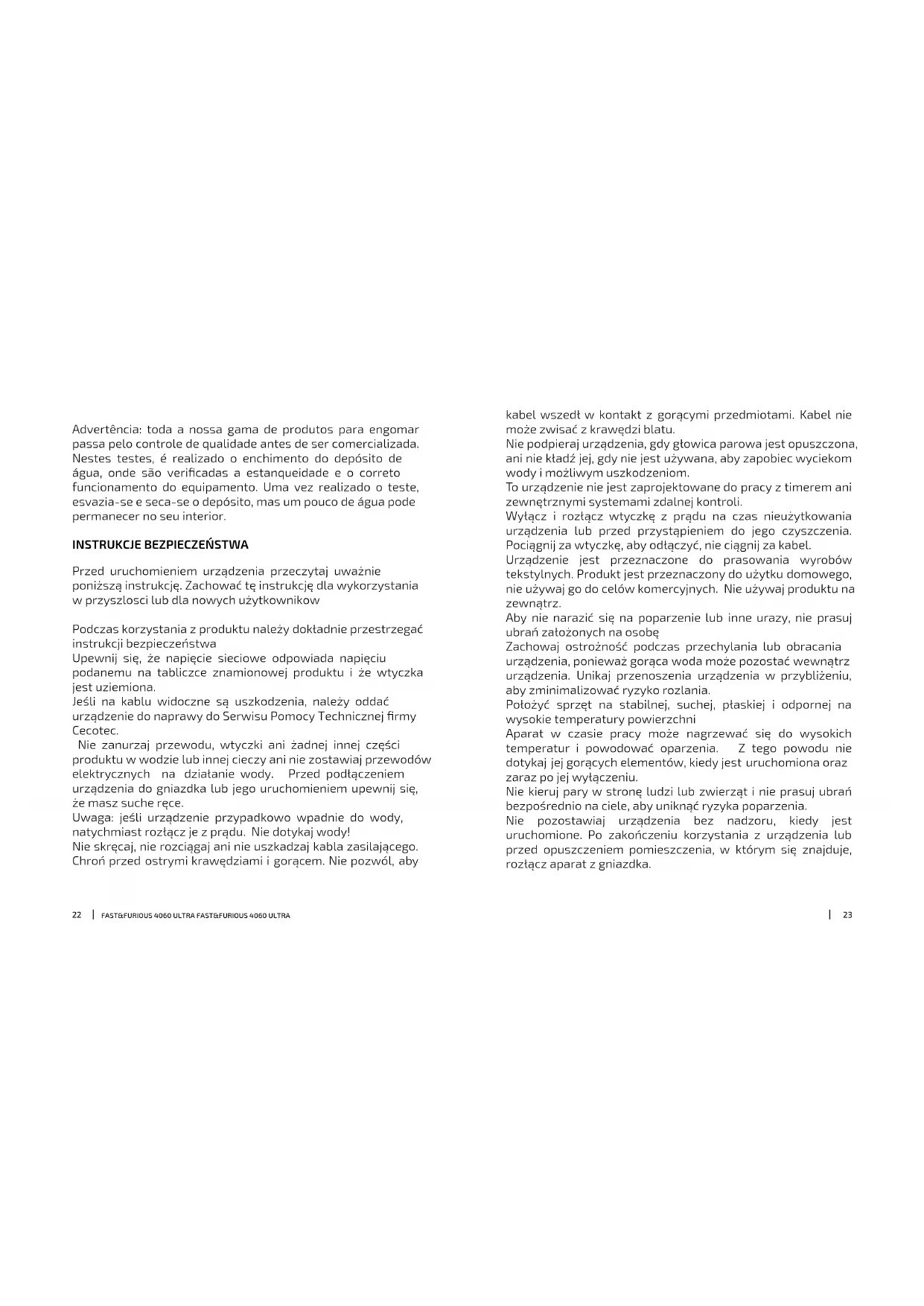 Przed uruchomieniem urządzenia przeczytaj uważnie poniższą instrukcję. Zachować tę instrukcję dla wykorzystania w przyszlosci lub dla nowych użytkownikow Podczas korzystania z produktu należy dokładnie przestrzegać instrukcji bezpieczeństwa Upewnij się, że napięcie sieciowe odpowiada napięciu podanemu na tabliczce znamionowej produktu i że wtyczka jest uziemiona. Jeśli na kablu widoczne są uszkodzenia, należy oddać urządzenie do naprawy do Serwisu Pomocy Technicznej rmy Cecotec. Nie zanurzaj przewodu, wtyczki ani żadnej innej części produktu w wodzie lub innej cieczy ani nie zostawiaj przewodów elektrycznych na działanie wody. Przed podłączeniem urządzenia do gniazdka lub jego uruchomieniem upewnij się, że masz suche ręce. Uwaga: jeśli urządzenie przypadkowo wpadnie do wody, natychmiast rozłącz je z prądu. Nie dotykaj wody! Nie skręcaj, nie rozciągaj ani nie uszkadzaj kabla zasilającego. Chroń przed ostrymi krawędziami i gorącem. Nie pozwól, aby kabel wszedł w kontakt z gorącymi przedmiotami. Kabel nie może zwisać z krawędzi blatu. Nie podpieraj urządzenia, gdy głowica parowa jest opuszczona, ani nie kładź jej, gdy nie jest używana, aby zapobiec wyciekom wody i możliwym uszkodzeniom. To urządzenie nie jest zaprojektowane do pracy z timerem ani zewnętrznymi systemami zdalnej kontroli. Wyłącz i rozłącz wtyczkę z prądu na czas nieużytkowania urządzenia lub przed przystąpieniem do jego czyszczenia. Pociągnij za wtyczkę, aby odłączyć, nie ciągnij za kabel. Urządzenie jest przeznaczone do prasowania wyrobów tekstylnych. Produkt jest przeznaczony do użytku domowego, nie używaj go do celów komercyjnych. Nie używaj produktu na zewnątrz. Aby nie narazić się na poparzenie lub inne urazy, nie prasuj ubrań założonych na osobę Zachowaj ostrożność podczas przechylania lub obracania urządzenia, ponieważ gorąca woda może pozostać wewnątrz urządzenia. Unikaj przenoszenia urządzenia w przybliżeniu, aby zminimalizować ryzyko rozlania. Położyć sprzęt na stabilnej, suchej, płaskiej i odpornej na wysokie temperatury powierzchni Aparat w czasie pracy może nagrzewać się do wysokich temperatur i powodować oparzenia. Z tego powodu nie dotykaj jej gorących elementów, kiedy jest uruchomiona oraz zaraz po jej wyłączeniu. Nie kieruj pary w stronę ludzi lub zwierząt i nie prasuj ubrań bezpośrednio na ciele, aby uniknąć ryzyka poparzenia. Nie pozostawiaj urządzenia bez nadzoru, kiedy jest uruchomione. Po zakończeniu korzystania z urządzenia lub przed opuszczeniem pomieszczenia, w którym się znajduje, rozłącz aparat z gniazdka.2524