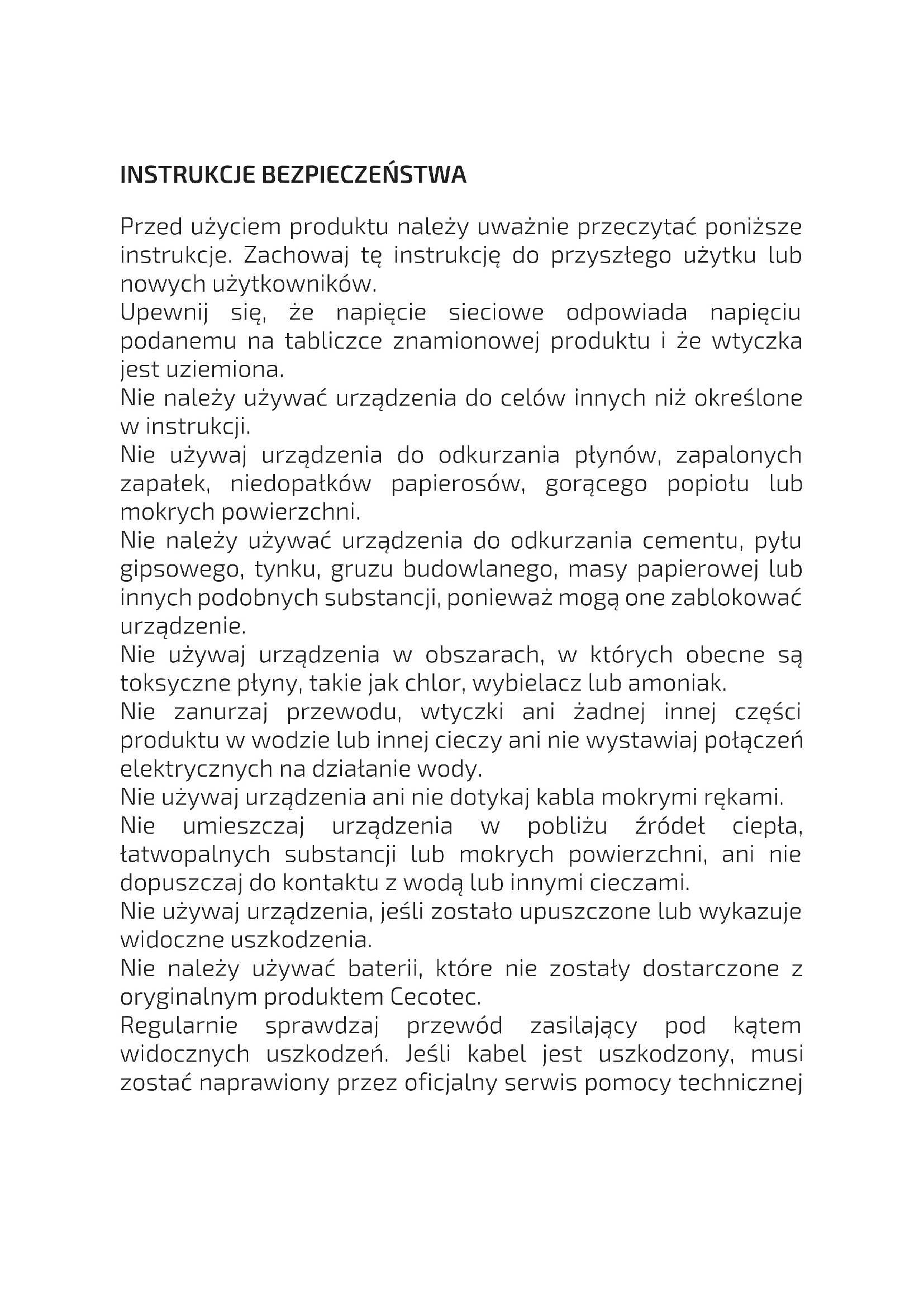 Problem Prawdopobna przyczyna Rozwiązanie Nie działa Nie ma baterii. Po dłuższym użytkowaniu wyczyść akcesoria, aby usunąć włosy i inne splątane przedmioty. Naładować baterię. Nie rozbieraj urządzenia. Skontaktuj się z serwisem technicznym Cecotec. Niska moc ssania. Zbiornik brudu jest pełny. Filtr o wysokiej wydajności jest zatkany, wyczyść go. Czyszczenie zbiornika brudu Wyjmij i wyczyść wysokowydajny filtr Wskaźnik nie świeci się podczas ładowania Akumulator nie jest prawidłowo zainstalowany. Skontaktuj się z serwisem technicznym Cecotec. Niewystarczający czas pracy po naładowaniu urządzenia. Nie był ładowany wystarczająco długo. Żywotność baterii jest wyczerpana. Naładuj go w pełni. Skontaktuj się z serwisem technicznym Cecotec. Wydostaje się brud Zbiornik brudu jest zablokowany. Wyczyść zbiornik na brud i filtr i uruchom ponownie urządzenie.