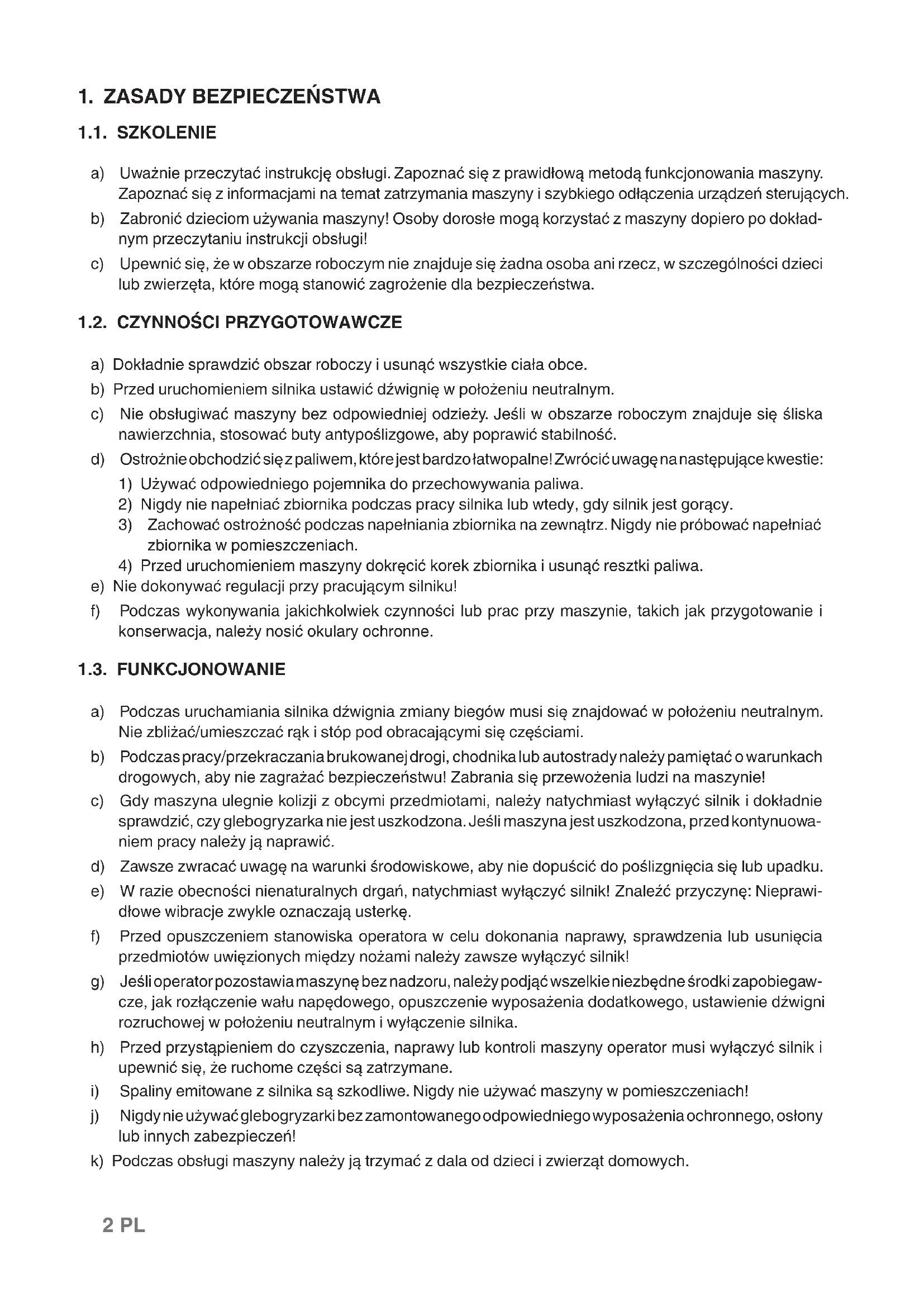e) Nie dokonywać regulacji przy pracującym silniku! f) Podczas wykonywania jakichkolwiek czynności lub prac przy maszynie, takich jak przygotowanie i konserwacja, należy nosić okulary ochronne. 1.3. FUNKCJONOWANIE a) Podczas uruchamiania silnika dźwignia zmiany biegów musi się znajdować w położeniu neutralnym. Nie zbliżać/umieszczać rąk i stóp pod obracającymi się częściami. b) Podczas pracy/przekraczania brukowanej drogi, chodnika lub autostrady należy pamiętać o warunkach drogowych, aby nie zagrażać bezpieczeństwu! Zabrania się przewożenia ludzi na maszynie! c) Gdy maszyna ulegnie kolizji z obcymi przedmiotami, należy natychmiast wyłączyć silnik i dokładnie sprawdzić, czy glebogryzarka nie jest uszkodzona. Jeśli maszyna jest uszkodzona, przed kontynuowa- niem pracy należy ją naprawić. d) Zawsze zwracać uwagę na warunki środowiskowe, aby nie dopuścić do poślizgnięcia się lub upadku. e) W razie obecności nienaturalnych drgań, natychmiast wyłączyć silnik! Znaleźć przyczynę: Nieprawi- dłowe wibracje zwykle oznaczają usterkę. f) Przed opuszczeniem stanowiska operatora w celu dokonania naprawy, sprawdzenia lub usunięcia przedmiotów uwięzionych między nożami należy zawsze wyłączyć silnik! g) Jeśli operator pozostawia maszynę bez nadzoru, należy podjąć wszelkie niezbędne środki zapobiegaw- cze, jak rozłączenie wału napędowego, opuszczenie wyposażenia dodatkowego, ustawienie dźwigni rozruchowej w położeniu neutralnym i wyłączenie silnika. h) Przed przystąpieniem do czyszczenia, naprawy lub kontroli maszyny operator musi wyłączyć silnik i upewnić się, że ruchome części są zatrzymane.
