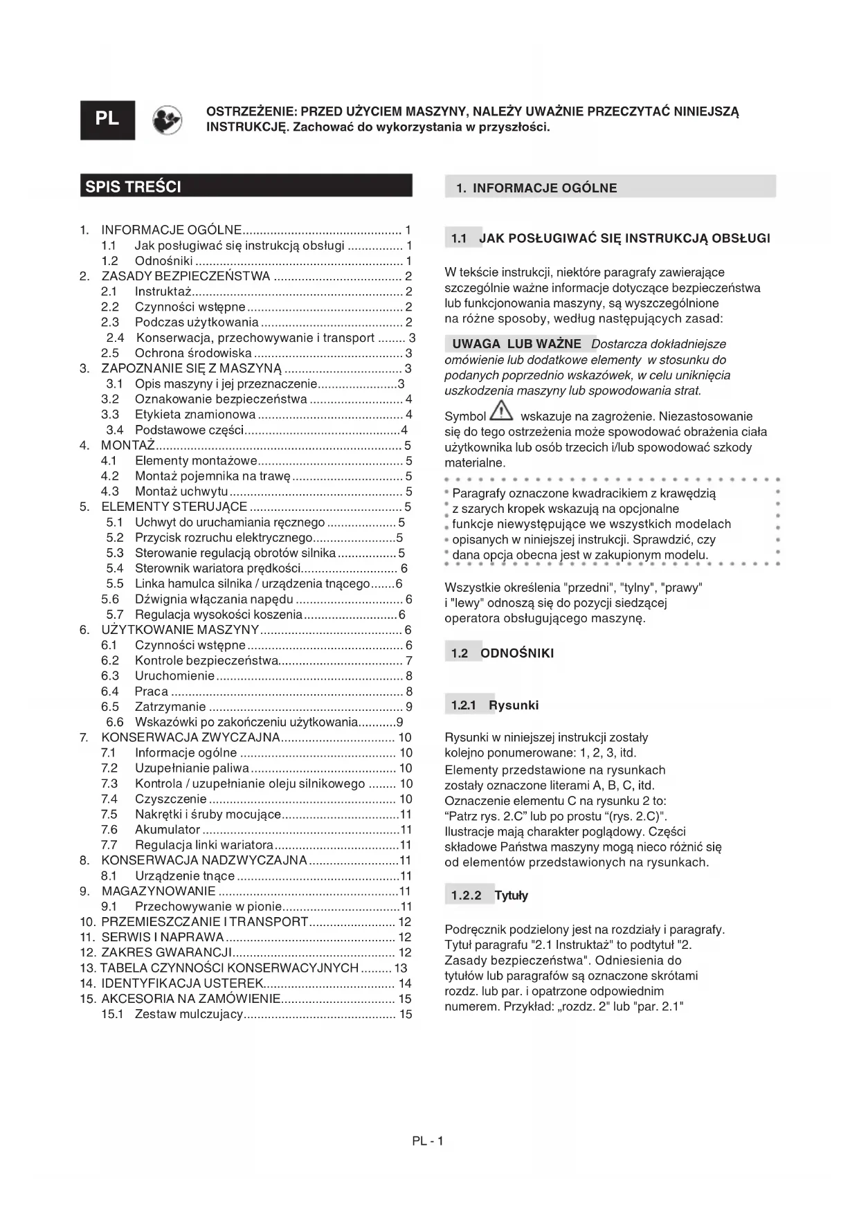 Niniejsza instrukcja zawiera wszelkie niezbędne informacje potrzebne do właściwego posługiwania się maszyną i poprawnego wykonania podstawowych czynności z zakresu konserwacji dokonywanych przez samego użytkownika. Wszystkie czynności regulacyjne i konserwacyjne nieopisane w niniejszej instrukcji powinny być wykonane przez Państwa sprzedawcę lub w autoryzowanym punkcie serwisowym, które dysponuje wiedzą i sprzętem umożliwiającym właściwe wykonanie czynności konserwacyjnych przy zapewnieniu odpowiedniego stopnia bezpieczeństwa i zachowaniu pierwotnych cech urządzenia. Czynności wykonane przez nieodpowiednie serwisy lub osoby niekompetentne powodują utratę udzielonychPL - 13 gwarancji oraz zwalniają producenta z jakichkolwiek zobowiązań i z odpowiedzialności prawnej.