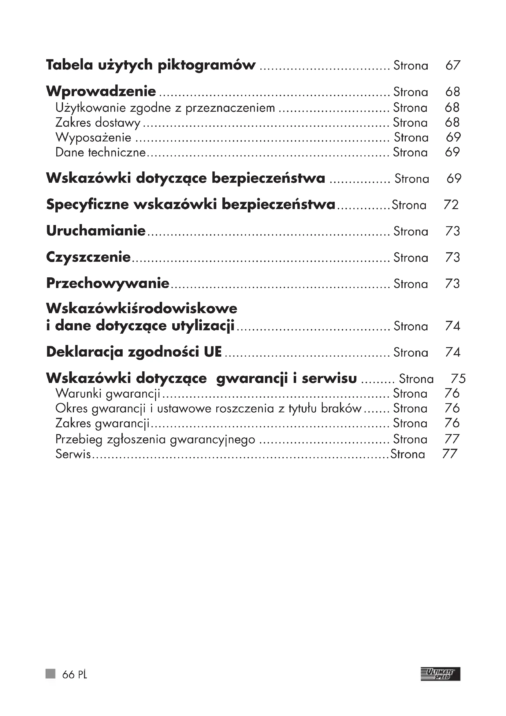 Tabela użytych piktogramów .................................. Strona 67 Wprowadzenie ............................................................ Strona 68 Użytkowanie zgodne zprzeznaczeniem ............................. Strona 68 Zakres dostawy ................................................................ Strona 68 Wyposażenie .................................................................. Strona 69 Dane techniczne ............................................................... Strona 69 Wskazówki dotyczące bezpieczeństwa ................ Strona 69 Specyficzne wskazówki bezpieczeństwa .............. Strona 72 Uruchamianie ............................................................... Strona 73 Czyszczenie ................................................................... Strona 73 Przechowywanie ......................................................... Strona 73 Wskazówki środowiskowe i dane dotyczące utylizacji ........................................ Strona 74 Deklaracja zgodności UE ........................................... Strona 74 Wskazówki dotyczące gwarancji iserwisu ......... Strona 75 Warunki gwarancji ........................................................... Strona 76 Okres gwarancji iustawowe roszczenia ztytułu braków ....... Strona 76 Zakres gwarancji .............................................................. Strona 76 Przebieg zgłoszenia gwarancyjnego .................................. Strona 77 Serwis ............................................................................. Strona 7767PL Tabela użytych piktogramów Przeczytać instrukcję obsługi!
