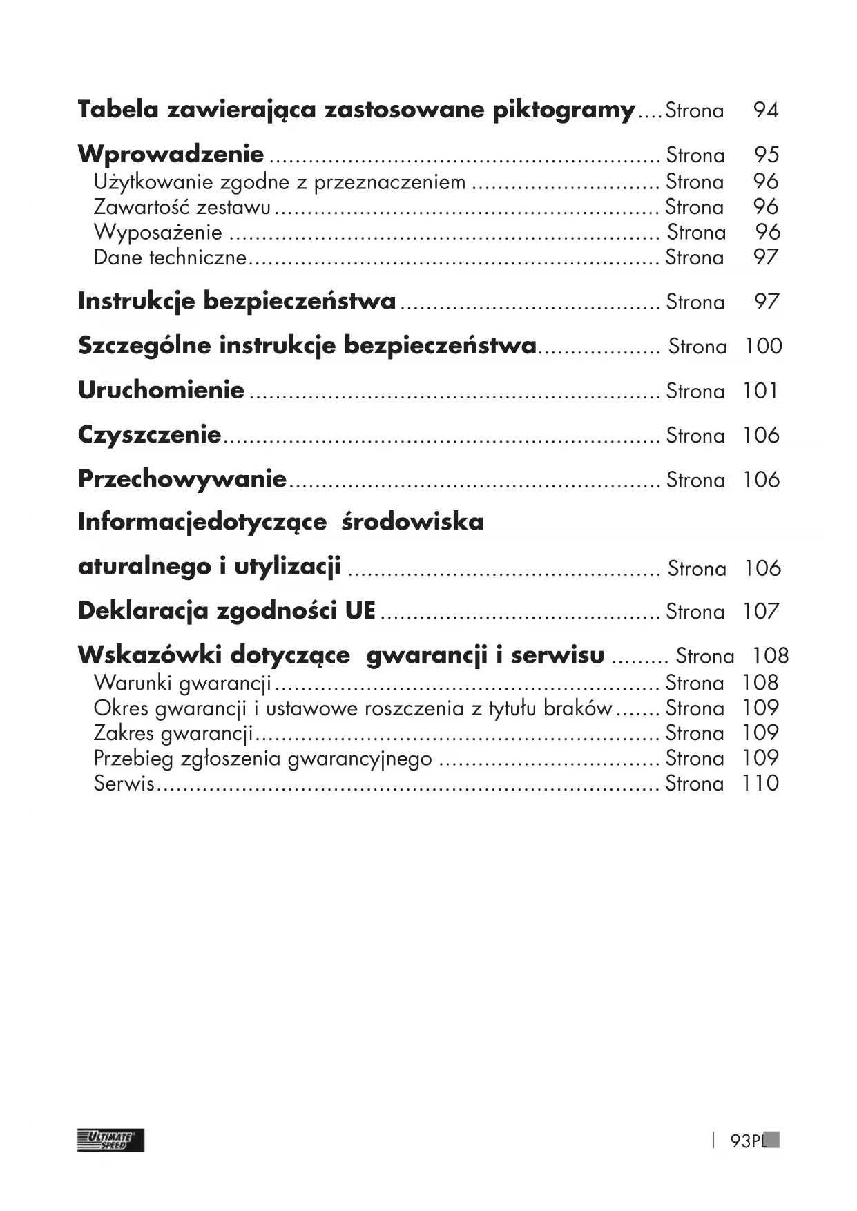 Tabela zawierająca zastosowane piktogramy .... Strona 94 Wprowadzenie ............................................................ Strona 95 Użytkowanie zgodne zprzeznaczeniem ............................. Strona 96 Zawartość zestawu ........................................................... Strona 96 Wyposażenie .................................................................. Strona 96 Dane techniczne ............................................................... Strona 97 Instrukcje bezpieczeństwa ........................................ Strona 97 Szczególne instrukcje bezpieczeństwa................... Strona 100 Uruchomienie ............................................................... Strona 101 Czyszczenie ................................................................... Strona 106 Przechowywanie ......................................................... Strona 106 Informacje dotyczące środowiska aturalnego i utylizacji ................................................ Strona 106 Deklaracja zgodności UE ........................................... Strona 107 Wskazówki dotyczące gwarancji iserwisu ......... Strona 108 Warunki gwarancji ........................................................... Strona 108 Okres gwarancji iustawowe roszczenia ztytułu braków ....... Strona 109 Zakres gwarancji .............................................................. Strona 109 Przebieg zgłoszenia gwarancyjnego .................................. Strona 109 Serwis ............................................................................. Strona 11094 PL Tabela zawierająca zastosowane piktogramy Należy zapoznać się z instrukcją obsługi! Nie nadaje się do stoso- wania w systemach IT Należy przestrzegać ostrzeżeń i instrukcji bezpieczeństwa! Ostrzeżenie przed porażeniem prądem elektrycznym! Śmiertelne niebezpieczeństwo! Wskazówka 50 Hz Częstotliwość 50herców Baterie należy utylizować w sposób przyjazny dla środowiska! Na mocy obowiązu- jących przepisów tak oznakowane urządzenia muszą być oddzielone od niesegregowanych odpadów komunalnych. Zabrania się ich utylizacji razem z odpadami komunalnymi.
