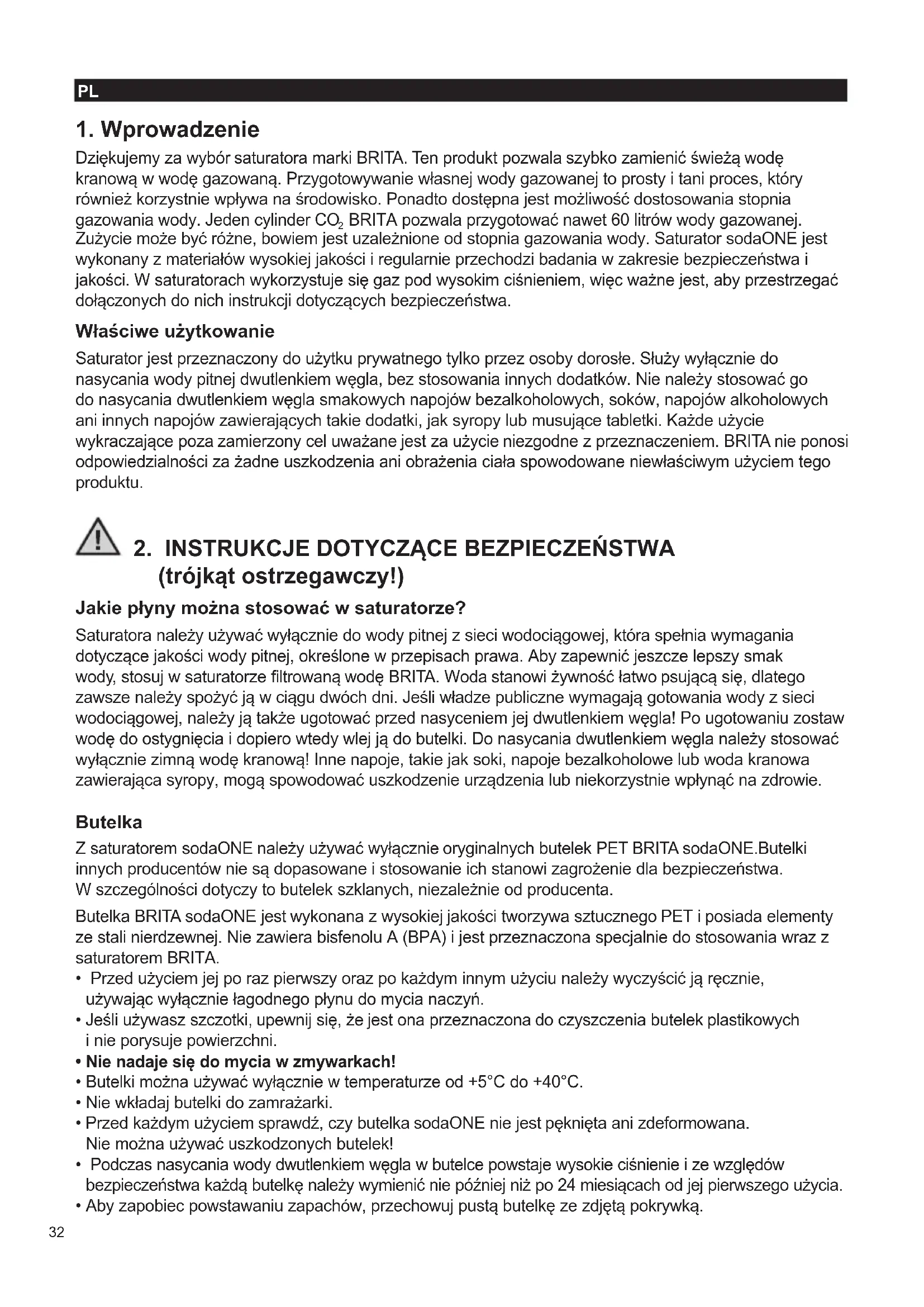 (trójkąt ostrzegawczy!) Jakie płyny można stosować w saturatorze? Saturatora należy używać wyłącznie do wody pitnej z sieci wodociągowej, która spełnia wymagania dotyczące jakości wody pitnej, określone w przepisach prawa. Aby zapewnić jeszcze lepszy smak wody, stosuj w saturatorze ltrowaną wodę BRITA. Woda stanowi żywność łatwo psującą się, dlatego zawsze należy spożyć ją w ciągu dwóch dni. Jeśli władze publiczne wymagają gotowania wody z sieci wodociągowej, należy ją także ugotować przed nasyceniem jej dwutlenkiem węgla! Po ugotowaniu zostaw wodę do ostygnięcia i dopiero wtedy wlej ją do butelki. Do nasycania dwutlenkiem węgla należy stosować wyłącznie zimną wodę kranową! Inne napoje, takie jak soki, napoje bezalkoholowe lub woda kranowa zawierająca syropy, mogą spowodować uszkodzenie urządzenia lub niekorzystnie wpłynąć na zdrowie. Butelka Z saturatorem sodaONE należy używać wyłącznie oryginalnych butelek PET BRITA sodaONE.Butelki innych producentów nie są dopasowane i stosowanie ich stanowi zagrożenie dla bezpieczeństwa. W szczególności dotyczy to butelek szklanych, niezależnie od producenta. Butelka BRITA sodaONE jest wykonana z wysokiej jakości tworzywa sztucznego PET i posiada elementy ze stali nierdzewnej. Nie zawiera bisfenolu A (BPA) i jest przeznaczona specjalnie do stosowania wraz z saturatorem BRITA.