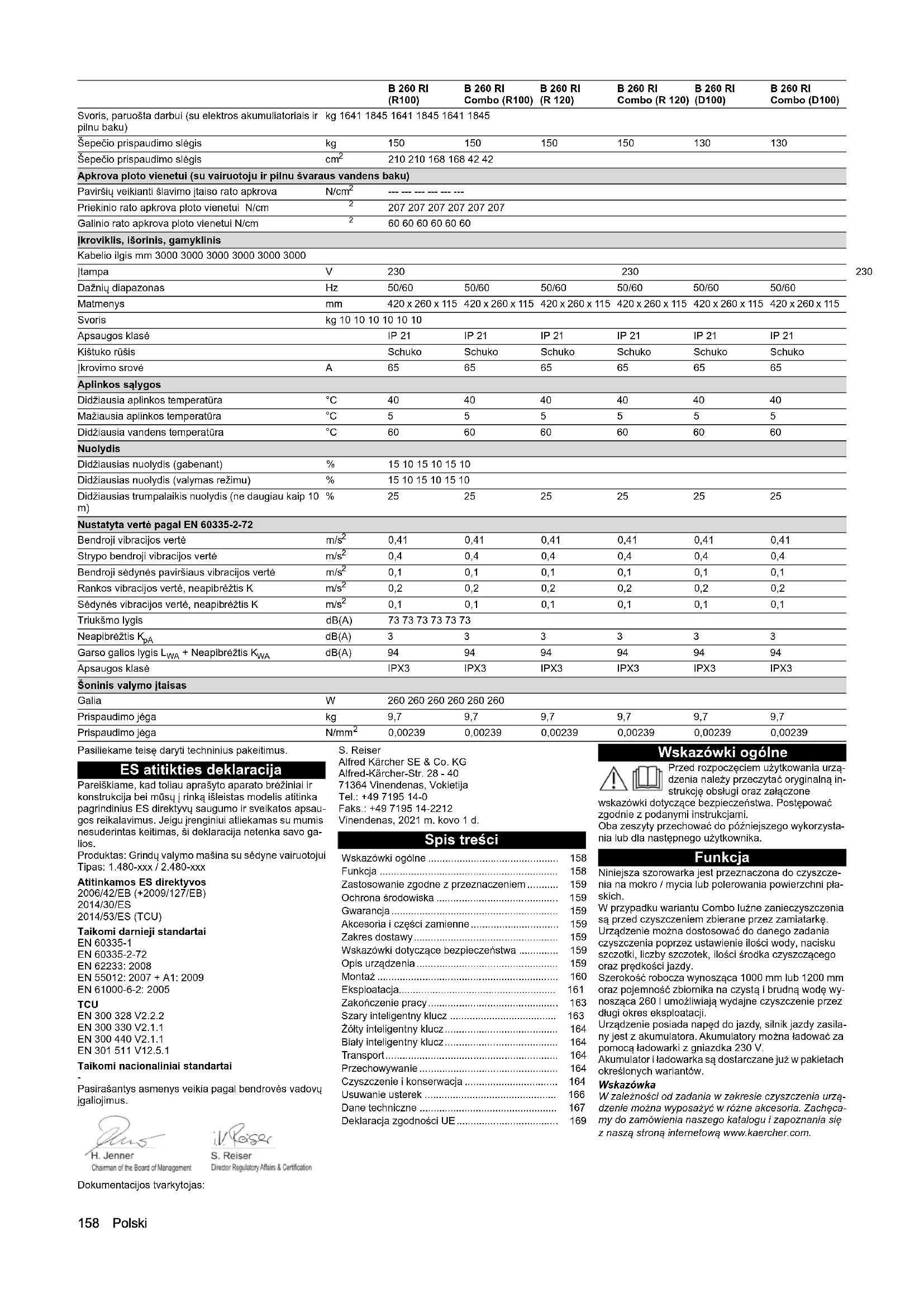 0,2 0,2 0,2 0,2 0,2 0,2 B 260 RI (R100) B 260 RI Combo (R100) B 260 RI (R 120) B 260 RI Combo (R 120) B 260 RI (D100) B 260 RI Combo (D100)Magyar 169 Zmiany techniczne zastrzeżone. Deklaracja zgodności UE Niniejszym oświadczamy, że określone poniżej urzą- dzenie odpowiada pod względem koncepcji, konstrukcji oraz wprowadzonej przez nas do handlu wersji obowią- zującym zasadniczym wymogom dyrektyw UE dotyczą- cym bezpieczeństwa i zdrowia. Wszelkie nieuzgodnione z nami modyfikacje urządzenia powodu- ją utratę ważności tego oświadczenia. Produkt: Szorowarka samojezdna Typ: 1.480-xxx / 2.480-xxx Obowiązujące dyrektywy UE 2006/42/WE (+2009/127/WE) 2014/30/UE 2014/53/EU (TCU) Zastosowane normy zharmonizowane EN 60335-1 EN 60335-2-72 EN 62233: 2008 EN 55012: 2007 + A1: 2009 EN 61000-6-2: 2005 TCU EN 300 328 V2.2.2 EN 300 330 V2.1.1 EN 300 440 V2.1.1 EN 301 511 V12.5.1 Zastosowane normy krajowe