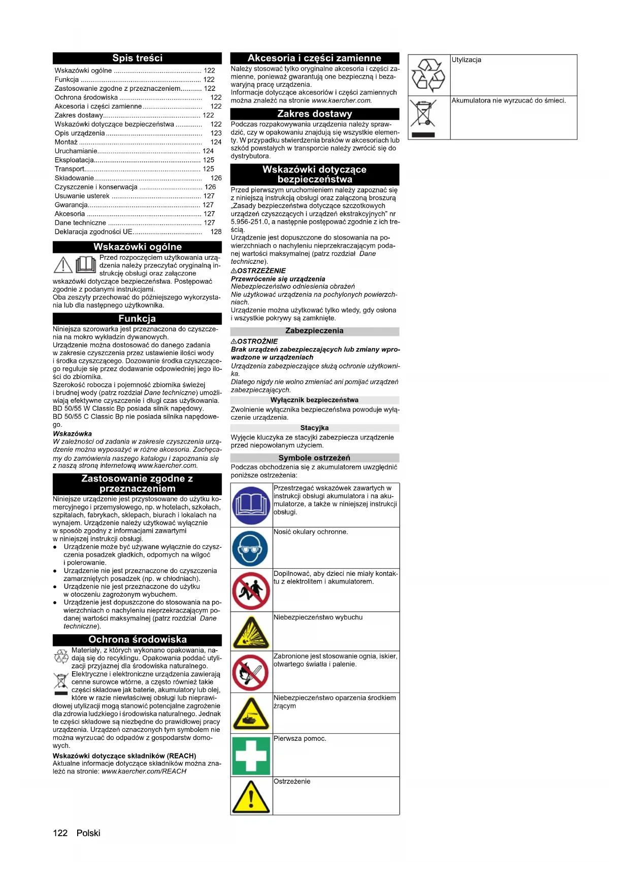 - dB(A) 84,1 84,1 BD 50/55 W Classic Bp BD 50/55 C Classic Bp Chairman of the Board of Management Director Regulatory Affairs & Certification H. Jenner S. Reiser122 Polski Spis treści Wskazówki ogólne Przed rozpoczęciem użytkowania urzą- dzenia należy przeczytać oryginalną in- strukcję obsługi oraz załączone wskazówki dotyczące bezpieczeństwa. Postępować zgodnie z podanymi instrukcjami. Oba zeszyty przechować do późniejszego wykorzysta- nia lub dla następnego użytkownika. Funkcja Niniejsza szorowarka jest przeznaczona do czyszcze- nia na mokro wykładzin dywanowych. Urządzenie można dostosować do danego zadania w zakresie czyszczenia przez ustawienie ilości wody i środka czyszczącego. Dozowanie środka czyszczące- go reguluje się przez dodawanie odpowiedniej jego ilo- ści do zbiornika. Szerokość robocza i pojemność zbiornika świeżej i brudnej wody (patrz rozdział Dane techniczne) umożli- wiają efektywne czyszczenie i długi czas użytkowania. BD 50/55 W Classic Bp posiada silnik napędowy. BD 50/55 C Classic Bp nie posiada silnika napędowe- go. Wskazówka W zależności od zadania w zakresie czyszczenia urzą- dzenie można wyposażyć w różne akcesoria. Zachęca- my do zamówienia naszego katalogu i zapoznania się z naszą stroną internetową www.kaercher.com. Zastosowanie zgodne z przeznaczeniem Niniejsze urządzenie jest przystosowane do użytku ko- mercyjnego i przemysłowego, np. w hotelach, szkołach, szpitalach, fabrykach, sklepach, biurach i lokalach na wynajem. Urządzenie należy użytkować wyłącznie w sposób zgodny z informacjami zawartymi w niniejszej instrukcji obsługi. ● Urządzenie może być używane wyłącznie do czysz- czenia posadzek gładkich, odpornych na wilgoć i polerowanie. ● Urządzenie nie jest przeznaczone do czyszczenia zamarzniętych posadzek (np. w chłodniach). ● Urządzenie nie jest przeznaczone do użytku w otoczeniu zagrożonym wybuchem. ● Urządzenie jest dopuszczone do stosowania na po- wierzchniach o nachyleniu nieprzekraczającym po- danej wartości maksymalnej (patrz rozdział Dane techniczne). Ochrona środowiska Materiały, z których wykonano opakowania, na- dają się do recyklingu. Opakowania poddać utyli- zacji przyjaznej dla środowiska naturalnego. Elektryczne i elektroniczne urządzenia zawierają cenne surowce wtórne, a często również takie części składowe jak baterie, akumulatory lub olej, które w razie niewłaściwej obsługi lub nieprawi- dłowej utylizacji mogą stanowić potencjalne zagrożenie dla zdrowia ludzkiego i środowiska naturalnego. Jednak te części składowe są niezbędne do prawidłowej pracy urządzenia. Urządzeń oznaczonych tym symbolem nie można wyrzucać do odpadów z gospodarstw domo- wych. Wskazówki dotyczące składników (REACH) Aktualne informacje dotyczące składników można zna- leźć na stronie: www.kaercher.com/REACH Akcesoria i części zamienne Należy stosować tylko oryginalne akcesoria i części za- mienne, ponieważ gwarantują one bezpieczną i beza- waryjną pracę urządzenia. Informacje dotyczące akcesoriów i części zamiennych można znaleźć na stronie www.kaercher.com. Zakres dostawy Podczas rozpakowywania urządzenia należy spraw- dzić, czy w opakowaniu znajdują się wszystkie elemen- ty. W przypadku stwierdzenia braków w akcesoriach lub szkód powstałych w transporcie należy zwrócić się do dystrybutora. Wskazówki dotyczące bezpieczeństwa Przed pierwszym uruchomieniem należy zapoznać się z niniejszą instrukcją obsługi oraz załączoną broszurą „Zasady bezpieczeństwa dotyczące szczotkowych urządzeń czyszczących i urządzeń ekstrakcyjnych” nr 5.956-251.0, a następnie postępować zgodnie z ich tre- ścią. Urządzenie jest dopuszczone do stosowania na po- wierzchniach o nachyleniu nieprzekraczającym poda- nej wartości maksymalnej (patrz rozdział Dane techniczne). 몇 OSTRZEŻENIE Przewrócenie się urządzenia Niebezpieczeństwo odniesienia obrażeń Nie użytkować urządzenia na pochylonych powierzch- niach. Urządzenie można użytkować tylko wtedy, gdy osłona i wszystkie pokrywy są zamknięte. Zabezpieczenia 몇 OSTROŻNIE Brak urządzeń zabezpieczających lub zmiany wpro- wadzone w urządzeniach Urządzenia zabezpieczające służą ochronie użytkowni- ka. Dlatego nigdy nie wolno zmieniać ani pomijać urządzeń zabezpieczających. Wyłącznik bezpieczeństwa Zwolnienie wyłącznika bezpieczeństwa powoduje wyłą- czenie urządzenia. Stacyjka Wyjęcie kluczyka ze stacyjki zabezpiecza urządzenie przed niepowołanym użyciem. Symbole ostrzeżeń Podczas obchodzenia się z akumulatorem uwzględnić poniższe ostrzeżenia: Wskazówki ogólne p. 122