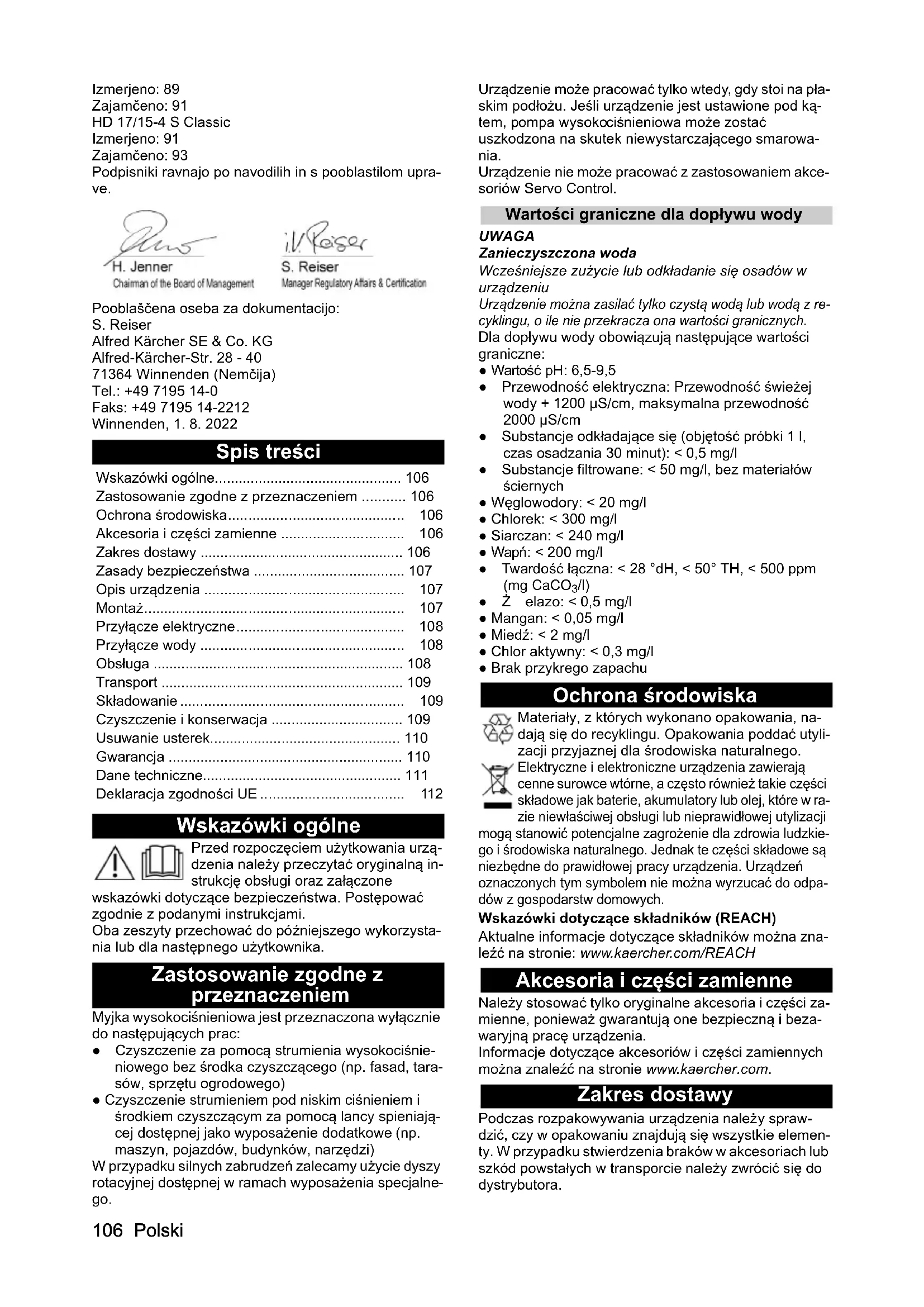 dB(A)86919193 HD 10/21-4 S HD 10/25-4 S HD 13/18-4 S HD 17/15-4 S106 Polski Izmerjeno: 89 Zajamčeno: 91 HD 17/15-4 S Classic Izmerjeno: 91 Zajamčeno: 93 Podpisniki ravnajo po navodilih in s pooblastilom upra- ve. Pooblaščena oseba za dokumentacijo: S. Reiser Alfred Kärcher SE & Co. KG Alfred-Kärcher-Str. 28 - 40 71364 Winnenden (Nemčija) Tel.: +49 7195 14-0 Faks: +49 7195 14-2212 Winnenden, 1. 8. 2022 Spis treści Wskazówki ogólne Przed rozpoczęciem użytkowania urzą- dzenia należy przeczytać oryginalną in- strukcję obsługi oraz załączone wskazówki dotyczące bezpieczeństwa. Postępować zgodnie z podanymi instrukcjami. Oba zeszyty przechować do późniejszego wykorzysta- nia lub dla następnego użytkownika. Zastosowanie zgodne z przeznaczeniem Myjka wysokociśnieniowa jest przeznaczona wyłącznie do następujących prac: ● Czyszczenie za pomocą strumienia wysokociśnie- niowego bez środka czyszczącego (np. fasad, tara- sów, sprzętu ogrodowego) ● Czyszczenie strumieniem pod niskim ciśnieniem i środkiem czyszczącym za pomocą lancy spieniają- cej dostępnej jako wyposażenie dodatkowe (np. maszyn, pojazdów, budynków, narzędzi) W przypadku silnych zabrudzeń zalecamy użycie dyszy rotacyjnej dostępnej w ramach wyposażenia specjalne- go. Urządzenie może pracować tylko wtedy, gdy stoi na pła- skim podłożu. Jeśli urządzenie jest ustawione pod ką- tem, pompa wysokociśnieniowa może zostać uszkodzona na skutek niewystarczającego smarowa- nia. Urządzenie nie może pracować z zastosowaniem akce- soriów Servo Control. Wartości graniczne dla dopływu wody UWAGA Zanieczyszczona woda Wcześniejsze zużycie lub odkładanie się osadów w urządzeniu Urządzenie można zasilać tylko czystą wodą lub wodą z re- cyklingu, o ile nie przekracza ona wartości granicznych. Dla dopływu wody obowiązują następujące wartości graniczne: ● Wartość pH: 6,5-9,5 ● Przewodność elektryczna: Przewodność świeżej wody + 1200 µS/cm, maksymalna przewodność 2000 µS/cm ● Substancje odkładające się (objętość próbki 1 l, czas osadzania 30 minut): < 0,5 mg/l ● Substancje filtrowane: < 50 mg/l, bez materiałów ściernych ● Węglowodory: < 20 mg/l ● Chlorek: < 300 mg/l ● Siarczan: < 240 mg/l ● Wapń: < 200 mg/l ● Twardość łączna: < 28 °dH, < 50° TH, < 500 ppm (mg CaCO