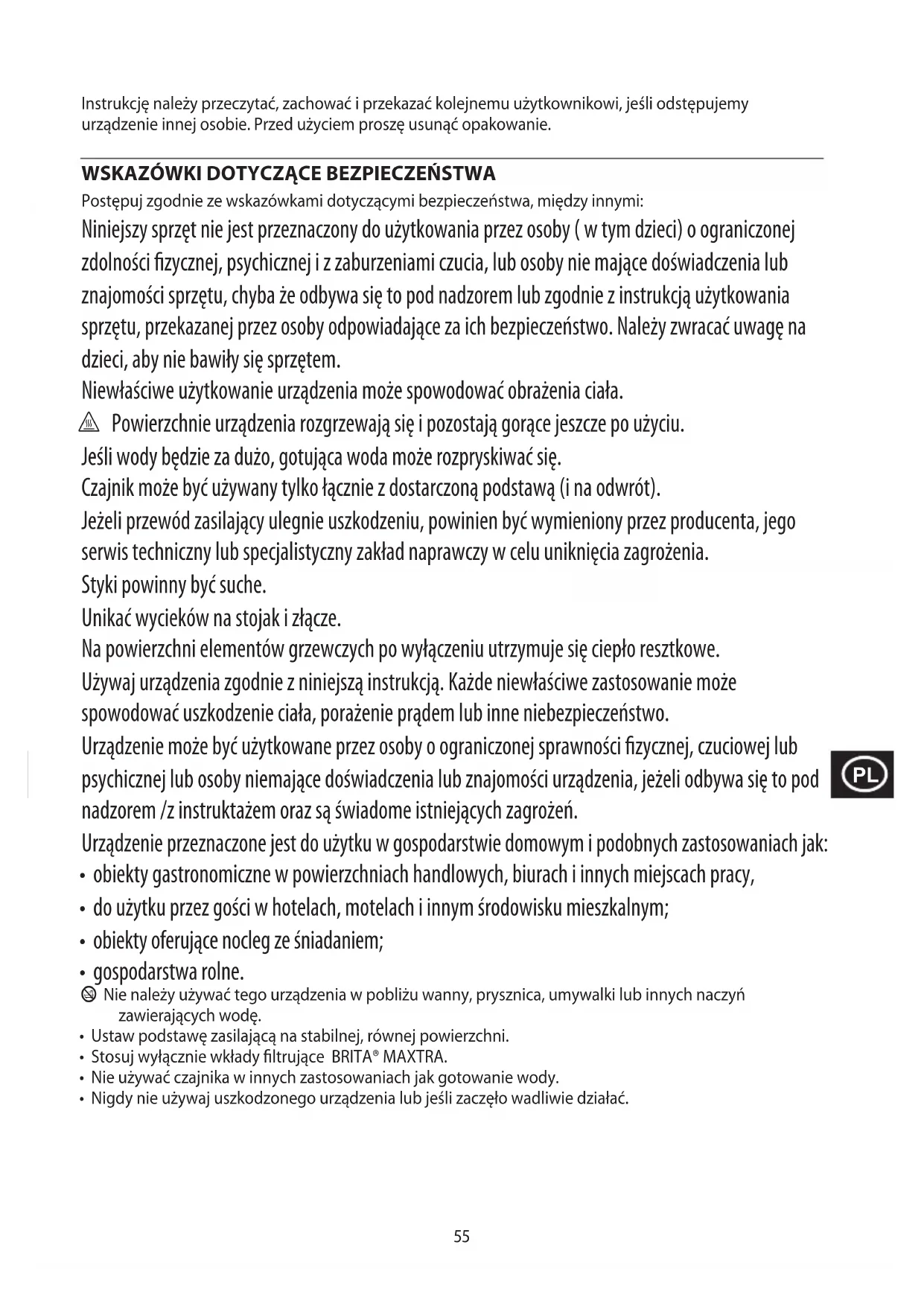 Postępuj zgodnie ze wskazówkami dotyczącymi bezpieczeństwa, między innymi: Niniejszy sprzęt nie jest przeznaczony do użytkowania przez osoby ( w tym dzieci) o ograniczonej zdolności fizycznej, psychicznej i z zaburzeniami czucia, lub osoby nie mające doświadczenia lub znajomości sprzętu, chyba że odbywa się to pod nadzorem lub zgodnie z instrukcją użytkowania sprzętu, przekazanej przez osoby odpowiadające za ich bezpieczeństwo. Należy zwracać uwagę na dzieci, aby nie bawiły się sprzętem. Niewłaściwe użytkowanie urządzenia może spowodować obrażenia ciała. h Powierzchnie urządzenia rozgrzewają się i pozostają gorące jeszcze po użyciu. Jeśli wody będzie za dużo, gotująca woda może rozpryskiwać się. Czajnik może być używany tylko łącznie z dostarczoną podstawą (i na odwrót). Jeżeli przewód zasilający ulegnie uszkodzeniu, powinien być wymieniony przez producenta, jego serwis techniczny lub specjalistyczny zakład naprawczy w celu uniknięcia zagrożenia. Styki powinny być suche. Unikać wycieków na stojak i złącze. Na powierzchni elementów grzewczych po wyłączeniu utrzymuje się ciepło resztkowe. Używaj urządzenia zgodnie z niniejszą instrukcją. Każde niewłaściwe zastosowanie może spowodować uszkodzenie ciała, porażenie prądem lub inne niebezpieczeństwo. Urządzenie może być użytkowane przez osoby o ograniczonej sprawności fizycznej, czuciowej lub psychicznej lub osoby niemające doświadczenia lub znajomości urządzenia, jeżeli odbywa się to pod nadzorem /z instruktażem oraz są świadome istniejących zagrożeń. Urządzenie przeznaczone jest do użytku w gospodarstwie domowym i podobnych zastosowaniach jak: