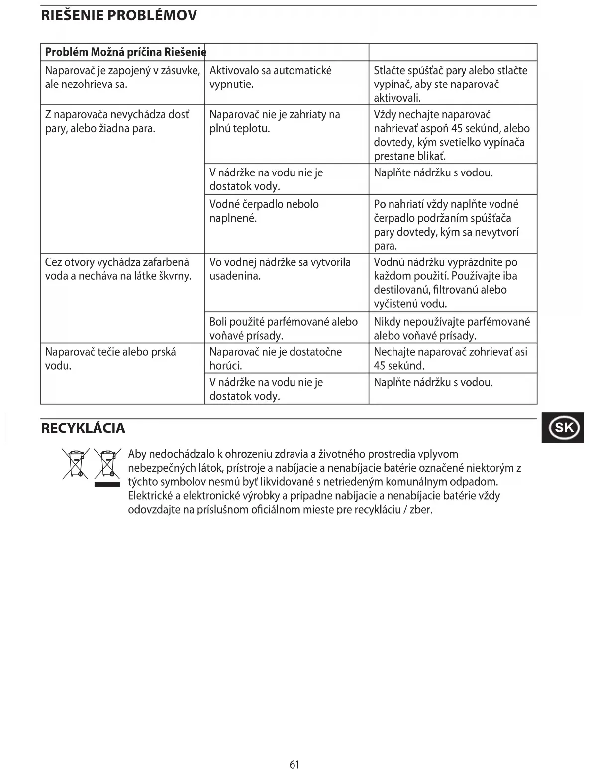 Problem Prawdopodobna przyczyna Rozwiązanie Parownica jest podłączona do sieci, lecz nie grzeje. Został aktywowany automatyczny wyłącznik. Naciśnij wyzwalacz pary lub naciśnij przycisk zasilania, aby uruchomić parownicę. Z parownicy nie wydobywa się para lub pary jest mało. Parownica nie nagrzała się do potrzebnej temperatury. Zawsze pozwalaj parownicy rozgrzewać się przez co najmniej 45 sekund, albo do momentu, gdy światełko przycisku zasilania przestanie migać. W zbiorniku wody jest za mało wody. Napełnij zbiornik z wodą. Pompa wodna nie została zalana. Po wstępnym podgrzaniu, zawsze zalej pompę wody przytrzymując wciśnięty wyzwalacz pary, żeby powstała para. Z otworów parownicy wypływa zabarwiona woda i brudzi prasowaną tkaninę. W zbiorniku wody utworzył się osad. Po każdym użyciu opróżniaj zbiornik wody. Zawsze używaj wody destylowanej, uzdatnionej lub przeltrowanej. Użyto dodatków perfumowanych lub pachnących. Nigdy nie używaj perfum ani dodatków zapachowych. Z parownicy wycieka i wytryska woda. Parownica nie jest dostatecznie gorąca. Pozwól parownicy rozgrzewać się przez około 45 sekund. Poziom wody w zbiorniku wody jest zbyt niski. Napełnij zbiornik wodą. RECYKLING