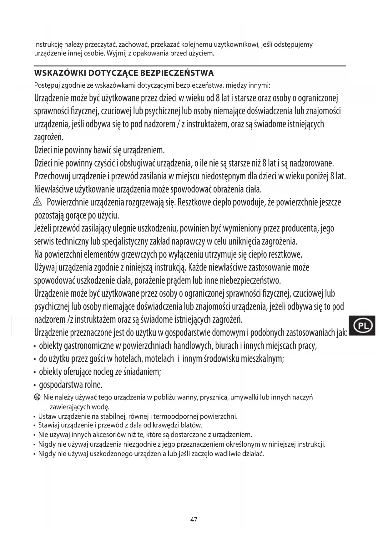 Postępuj zgodnie ze wskazówkami dotyczącymi bezpieczeństwa, między innymi: Urządzenie może być użytkowane przez dzieci w wieku od 8 lat i starsze oraz osoby o ograniczonej sprawności zycznej, czuciowej lub psychicznej lub osoby niemające doświadczenia lub znajomości urządzenia, jeśli odbywa się to pod nadzorem / z instruktażem, oraz są świadome istniejących zagrożeń. Dzieci nie powinny bawić się urządzeniem. Dzieci nie powinny czyścić i obsługiwać urządzenia, o ile nie są starsze niż 8 lat i są nadzorowane. Przechowuj urządzenie i przewód zasilania w miejscu niedostępnym dla dzieci w wieku poniżej 8 lat. Niewłaściwe użytkowanie urządzenia może spowodować obrażenia ciała. h Powierzchnie urządzenia rozgrzewają się. Resztkowe ciepło powoduje, że powierzchnie jeszcze pozostają gorące po użyciu. Jeżeli przewód zasilający ulegnie uszkodzeniu, powinien być wymieniony przez producenta, jego serwis techniczny lub specjalistyczny zakład naprawczy w celu uniknięcia zagrożenia. Na powierzchni elementów grzewczych po wyłączeniu utrzymuje się ciepło resztkowe. Używaj urządzenia zgodnie z niniejszą instrukcją. Każde niewłaściwe zastosowanie może spowodować uszkodzenie ciała, porażenie prądem lub inne niebezpieczeństwo. Urządzenie może być użytkowane przez osoby o ograniczonej sprawności zycznej, czuciowej lub psychicznej lub osoby niemające doświadczenia lub znajomości urządzenia, jeżeli odbywa się to pod nadzorem /z instruktażem oraz są świadome istniejących zagrożeń. Urządzenie przeznaczone jest do użytku w gospodarstwie domowym i podobnych zastosowaniach jak: