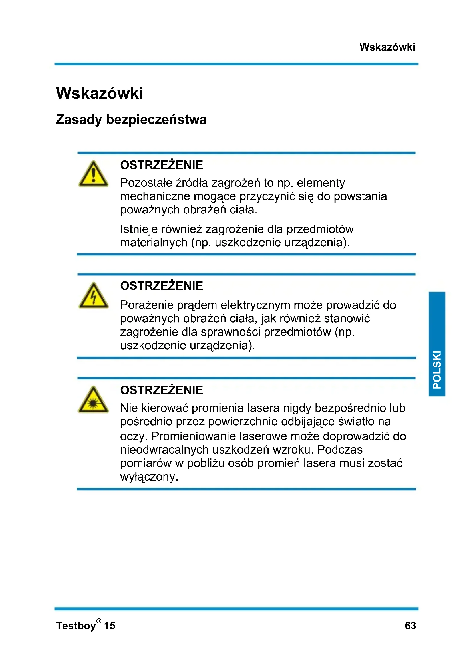 OSTRZEŻENIE Nie kierować promienia lasera nigdy bezpośrednio lub pośrednio przez powierzchnie odbijające światło na oczy. Promieniowanie laserowe może doprowadzić do nieodwracalnych uszkodzeń wzroku. Podczas pomiarów w pobliżu osób promień lasera musi zostać wyłączony.Wskazówki 64 Testboy