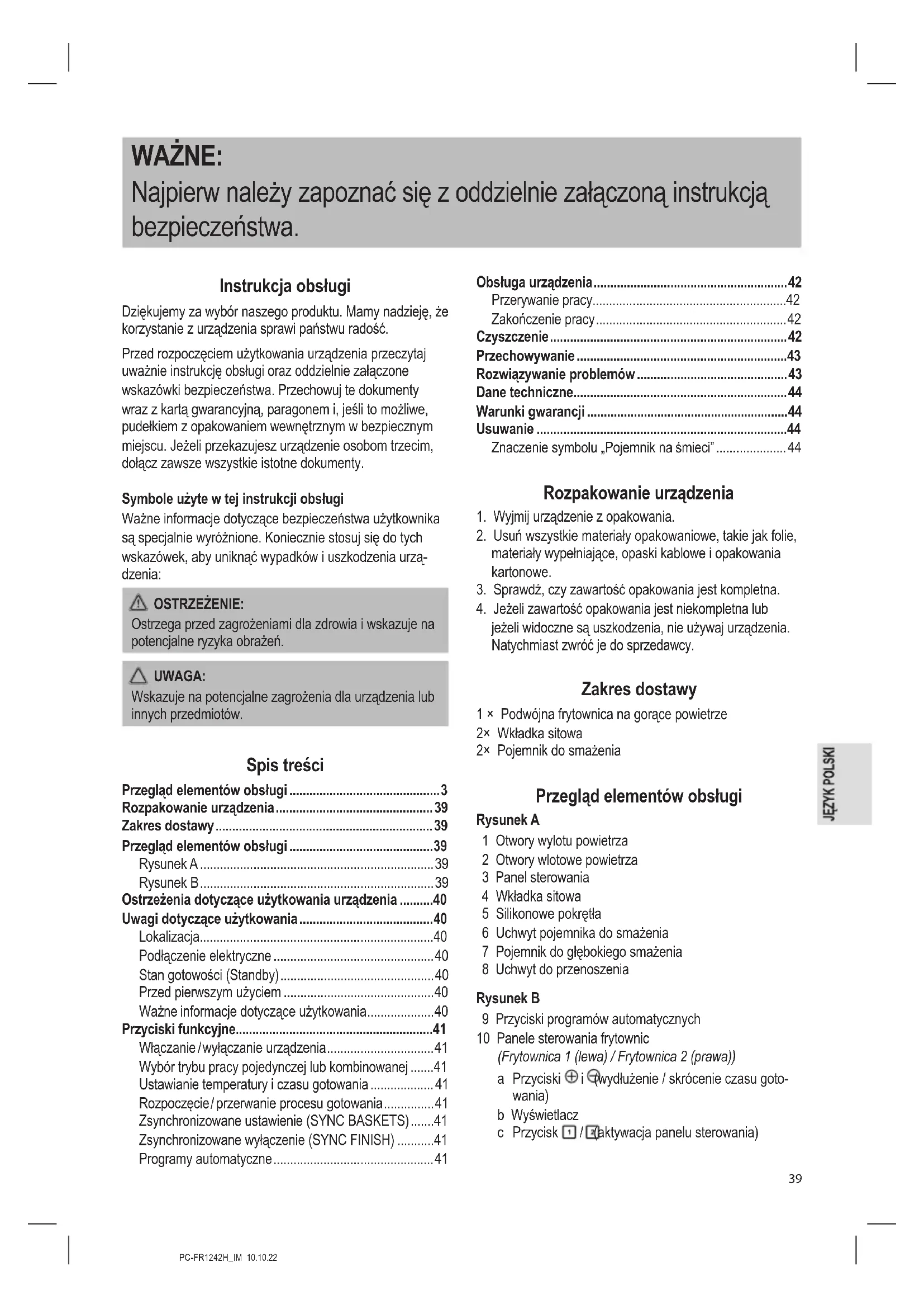jeżeli widoczne są uszkodzenia, nie używaj urządzenia. Natychmiast zwróć je do sprzedawcy. Zakres dostawy 1 × Podwójna frytownica na gorące powietrze 2× Wkładka sitowa 2× Pojemnik do smażenia Przegląd elementów obsługi Rysunek A 1 Otwory wylotu powietrza 2 Otwory wlotowe powietrza 3 Panel sterowania 4 Wkładka sitowa 5 Silikonowe pokrętła 6 Uchwyt pojemnika do smażenia 7 Pojemnik do głębokiego smażenia 8 Uchwyt do przenoszenia Rysunek B 9 Przyciski programów automatycznych 10 Panele sterowania frytownic (Frytownica 1 (lewa) / Frytownica 2 (prawa)) a Przyciski i (wydłużenie / skrócenie czasu goto- wania) b Wyświetlacz c Przycisk / (aktywacja panelu sterowania)PC-FR1242H_IM 10.10.22