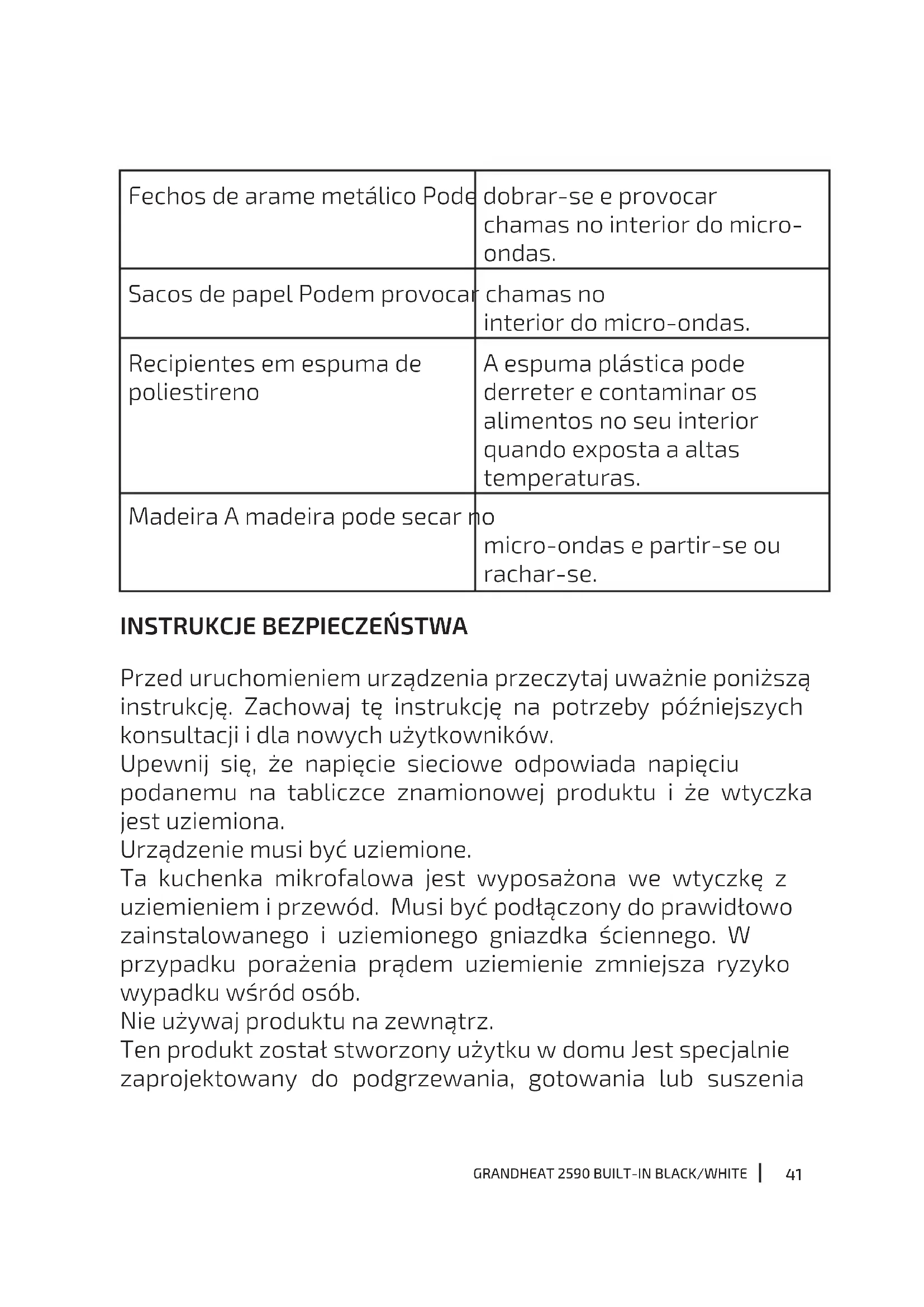Przed uruchomieniem urządzenia przeczytaj uważnie poniższą instrukcję. Zachowaj tę instrukcję na potrzeby późniejszych konsultacji i dla nowych użytkowników. Upewnij się, że napięcie sieciowe odpowiada napięciu podanemu na tabliczce znamionowej produktu i że wtyczka jest uziemiona. Urządzenie musi być uziemione. Ta kuchenka mikrofalowa jest wyposażona we wtyczkę z uziemieniem i przewód. Musi być podłączony do prawidłowo zainstalowanego i uziemionego gniazdka ściennego. W przypadku porażenia prądem uziemienie zmniejsza ryzyko wypadku wśród osób. Nie używaj produktu na zewnątrz. Ten produkt został stworzony użytku w domu Jest specjalnie zaprojektowany do podgrzewania, gotowania lub suszenia42