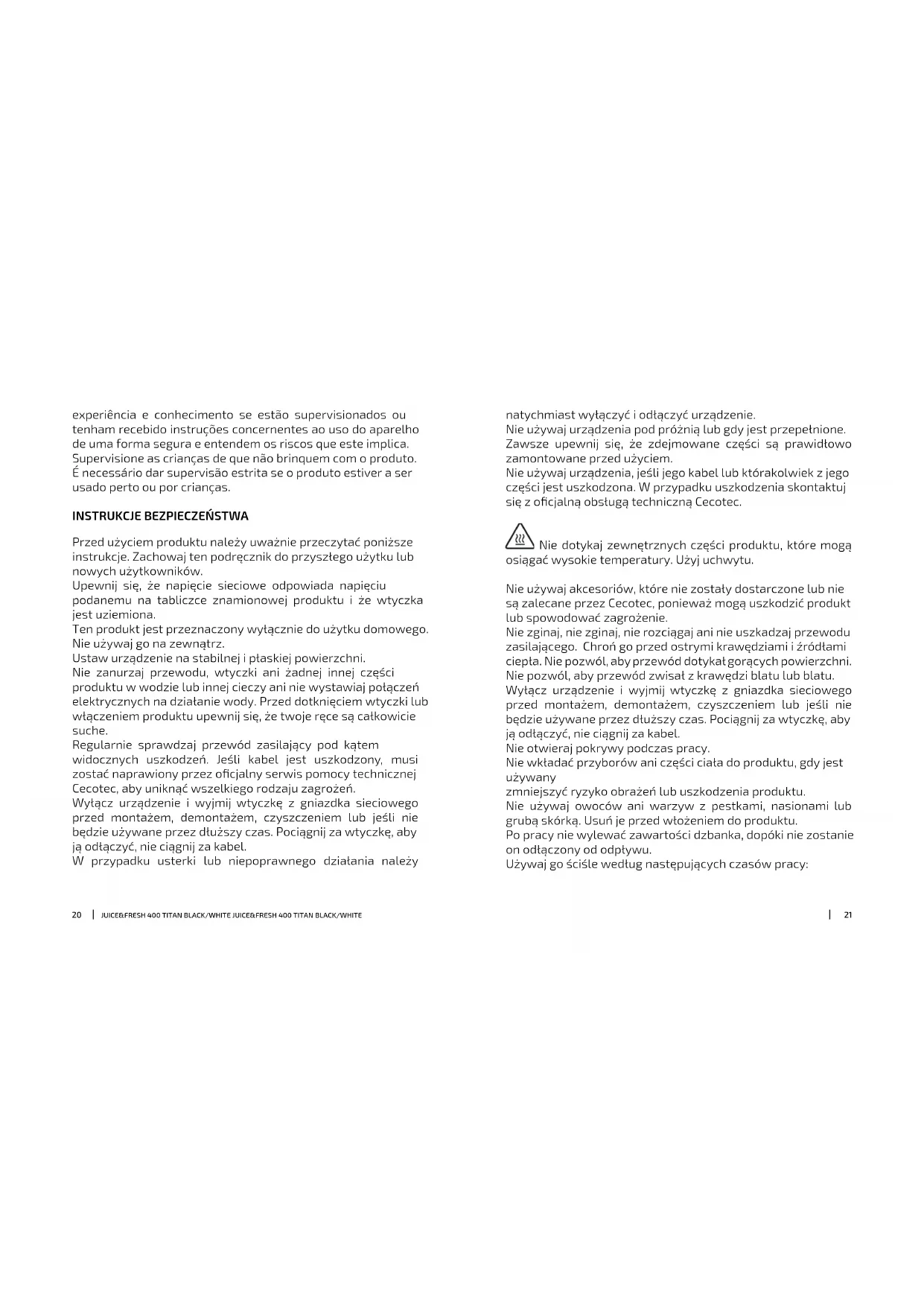 Przed użyciem produktu należy uważnie przeczytać poniższe instrukcje. Zachowaj ten podręcznik do przyszłego użytku lub nowych użytkowników. Upewnij się, że napięcie sieciowe odpowiada napięciu podanemu na tabliczce znamionowej produktu i że wtyczka jest uziemiona. Ten produkt jest przeznaczony wyłącznie do użytku domowego. Nie używaj go na zewnątrz. Ustaw urządzenie na stabilnej i płaskiej powierzchni. Nie zanurzaj przewodu, wtyczki ani żadnej innej części produktu w wodzie lub innej cieczy ani nie wystawiaj połączeń elektrycznych na działanie wody. Przed dotknięciem wtyczki lub włączeniem produktu upewnij się, że twoje ręce są całkowicie suche. Regularnie sprawdzaj przewód zasilający pod kątem widocznych uszkodzeń. Jeśli kabel jest uszkodzony, musi zostać naprawiony przez ocjalny serwis pomocy technicznej Cecotec, aby uniknąć wszelkiego rodzaju zagrożeń. Wyłącz urządzenie i wyjmij wtyczkę z gniazdka sieciowego przed montażem, demontażem, czyszczeniem lub jeśli nie będzie używane przez dłuższy czas. Pociągnij za wtyczkę, aby ją odłączyć, nie ciągnij za kabel. W przypadku usterki lub niepoprawnego działania należy natychmiast wyłączyć i odłączyć urządzenie. Nie używaj urządzenia pod próżnią lub gdy jest przepełnione. Zawsze upewnij się, że zdejmowane części są prawidłowo zamontowane przed użyciem. Nie używaj urządzenia, jeśli jego kabel lub którakolwiek z jego części jest uszkodzona. W przypadku uszkodzenia skontaktuj się z ocjalną obsługą techniczną Cecotec. Nie dotykaj zewnętrznych części produktu, które mogą osiągać wysokie temperatury. Użyj uchwytu. Nie używaj akcesoriów, które nie zostały dostarczone lub nie są zalecane przez Cecotec, ponieważ mogą uszkodzić produkt lub spowodować zagrożenie. Nie zginaj, nie zginaj, nie rozciągaj ani nie uszkadzaj przewodu zasilającego. Chroń go przed ostrymi krawędziami i źródłami ciepła. Nie pozwól, aby przewód dotykał gorących powierzchni. Nie pozwól, aby przewód zwisał z krawędzi blatu lub blatu. Wyłącz urządzenie i wyjmij wtyczkę z gniazdka sieciowego przed montażem, demontażem, czyszczeniem lub jeśli nie będzie używane przez dłuższy czas. Pociągnij za wtyczkę, aby ją odłączyć, nie ciągnij za kabel. Nie otwieraj pokrywy podczas pracy. Nie wkładać przyborów ani części ciała do produktu, gdy jest używany zmniejszyć ryzyko obrażeń lub uszkodzenia produktu. Nie używaj owoców ani warzyw z pestkami, nasionami lub grubą skórką. Usuń je przed włożeniem do produktu. Po pracy nie wylewać zawartości dzbanka, dopóki nie zostanie on odłączony od odpływu. Używaj go ściśle według następujących czasów pracy:2322 JUICE&FRESH 400 TITAN BLACK/WHITE JUICE&FRESH 400 TITAN BLACK/WHITE Nie używaj produktu w sposób ciągły dłużej niż 1 minutę; Po zakończeniu używania pozostaw urządzenie na 2 minuty; Po 3 nieprzerwanych cyklach pracy pozostaw urządzenie na 20-30 minut i użyj go ponownie po ostygnięciu silnika. W ten sposób pomoże przedłużyć żywotność produktu. Nie naprawiać ani nie usuwać żadnych stałych części produktu. Skontaktuj się z serwisem technicznym Cecotec, aby rozwiać wątpliwości lub załatwić reparacje. Aby przedłużyć żywotność urządzenia, silnik posiada system ochrony przed przegrzaniem. Gdy silnik pracuje przez długi czas lub występuje przeciążenie, zasilanie zostaje automatycznie odcięte. Gdy silnik się zatrzyma, odłącz urządzenie i poczekaj, aż silnik ostygnie (ok. 30 min) przed ponownym użyciem. Po użyciu należy wyłączyć urządzenie i odłączyć je od gniazdka elektrycznego. Zawsze używaj produktu z założoną pokrywką. Z urządzenia nie powinny korzystać dzieci w wieku od 0 do 8 lat. Z tego urządzenia mogą korzystać dzieci w wieku od 8 lat, jeżeli są pod stałym nadzorem. Ten produkt może być używany przez osoby o ograniczonych zdolnościach zycznych, sensorycznych lub umysłowych lub bez doświadczenia i wiedzy, jeśli są one nadzorowane lub otrzymały instrukcje dotyczące bezpiecznego korzystania z urządzenia i rozumieją związane z tym ryzyko. Nadzoruj dzieci, aby upewnić się, że nie bawią się produktem. Konieczny jest ścisły nadzór, jeśli produkt jest używany przez dzieci lub w ich pobliżu.