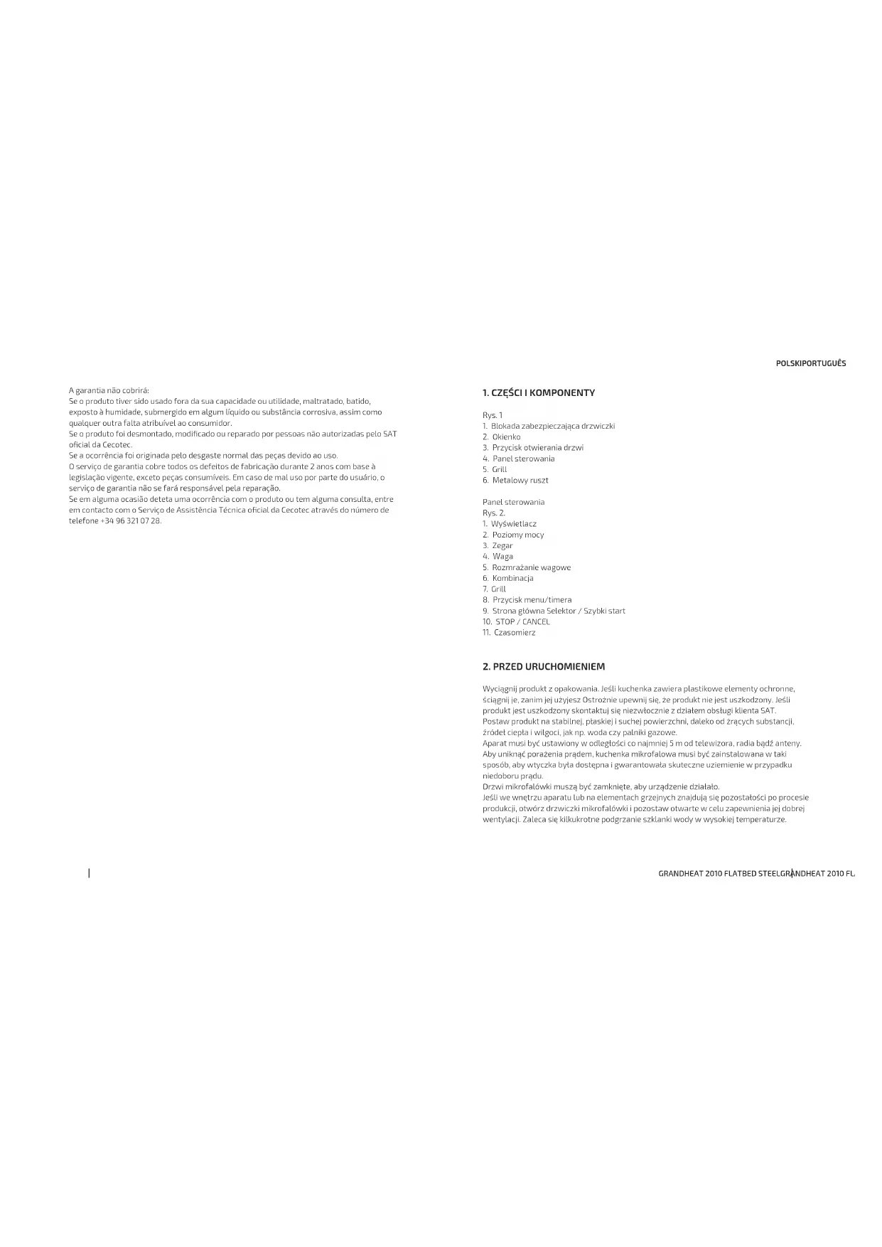 Produktjest objęty 2 letnią gwarancją od daty zakupu. Z gwarancji można korzystać po okazaniu dowodu zakupu. Produkt nie podlega gwarancji, jeśli był używany niezgodnie z instrukcją lub jeśli jest zycznie uszkodzony. Produkt NIE podlega gwarancji, jeśli: był używany niezgodnie ze swoim przeznaczeniem, wystawiony na działanie wody lub wilgoci, mechanicznie uszkodzony przez użytkownika, wystawiony na działanie substancji żrących czy nosi jakiekolwiek inne znamiona uszkodzeń wynikających z winy użytkownika. urządzenie było naprawiane lub modykowane przez osoby nieautoryzowane przez rmę Cecotec.GRANDHEAT 2010 FLATBED STEELGRANDHEAT 2010 FLATBED STEEL 101100