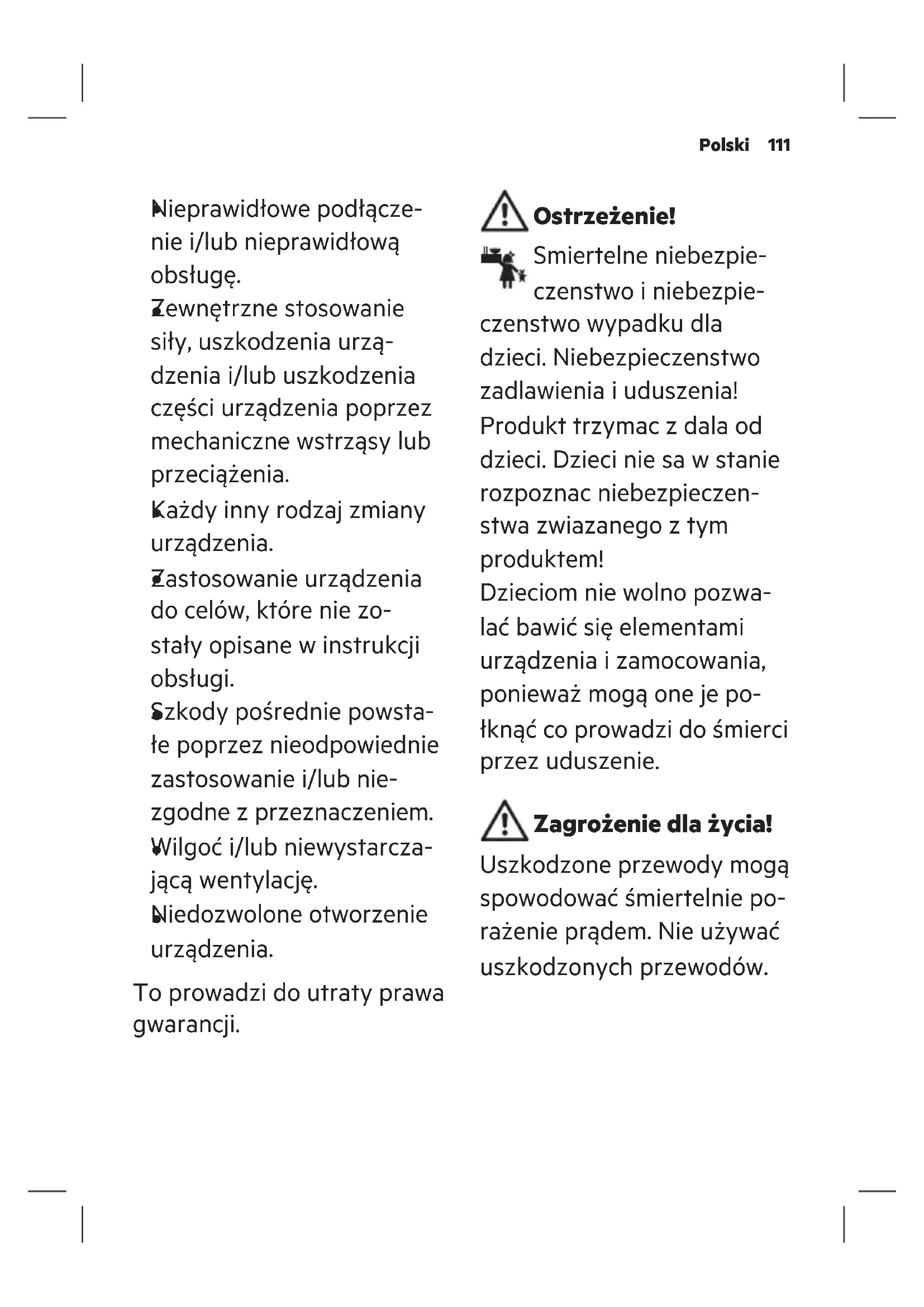 Nie stosowac uszkodzo- nego urzadzenia. Uszko- dzenia zwiekszaja ryzyko porazenia pradem.