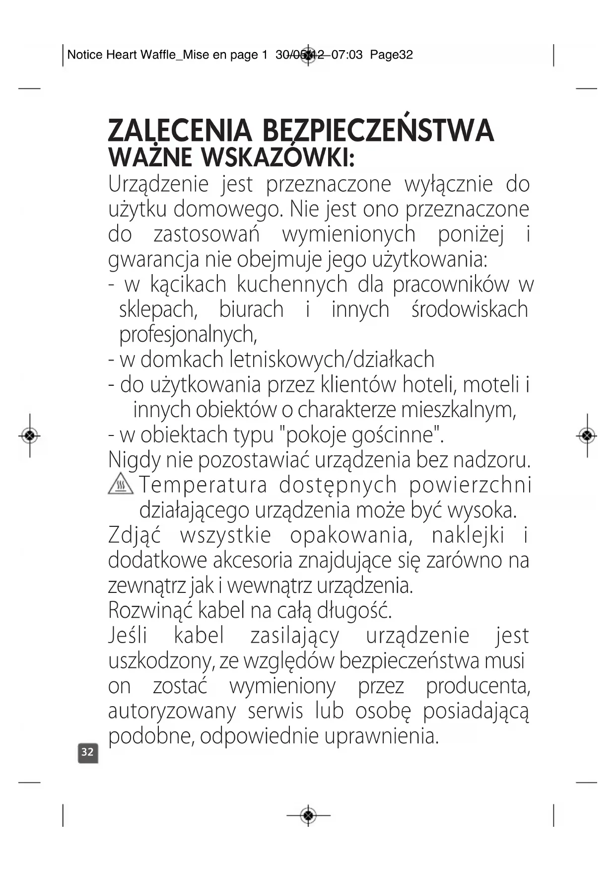 WAŻNE WSKAZÓWKI: Urządzenie jest przeznaczone wyłącznie do użytku domowego. Nie jest ono przeznaczone do zastosowań wymienionych poniżej i gwarancja nie obejmuje jego użytkowania: - w kącikach kuchennych dla pracowników w sklepach, biurach i innych środowiskach profesjonalnych, - w domkach letniskowych/działkach - do użytkowania przez klientów hoteli, moteli i innych obiektów o charakterze mieszkalnym, - w obiektach typu "pokoje gościnne". Nigdy nie pozostawiać urządzenia bez nadzoru. Temperatura dostępnych powierzchni działającego urządzenia może być wysoka. Zdjąć wszystkie opakowania, naklejki i dodatkowe akcesoria znajdujące się zarówno na zewnątrz jak i wewnątrz urządzenia. Rozwinąć kabel na całą długość. Jeśli kabel zasilający urządzenie jest uszkodzony, ze względów bezpieczeństwa musi on zostać wymieniony przez producenta, autoryzowany serwis lub osobę posiadającą podobne, odpowiednie uprawnienia. Notice Heart Waffle_Mise en page 1 30/05/12 07:03 Page3233