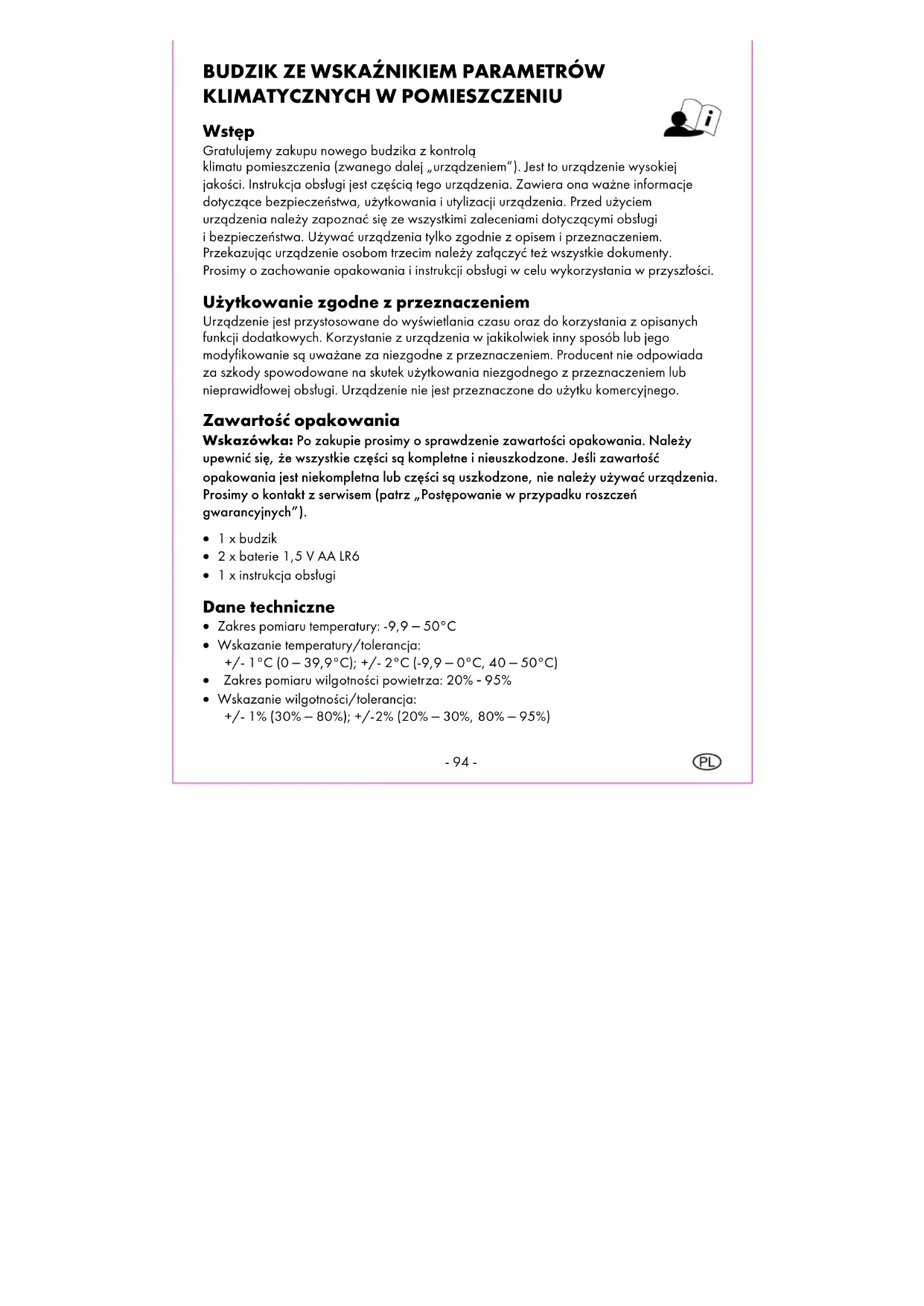 Wstęp Gratulujemy zakupu nowego budzika z kontrolą klimatu pomieszczenia (zwanego dalej „urządzeniem”). Jest to urządzenie wysokiej jakości. Instrukcja obsługi jest częścią tego urządzenia. Zawiera ona ważne informacje dotyczące bezpieczeństwa, użytkowania i utylizacji urządzenia. Przed użyciem urządzenia należy zapoznać się ze wszystkimi zaleceniami dotyczącymi obsługi i bezpieczeństwa. Używać urządzenia tylko zgodnie z opisem i przeznaczeniem. Przekazując urządzenie osobom trzecim należy załączyć też wszystkie dokumenty. Prosimy o zachowanie opakowania i instrukcji obsługi w celu wykorzystania w przyszłości. Użytkowanie zgodne z przeznaczeniem Urządzenie jest przystosowane do wyświetlania czasu oraz do korzystania z opisanych funkcji dodatkowych. Korzystanie z urządzenia w jakikolwiek inny sposób lub jego modyfikowanie są uważane za niezgodne z przeznaczeniem. Producent nie odpowiada za szkody spowodowane na skutek użytkowania niezgodnego z przeznaczeniem lub nieprawidłowej obsługi. Urządzenie nie jest przeznaczone do użytku komercyjnego. Zawartość opakowania Wskazówka: Po zakupie prosimy o sprawdzenie zawartości opakowania. Należy upewnić się, że wszystkie części są kompletne i nieuszkodzone. Jeśli zawartość opakowania jest niekompletna lub części są uszkodzone, nie należy używać urządzenia. Prosimy o kontakt z serwisem (patrz „Postępowanie w przypadku roszczeń gwarancyjnych”). 1 x budzik 2 x baterie 1,5 V AA LR6 1 x instrukcja obsługi Dane techniczne Zakres pomiaru temperatury: -9,9 – 50°C Wskazanie temperatury/tolerancja: +/- 1°C (0 – 39,9°C); +/- 2°C (-9,9 – 0°C, 40 – 50°C) Zakres pomiaru wilgotności powietrza: 20% - 95% Wskazanie wilgotności/tolerancja: +/- 1% (30% – 80%); +/-2% (20% – 30%, 80% – 95%)- 95 - Wymiary: 4-LD6102-1 ok. 153 x 174 x 107 mm 4-LD6102-2 ok. 105 x 193 x 131 mm 4-LD6102-3 ok. 125 x 175 x 121 mm Waga: 4-LD6102-1 ok. 210 g (bez baterii) 4-LD6102-2 ok. 188 g (bez baterii) 4-LD6102-3 ok. 188 g (bez baterii) Zasilanie dwiema bateriami 1,5 V AA LR6/R6P Bateria – symbol napięcia prądu stałego Objaśnienie symboli