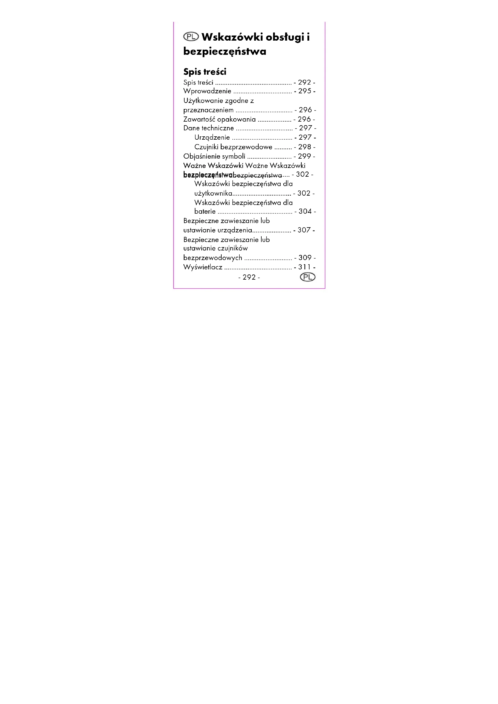 Dodavatel Upozorňujeme, že následující adresa není adresa servisního centra. Kontaktuje, prosím, výše zmíněné místo. digi-tech gmbh Valterweg 27A 65817 Eppstein NĚMECKO- 292 - Wskazówki obsługi i bezpieczęństwa Spis treści Spis treści ........................................... - 292 - Wprowadzenie ................................. - 295 - Użytkowanie zgodne z przeznaczeniem ................................ - 296 - Zawartość opakowania ................... - 296 - Dane techniczne ................................ - 297 - Urządzenie .................................. - 297 - Czujniki bezprzewodowe .......... - 298 - Objaśnienie symboli ......................... - 299 - Ważne Wskazówki Ważne Wskazówki Ważne Wskazówki Ważne Wskazówki