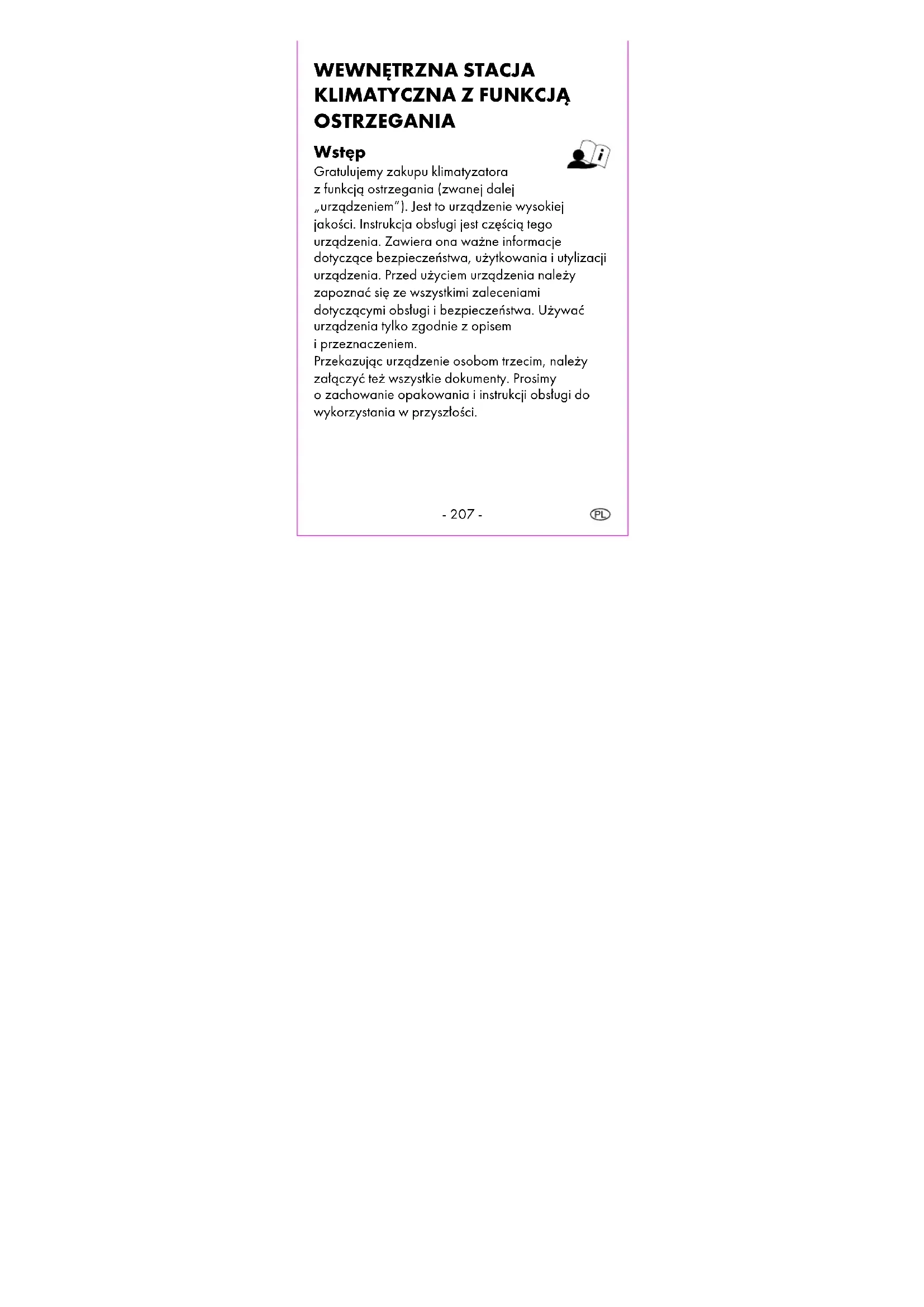 OSTRZEGANIA Wstęp Gratulujemy zakupu klimatyzatora z funkcją ostrzegania (zwanej dalej „urządzeniem”). Jest to urządzenie wysokiej jakości. Instrukcja obsługi jest częścią tego urządzenia. Zawiera ona ważne informacje dotyczące bezpieczeństwa, użytkowania i utylizacji urządzenia. Przed użyciem urządzenia należy zapoznać się ze wszystkimi zaleceniami dotyczącymi obsługi i bezpieczeństwa. Używać urządzenia tylko zgodnie z opisem i przeznaczeniem. Przekazując urządzenie osobom trzecim, należy załączyć też wszystkie dokumenty. Prosimy o zachowanie opakowania i instrukcji obsługi do wykorzystania w przyszłości.- 208 - Użytkowanie zgodne z przeznaczeniem Urządzenie jest przystosowane do korzystania z opisanych funkcji. Korzystanie z urządzenia w jakikolwiek inny sposób lub jego modyfikowanie są uważane za niezgodne z przeznaczeniem. Producent nie odpowiada za szkody spowodowane na skutek użytkowania niezgodnego z przeznaczeniem lub nieprawidłowej obsługi. Urządzenie nie jest przeznaczone do użytku komercyjnego. Zawartość opakowania Wskazówka: po zakupie prosimy o sprawdzenie zawartości opakowania. Należy upewnić się, że wszystkie części są kompletne i nieuszkodzone. Jeśli zawartość opakowania jest niekompletna lub części są uszkodzone, nie należy go używać. Prosimy o kontakt z serwisem (patrz „Postępowanie w przypadku roszczeń gwarancyjnych”). 1 x Wewnętrzna stacja klimatyzacji 2 x Baterie 1,5 V AAA LR03 1 x instrukcja obsługi- 209 - Dane techniczne Zakres pomiaru temperatur: 0 °C – 50 °C Zakres pomiarowy/wilgotność: 20% - 95% Wyświetlanie temperatury/tolerancja w podstawowym zakresie pomiarowym: +/- 1°C Wilgotność/tolerancja w podstawowym zakresie pomiarowym: 41% - 80% - ± 3%; inny zakres: ± 5% Wymiary: ok. 115 x 74 x 24 mm Waga: model 1: ok. 97 g (bez baterii) model 2: ok. 93 g (bez baterii) Baterie: 2 x 1,5 V AAA /R03/LR03 – oznaczenie napięcia stałego Objaśnienie symboli OSTRZEŻENIE! Ten symbol oznacza zagrożenie o średnim stopniu ryzyka, którego nieprzestrzeganie może spowodować śmierć lub ciężkie zranienie.- 210 - Wskazówka: To hasło ostrzegawcze służy do oznaczania dodatkowych informacji.