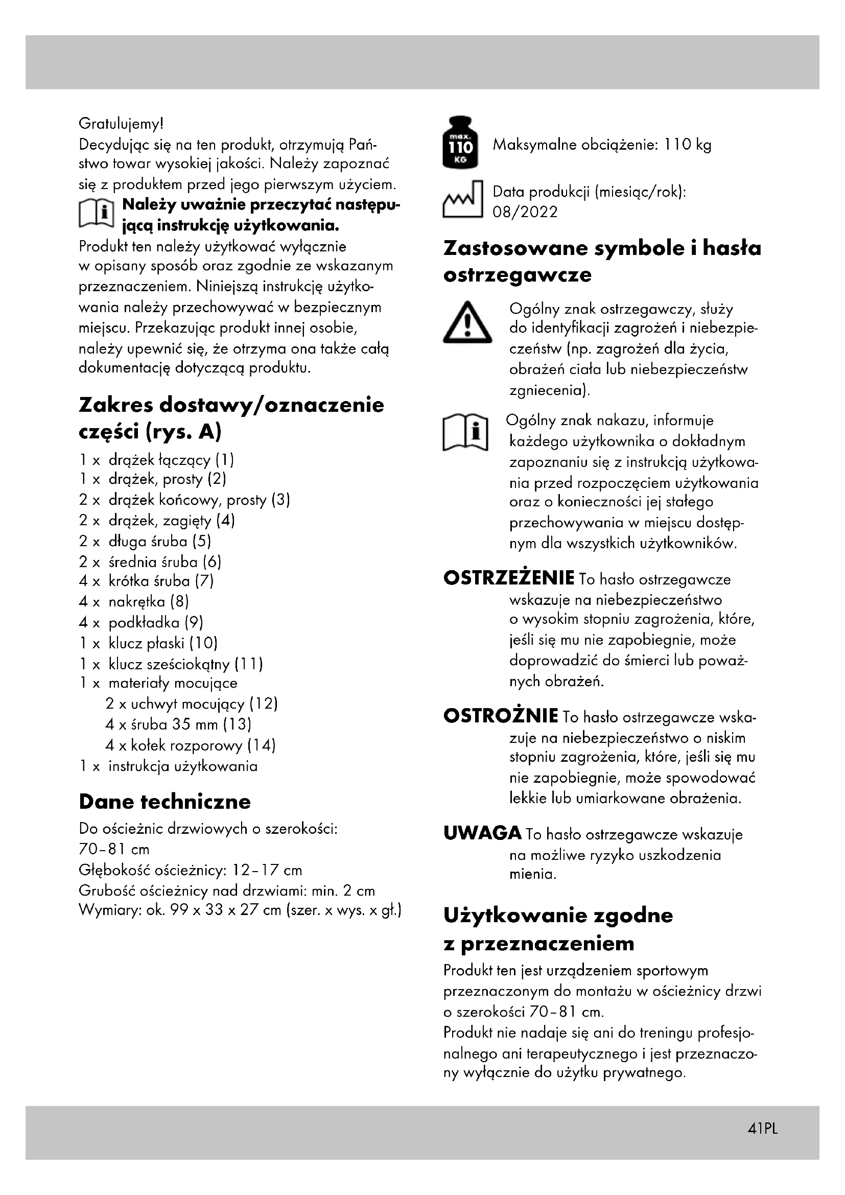 Maksymalne obciążenie: 110 kg Data produkcji (miesiąc/rok): 08/2022 Zastosowane symbole i hasła ostrzegawcze Ogólny znak ostrzegawczy, służy do identyfikacji zagrożeń i niebezpie- czeństw (np. zagrożeń dla życia, obrażeń ciała lub niebezpieczeństw zgniecenia). Ogólny znak nakazu, informuje każdego użytkownika o dokładnym zapoznaniu się z instrukcją użytkowa- nia przed rozpoczęciem użytkowania oraz o konieczności jej stałego przechowywania w miejscu dostęp- nym dla wszystkich użytkowników. OSTRZEŻENIE To hasło ostrzegawcze wskazuje na niebezpieczeństwo o wysokim stopniu zagrożenia, które, jeśli się mu nie zapobiegnie, może doprowadzić do śmierci lub poważ- nych obrażeń. OSTROŻNIE To hasło ostrzegawcze wska- zuje na niebezpieczeństwo o niskim stopniu zagrożenia, które, jeśli się mu nie zapobiegnie, może spowodować lekkie lub umiarkowane obrażenia. UWAGA To hasło ostrzegawcze wskazuje na możliwe ryzyko uszkodzenia mienia. Użytkowanie zgodne z przeznaczeniem Produkt ten jest urządzeniem sportowym przeznaczonym do montażu w ościeżnicy drzwi o szerokości 70–81 cm. Produkt nie nadaje się ani do treningu profesjo- nalnego ani terapeutycznego i jest przeznaczo- ny wyłącznie do użytku prywatnego.42 PL Wskazówki bezpieczeństwa Zagrożenie życia!