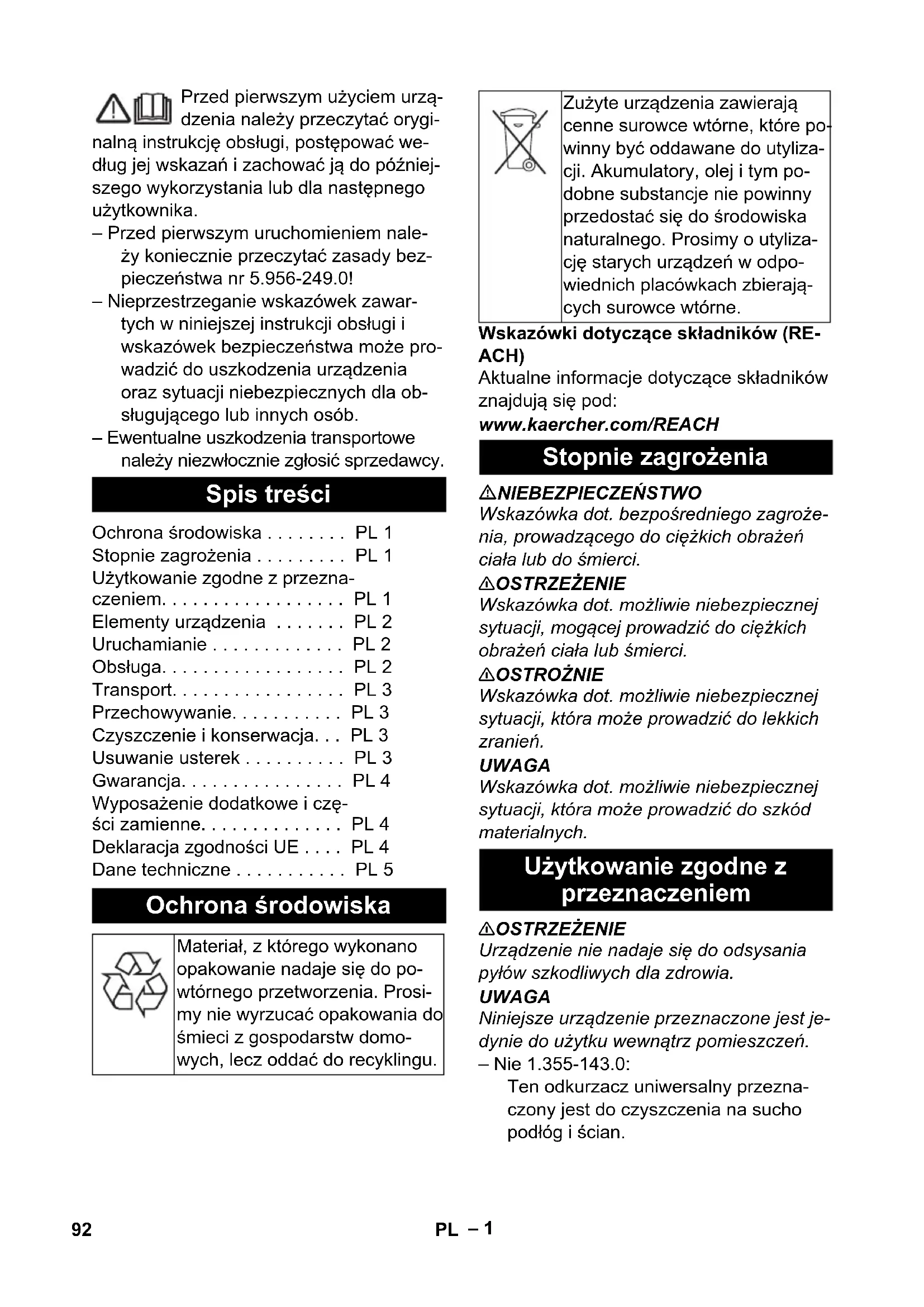 Št. delov Dolžina ka- bla EU 6.650-622.0 12 m GB 6.650-641.0 12 m CH 6.650-638.0 12 m 91SL– 1 Przed pierwszym użyciem urzą- dzenia należy przeczytać orygi- nalną instrukcję obsługi, postępować we- dług jej wskazań i zachować ją do później- szego wykorzystania lub dla następnego użytkownika. – Przed pierwszym uruchomieniem nale- ży koniecznie przeczytać zasady bez- pieczeństwa nr 5.956-249.0! – Nieprzestrzeganie wskazówek zawar- tych w niniejszej instrukcji obsługi i wskazówek bezpieczeństwa może pro- wadzić do uszkodzenia urządzenia oraz sytuacji niebezpiecznych dla ob- sługującego lub innych osób. – Ewentualne uszkodzenia transportowe należy niezwłocznie zgłosić sprzedawcy. Wskazówki dotyczące składników (RE- ACH) Aktualne informacje dotyczące składników znajdują się pod: www.kaercher.com/REACH NIEBEZPIECZEŃSTWO Wskazówka dot. bezpośredniego zagroże- nia, prowadzącego do ciężkich obrażeń ciała lub do śmierci. 몇 OSTRZEŻENIE Wskazówka dot. możliwie niebezpiecznej sytuacji, mogącej prowadzić do ciężkich obrażeń ciała lub śmierci. 몇 OSTROŻNIE Wskazówka dot. możliwie niebezpiecznej sytuacji, która może prowadzić do lekkich zranień. UWAGA Wskazówka dot. możliwie niebezpiecznej sytuacji, która może prowadzić do szkód materialnych. 몇 OSTRZEŻENIE Urz ądzenie nie nadaje się do odsysania pyłów szkodliwych dla zdrowia. UWAGA Niniejsze urządzenie przeznaczone jest je- dynie do użytku wewnątrz pomieszczeń. – Nie 1.355-143.0: Ten odkurzacz uniwersalny przezna- czony jest do czyszczenia na sucho podłóg i ścian. Spis treści Ochrona środowiska . . . . . . . . PL 1 Stopnie zagrożenia . . . . . . . . . PL 1 Użytkowanie zgodne z przezna- czeniem. . . . . . . . . . . . . . . . . . PL 1 Elementy urządzenia . . . . . . . PL 2 Uruchamianie . . . . . . . . . . . . . PL 2 Obsługa. . . . . . . . . . . . . . . . . . PL 2 Transport. . . . . . . . . . . . . . . . . PL 3 Przechowywanie. . . . . . . . . . . PL 3 Czyszczenie i konserwacja. . . PL 3 Usuwanie usterek . . . . . . . . . . PL 3 Gwarancja. . . . . . . . . . . . . . . . PL 4 Wyposażenie dodatkowe i czę- ści zamienne. . . . . . . . . . . . . . PL 4 Deklaracja zgodności UE . . . . PL 4 Dane techniczne . . . . . . . . . . . PL 5 Ochrona środowiska Materiał, z którego wykonano opakowanie nadaje się do po- wtórnego przetworzenia. Prosi- my nie wyrzucać opakowania do śmieci z gospodarstw domo- wych, lecz oddać do recyklingu. Zużyte urządzenia zawierają cenne surowce wtórne, które po- winny być oddawane do utyliza- cji. Akumulatory, olej i tym po- dobne substancje nie powinny przedostać się do środowiska naturalnego. Prosimy o utyliza- cję starych urządzeń w odpo- wiednich placówkach zbierają- cych surowce wtórne. Stopnie zagrożenia Użytkowanie zgodne z przeznaczeniem 92 PL– 2 – Tylko 1.355-143.0: Ten odkurzacz do twardych powierzch- ni przeznaczony jest do czyszczenia na sucho podłóg i ścian. – Tylko 1.355-143.0: Dołączona dysza do podłóg nie nadaje się do użytku na dywanach. – Urządzenie przeznaczone jest do za- stosowania profesjonalnego, np. w ho- telach, szkołach, szpitalach, fabrykach, sklepach, biurach i pomieszczeniach wynajmowanych. 1 Filtr włókninowy 2 Króciec ssący 3 Wąż ssący 4 Tabliczka identyfikacyjna 5 Hak kablowy 6 Uchwyt do noszenia 7 Kabel sieciowy 8 Głowica ssąca 9 Ryglowanie głowicy ssącej 10 Kółko skrętne 11 Zbiornik na zanieczyszczenia 12 Wtyczka na elektryczną szczotkę ssącą 13 Wyłącznik główny 14 Przełącznik twardej nawierzchni/wykła- dziny dywanowej (w zależności od wyposażenia) 15 Ssawka podłogowa 16 Rura ssąca 17 Mocowanie wtyczki sieciowej 18 Schowek na dyszę podłogową 19 Rygiel osłony 20 Osłona 21 Obudowa filtra 22 Filtr wywiewny 23 Regulator siły ssania (bezstopniowy) 24 Krzywak 25 Koszyk filtra głównego 26 Filtr ochronny silnika – Elementy obsługi procesu czyszczenia są żółte. – Elementy obsługi konserwacji i serwisu są jasnoszare. Kontrola zastosowania koszyka filtru głównego w urządzeniu. 1 Praca z filtrem włókninowym lub papie- rowym (wyposażenie specjalne) 2 Praca bez filtra Odblokować i zdjąć głowicę ssącą. Wyjąć koszyk filtra głównego. Nałożyć worek włókninowy lub papiero- wy wkład filtra (wyposażenie specjalne). Włożyć koszyk filtra głównego. Nałożyć i zablokować głowicę ssącą. Podłączyć urządzenie do zasilania. Włączyć urządzenie za pomocą wy- łącznika głównego. Przełącznik dyszy do podłóg ustawić na twardą nawierzchnię lub wykładzinę dy- wanową. Ustawić moc ssania w regulatorze siły ssania (bezstopniowo). Rozpocząć czyszczenie. Wyłączyć urządzenie przy użyciu wy- łącznika głównego. Wyciągnąć wtyczkę z gniazda zasilają- cego. Opróżnić zbiornik. Wyczyścić urządzenie od wewnątrz i od zewnątrz poprzez odkurzenie i wytarcie wilgotną szmatką. Elementy urządzenia Kolor oznaczenia Uruchamianie Tryby pracy Zakładanie worka papierowego Obsługa Włączenie urządzenia Tryb czyszczenia Wyłączanie urządzenia Po każdym użyciu 93PL– 3 몇 OSTROŻNIE Niebezpieczeństwo zranienia i uszkodze- nia! Zwrócić uwagę na ciężar urządzenia w czasie transportu. W trakcie transportu w pojazdach nale- ży urządzenie zabezpieczyć przed po- ślizgiem i przechyleniem zgodnie z obo- wiązującymi przepisami. 몇 OSTROŻNIE Niebezpieczeństwo zranienia i uszkodze- nia! Zwrócić uwagę na ciężar urządzenia przy jego przechowywaniu. Urządzenie może być przechowywane je- dynie w pomieszczeniach wewnętrznych. NIEBEZPIECZEŃSTWO Przed przystąpieniem do wszelkich prac w obrębie urządzenia należy wyłączyć urzą- dzenie i odłączyć przewód sieciowy od za- silania. W razie potrzeby wyczyścić główny kosz filtracyjny pod wodą bieżącą. UWAGA Niebezpieczeństwo uszkodzenia! Nigdy nie zakładać mokrego koszyka filtra głów- nego. Filtr 