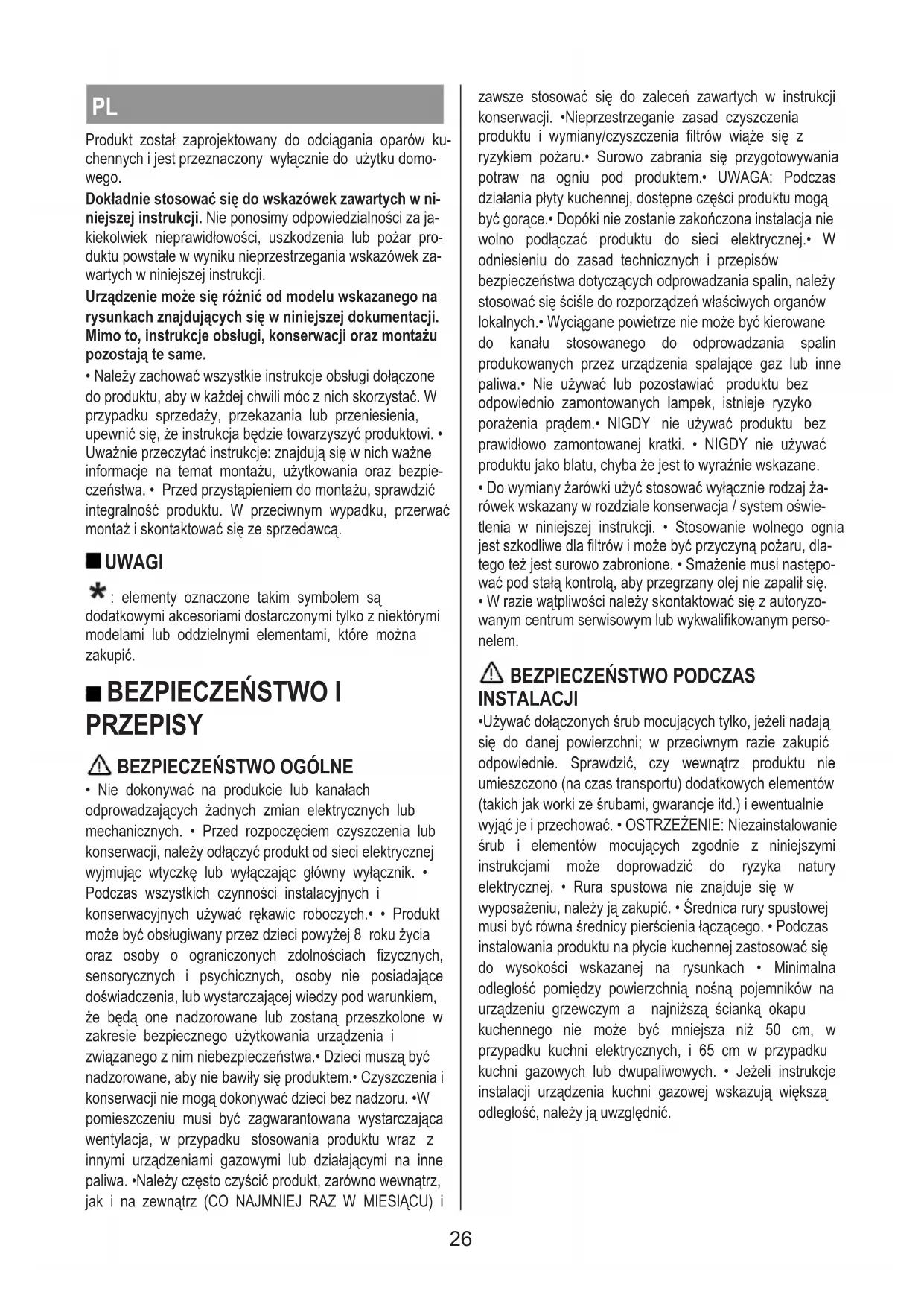 - Het verlichtingssysteem is gebaseerd op de led-technolo- gie. Leds garanderen een optimale verlichting en gaan maximaal 10 keer langer mee dan traditionele lampen, ter- wijl er 90% elektriciteit wordt bespaard. 25PL Produkt został zaprojektowany do odciągania oparów ku- chennych i jest przeznaczony wyłącznie do użytku domo- wego. Dokładnie stosować się do wskazówek zawartych w ni- niejszej instrukcji. Nie ponosimy odpowiedzialności za ja- kiekolwiek nieprawidłowości, uszkodzenia lub pożar pro- duktu powstałe w wyniku nieprzestrzegania wskazówek za- wartych w niniejszej instrukcji. Urządzenie może się różnić od modelu wskazanego na rysunkach znajdujących się w niniejszej dokumentacji. Mimo to, instrukcje obsługi, konserwacji oraz montażu pozostają te same.