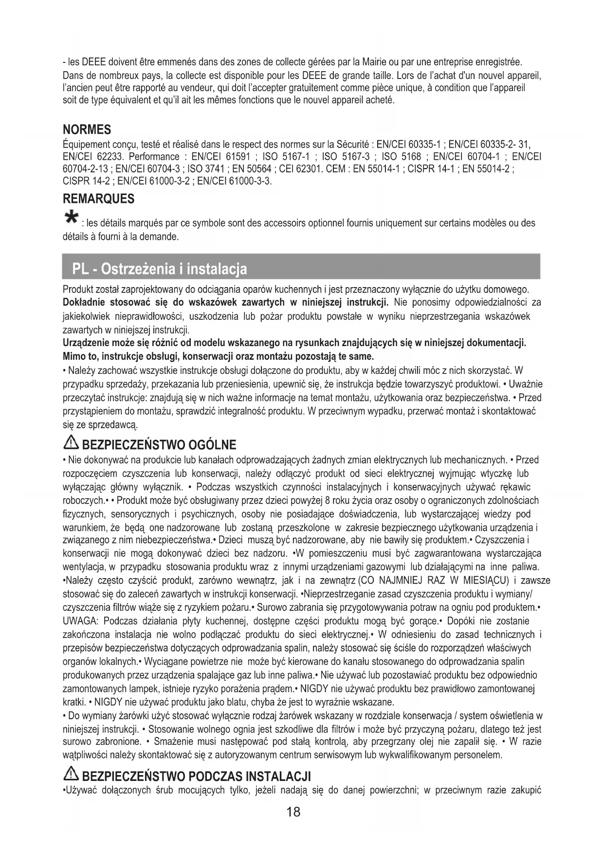 Dans de nombreux pays, la collecte est disponible pour les DEEE de grande taille. Lors de l’achat d'un nouvel appareil, l’ancien peut être rapporté au vendeur, qui doit l’accepter gratuitement comme pièce unique, à condition que l’appareil soit de type équivalent et qu’il ait les mêmes fonctions que le nouvel appareil acheté. NORMES Équipement conçu, testé et réalisé dans le respect des normes sur la Sécurité: EN/CEI 60335-1; EN/CEI 60335-2- 31, EN/CEI 62233. Performance : EN/CEI 61591 ; ISO 5167-1 ; ISO 5167-3 ; ISO 5168 ; EN/CEI 60704-1 ; EN/CEI 60704-2-13; EN/CEI 60704-3; ISO 3741; EN 50564; CEI 62301. CEM: EN 55014-1; CISPR 14-1; EN 55014-2; CISPR 14-2; EN/CEI 61000-3-2; EN/CEI 61000-3-3. REMARQUES : les détails marqués par ce symbole sont des accessoirs optionnel fournis uniquement sur certains modèles ou des détails à fourni à la demande. PL - Ostrzeżenia i instalacja Produkt został zaprojektowany do odciągania oparów kuchennych i jest przeznaczony wyłącznie do użytku domowego. Dokładnie stosować się do wskazówek zawartych w niniejszej instrukcji. Nie ponosimy odpowiedzialności za jakiekolwiek nieprawidłowości, uszkodzenia lub pożar produktu powstałe w wyniku nieprzestrzegania wskazówek zawartych w niniejszej instrukcji. Urządzenie może się różnić od modelu wskazanego na rysunkach znajdujących się w niniejszej dokumentacji. Mimo to, instrukcje obsługi, konserwacji oraz montażu pozostają te same.