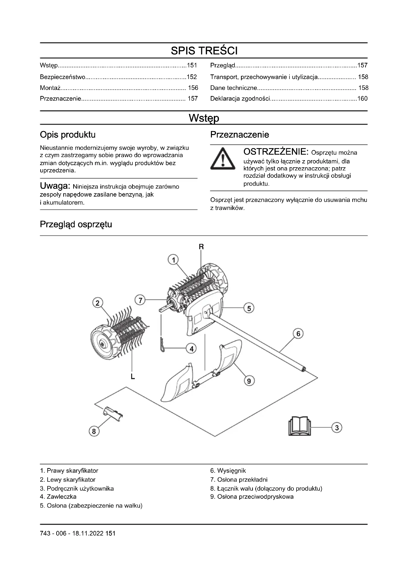 - Deklaracja zgodności Wstęp Opis produktu Nieustannie modernizujemy swoje wyroby, w związku z czym zastrzegamy sobie prawo do wprowadzania zmian dotyczących m.in. wyglądu produktów bez uprzedzenia. Uwaga: Niniejsza instrukcja obejmuje zarówno zespoły napędowe zasilane benzyną, jak i akumulatorem. Przeznaczenie OSTRZEŻENIE: Osprzętu można używać tylko łącznie z produktami, dla których jest ona przeznaczona; patrz rozdział dodatkowy w instrukcji obsługi produktu. Osprzęt jest przeznaczony wyłącznie do usuwania mchu z trawników. Przegląd osprzętu p. 160