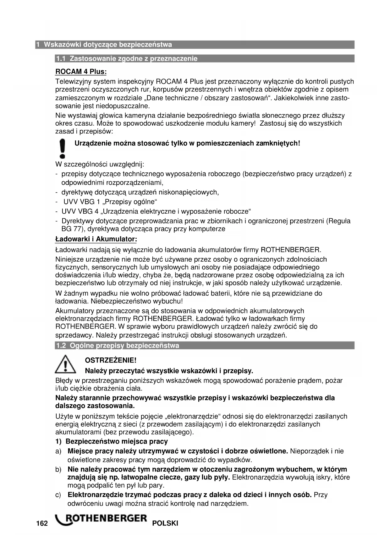 ROCAM 4 Plus: Telewizyjny system inspekcyjny ROCAM 4 Plus jest przeznaczony wyłącznie do kontroli pustych przestrzeni oczyszczonych rur, korpusów przestrzennych i wnętrza obiektów zgodnie z opisem zamieszczonym w rozdziale „Dane techniczne / obszary zastosowań“. Jakiekolwiek inne zasto- sowanie jest niedopuszczalne. Nie wystawiaj głowica kameryna działanie bezpośredniego światła słonecznego przez dłuższy okres czasu. Może to spowodować uszkodzenie modułu kamery! Zastosuj się do wszystkich zasad i przepisów: Urządzenie można stosować tylko w pomieszczeniach zamkniętych! W szczególności uwzględnij: - przepisy dotyczące technicznego wyposażenia roboczego (bezpieczeństwo pracy urządzeń) z odpowiednimi rozporządzeniami, - dyrektywę dotyczącą urządzeń niskonapięciowych, - UVV VBG 1 „Przepisy ogólne“ - UVV VBG 4 „Urządzenia elektryczne i wyposażenie robocze“ - Dyrektywy dotyczące przeprowadzania prac w zbiornikach i ograniczonej przestrzeni (Reguła BG 77), dyrektywa dotycząca pracy przy komputerze Ładowarki i Akumulator: Ładowarki nadają się wyłącznie do ładowania akumulatorów firmy ROTHENBERGER. Niniejsze urządzenie nie może być używane przez osoby o ograniczonych zdolnościach fizycznych, sensorycznych lub umysłowych ani osoby nie posiadające odpowiedniego doświadczenia i/lub wiedzy, chyba że, będą nadzorowane przez osobę odpowiedzialną za ich bezpieczeństwo lub otrzymały od niej instrukcje, w jaki sposób należy użytkować urządzenie. W żadnym wypadku nie wolno próbować ładować baterii, które nie są przewidziane do ładowania. Niebezpieczeństwo wybuchu! Akumulatory przeznaczone są do stosowania w odpowiednich akumulatorowych elektronarzędziach firmy ROTHENBERGER. Ładować tylko w ładowarkach firmy ROTHENBERGER. W sprawie wyboru prawidłowych urządzeń należy zwrócić się do sprzedawcy. Należy przestrzegać instrukcji obsługi stosowanych urządzeń.