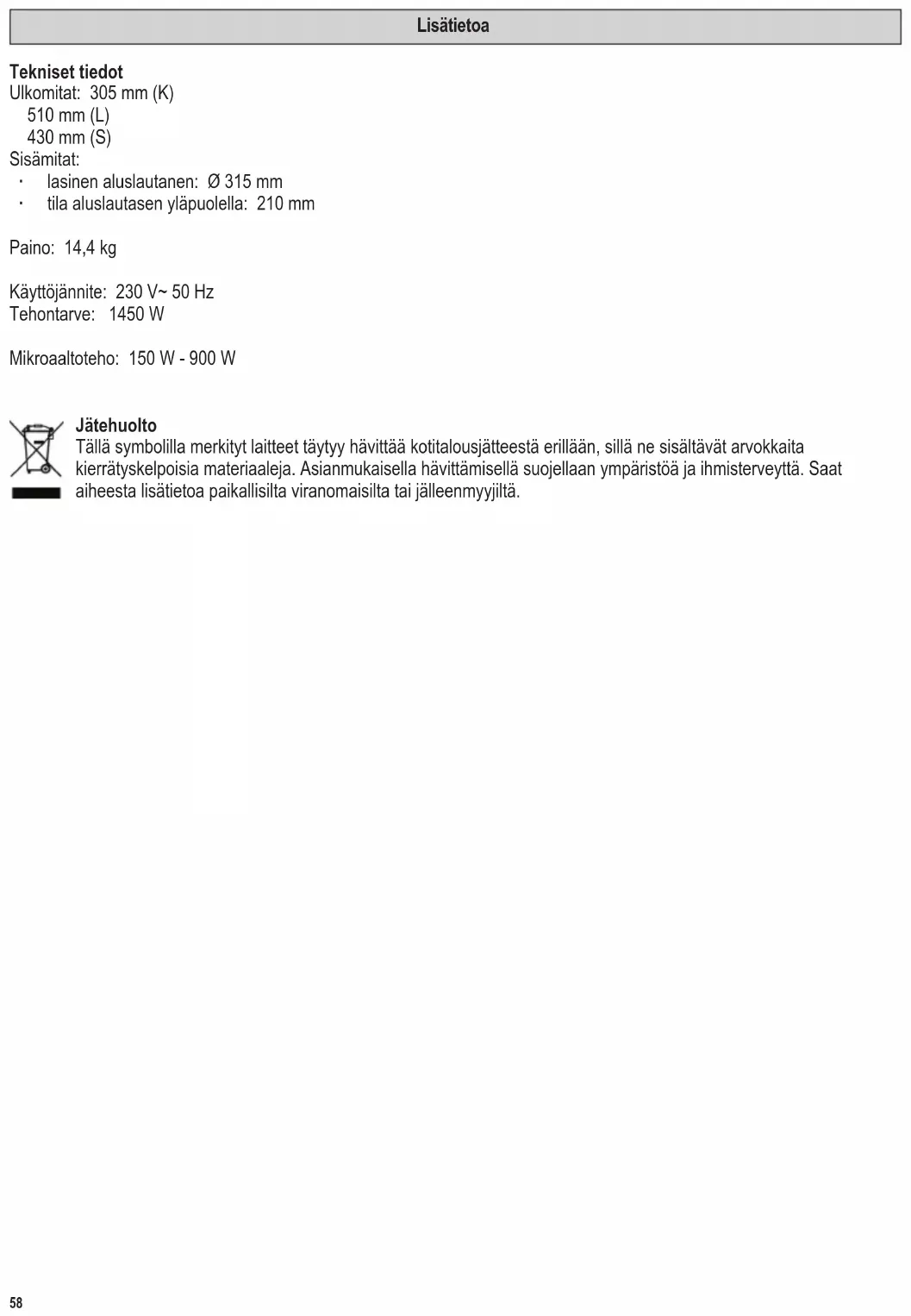 142 x 208 mm Regulator czasowy ∙ Regulator czasowy wyposażony jest w dwie skale. Zewnętrzna skala przeznaczona jest do ustawiania rozmrażania według wagi w kilogramach. Natomiast wewnętrzna skala służy do ustawiania czasu gotowania lub podgrzewania. ∙ Korzystając z regulatora czasowego można ustawić urządzenie na czas pracy do 35 min. ∙ Aby ustawić czas pracy krótszy niż 5 min. (lub na wagę niższą niż 350 g) należy najpierw przekręcić gałkę tak, by wskazywała wyższą wartość, a następnie stopniowo przekręcając ją w drugą stronę nastawić żądaną wartość. ∙ Po ustawieniu regulatora czasowego urządzenie włączy się samoczynnie w momencie zamknięcia drzwiczek. ∙ Urządzenie można wyłączyć w dowolnym momencie przestawiając gałkę regulatora czasowego w położenie ‘0’. ∙ Aby ustawić tryb rozmrażania, przekręcić potencjometr mocy na ‚Defrosting’ (Rozmrażanie). Przy użyciu zewnętrznej skali regulatora czasowego ustawić wagę rozmrażanej żywności. Wartości ustawiane przy rozmrażaniu mają charakter jedynie orientacyjny i mogą się różnić od rzeczywiście wymaganych. Jeżeli po upłynięciu ustawionego czasu danie jest nadal zamrożone, należy powtórzyć proces, ustawiając odpowiednio krótszy czas. Kolejność czynności ∙ Umieścić podgrzewaną potrawę w odpowiednim pojemniku. Postawić pojemnik wewnątrz kuchenki na szklanym talerzu obrotowym. ∙ Jeśli potrawa będzie podgrzewana mikrofalami, należy ją przykryć aby uniknąć przesuszenia. Szklane lub plastikowe pokrywki przeznaczone do stosowania w urządzeniach mikrofalowych są dostępne w sklepach ze sprzętem gospodarstwa domowego. ∙ Ustawić pokrętło regulatora mocy na wybrany poziom. ∙ Zamknąć drzwiczki i ustawić regulator czasowy w odpowiedniej pozycji. Szklany talerz zacznie się wówczas obracać i włączy się wewnętrzne oświetlenie. ∙ Jeżeli w trakcie pracy drzwiczki zostaną otwarte (np. w celu zamieszania potrawy), urządzenie przerwie pracę, a po ponownym zamknięciu drzwiczek uruchomi się samoczynnie. ∙ Po upływie żądanego czasu pojawia się sygnał dźwiękowy oraz gaśnie wewnętrzne oświetlenie. Oświetlenie gaśnie również po otwarciu drzwiczek. ∙ Otworzyć drzwiczki i wyjąć pojemnik z potrawą. ∙ W celu uzyskania równomiernego rozkładu temperatury potrawy, pojemnik należy odstawić na kilka minut. Czyszczenie i konserwacja ∙ Przed przystąpieniem do czyszczenia urządzenie należy odłączyć od zasilania i odczekać, aż całkowicie ostygnie. ∙ Do mycia kuchenki nie należy stosować wody. Nie wolno dopuścić, aby nawet minimalna ilość wody dostała się do jej wnętrza przez otwory wentylacyjne na wewnętrznych lub zewnętrznych ściankach. Nie należy również stosować urządzeń wytwarzających parę pod ciśnieniem. ∙ Wszystkie powierzchnie urządzenia można czyścić lekko wilgotną ściereczką z odrobiną łagodnego płynu do mycia. Po umyciu wytrzeć urządzenie do sucha. ∙ Nie stosować materiałów szorujących ani żrących środków czyszczących. Ponadto, nie należy stosować dostępnych w sklepach środków w sprayu przeznaczonych do czyszczenia zwykłych piekarników. ∙ Powierzchnie wewnętrzne należy starannie oczyścić. Usuwać wszelkie resztki jedzenia. ∙ Wewnętrzna strona i rama drzwiczek, pierścień obrotowy/zespół napędowy oraz powierzchnia pod szklanym talerzem muszą być zawsze czyste. ∙ Szklany talerz obrotowy oraz pierścień obrotowy/zespół napędowy można myć w gorącej wodzie z dodatkiem płynu.65 142 x 208 mm Informacje dodatkowe Dane techniczne Wymiary zewnętrzne: 305 mm (wys.) 510 mm (szer.) 430 mm (dług.) Wymiary wewnętrzne: ∙ szklany talerz obrotowy Ø 315 mm ∙ prześwit nad szklanym talerzem 210 mm Waga: 14,4 kg Napięcie znam.: 230 V ~ 50 Hz Pobór mocy: 1450 W Moc prom. mikrofalowego 150 W - 900 W Utylizacja Urządzenia oznaczone powyższym symbolem należy usuwać osobno, a nie wraz ze zwykłymi odpadkami z gospodarstwa domowego. Urządzenia takie zawierają bowiem cenne materiały, jakie można poddać recyklingowi. Odpowiednia utylizacja takich urządzeń przyczynia się do ochrony środowiska i zdrowia ludzkiego. Szczegółowych informacji na ten temat udzielają lokalne władze lub sklepy prowadzące sprzedaż detaliczną.66 142 x 208 mm Φούρνος μικροκυμάτων Αγαπητοί πελάτες, Πριν χρησιμοποιήσετε το φούρνο μικροκυμάτων, διαβάστε προσεκτικά τις ακόλουθες οδηγίες και φυλάξτε το παρόν εγχειρίδιο για μελλοντική χρήση. Η συσκευή πρέπει να χρησιμοποιείται μόνο από άτομα που γνωρίζουν καλά τις οδηγίες. Τα μέρη της συσκευής