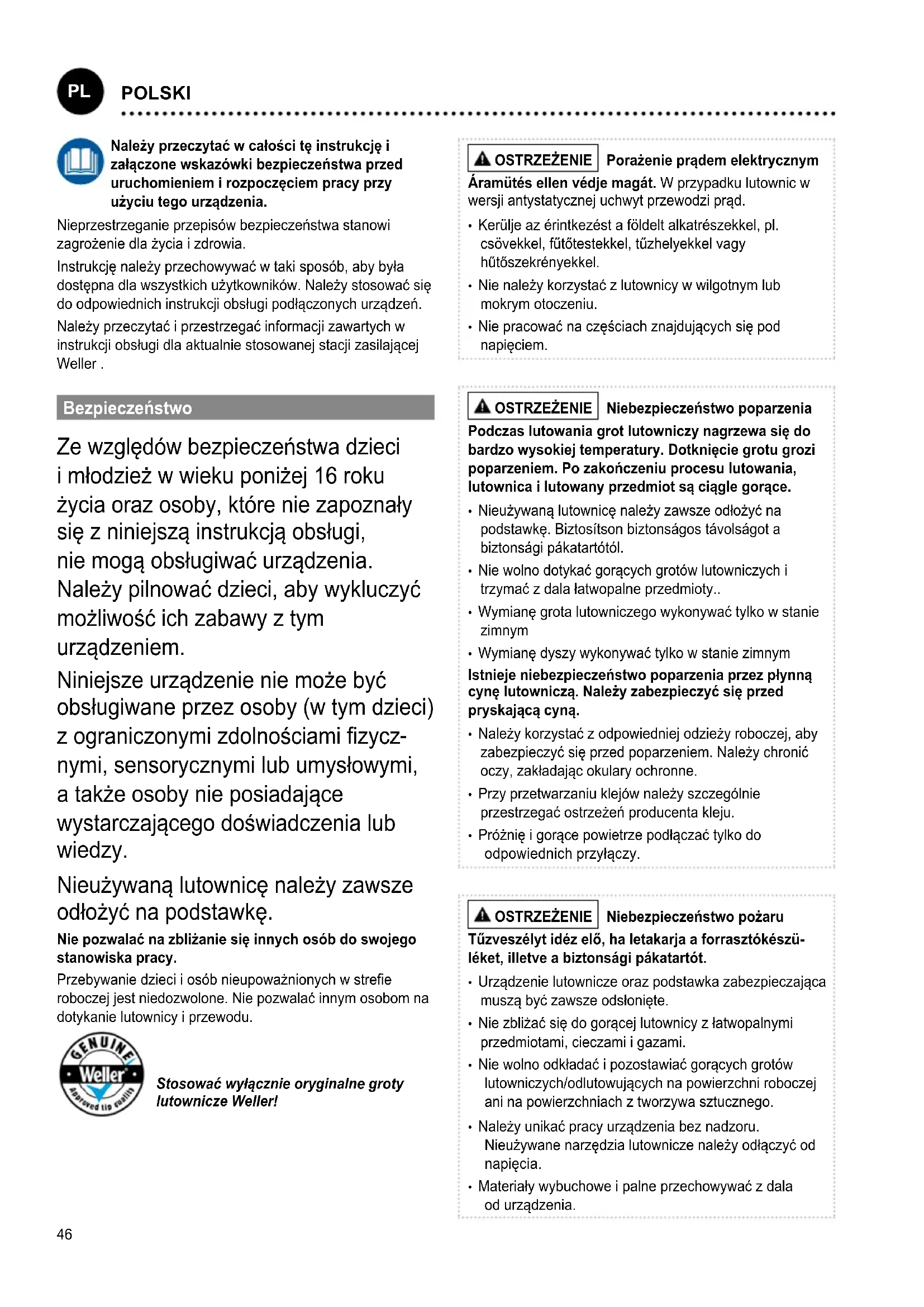 ČESKÝ46 Należy przeczytać w całości tę instrukcję i załączone wskazówki bezpieczeństwa przed uruchomieniem i rozpoczęciem pracy przy użyciu tego urządzenia. Nieprzestrzeganie przepisów bezpieczeństwa stanowi zagrożenie dla życia i zdrowia. Instrukcję należy przechowywać w taki sposób, aby była dostępna dla wszystkich użytkowników. Należy stosować się do odpowiednich instrukcji obsługi podłączonych urządzeń. Należy przeczytać i przestrzegać informacji zawartych w instrukcji obsługi dla aktualnie stosowanej stacji zasilającej Weller . Bezpieczeństwo Ze względów bezpieczeństwa dzieci i młodzież w wieku poniżej 16 roku życia oraz osoby, które nie zapoznały się z niniejszą instrukcją obsługi, nie mogą obsługiwać urządzenia. Należy pilnować dzieci, aby wykluczyć możliwość ich zabawy z tym urządzeniem. Niniejsze urządzenie nie może być obsługiwane przez osoby (w tym dzieci) z ograniczonymi zdolnościami zycz
