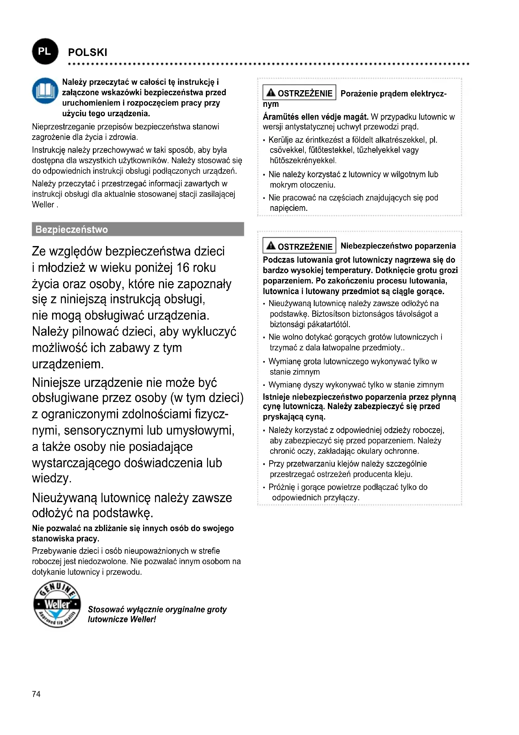 ČESKÝ74 Należy przeczytać w całości tę instrukcję i załączone wskazówki bezpieczeństwa przed uruchomieniem i rozpoczęciem pracy przy użyciu tego urządzenia. Nieprzestrzeganie przepisów bezpieczeństwa stanowi zagrożenie dla życia i zdrowia. Instrukcję należy przechowywać w taki sposób, aby była dostępna dla wszystkich użytkowników. Należy stosować się do odpowiednich instrukcji obsługi podłączonych urządzeń. Należy przeczytać i przestrzegać informacji zawartych w instrukcji obsługi dla aktualnie stosowanej stacji zasilającej Weller . Bezpieczeństwo Ze względów bezpieczeństwa dzieci i młodzież w wieku poniżej 16 roku życia oraz osoby, które nie zapoznały się z niniejszą instrukcją obsługi, nie mogą obsługiwać urządzenia. Należy pilnować dzieci, aby wykluczyć możliwość ich zabawy z tym urządzeniem. Niniejsze urządzenie nie może być obsługiwane przez osoby (w tym dzieci) z ograniczonymi zdolnościami zycz