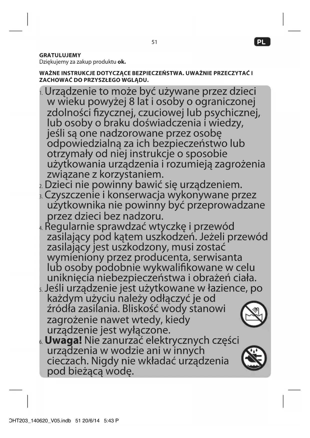 urządzenia w wodzie ani w innych cieczach. Nigdy nie wkładać urządzenia pod bieżącą wodę. IM_OHT203_140620_V05.indb 51 20/6/14 5:43 PMPL