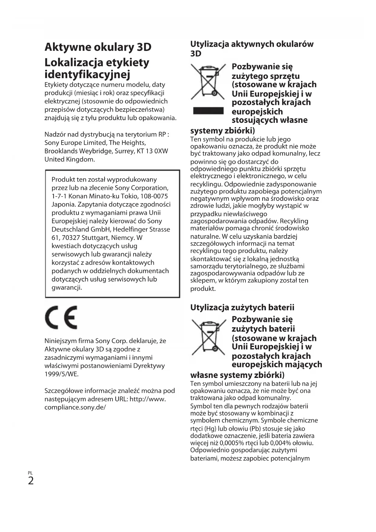 Aktywne okulary 3D Lokalizacja etykiety identyfikacyjnej Etykiety dotyczące numeru modelu, daty produkcji (miesiąc i rok) oraz specyfikacji elektrycznej (stosownie do odpowiednich przepisów dotyczących bezpieczeństwa) znajdują się z tyłu produktu lub opakowania. Nadzór nad dystrybucją na terytorium RP : Sony Europe Limited, The Heights, Brooklands Weybridge, Surrey, KT 13 0XW United Kingdom. Produkt ten został wyprodukowany przez lub na zlecenie Sony Corporation, 1-7-1 Konan Minato-ku Tokio, 108-0075 Japonia. Zapytania dotyczące zgodności produktu z wymaganiami prawa Unii Europejskiej należy kierować do Sony Deutschland GmbH, Hedelfinger Strasse 61, 70327 Stuttgart, Niemcy. W kwestiach dotyczących usług serwisowych lub gwarancji należy korzystać z adresów kontaktowych podanych w oddzielnych dokumentach dotyczących usług serwisowych lub gwarancji. Niniejszym firma Sony Corp. deklaruje, że Aktywne okulary 3D są zgodne z zasadniczymi wymaganiami i innymi właściwymi postanowieniami Dyrektywy 1999/5/WE. Szczegółowe informacje znaleźć można pod następującym adresem URL: http://www. compliance.sony.de/ Utylizacja aktywnych okularów