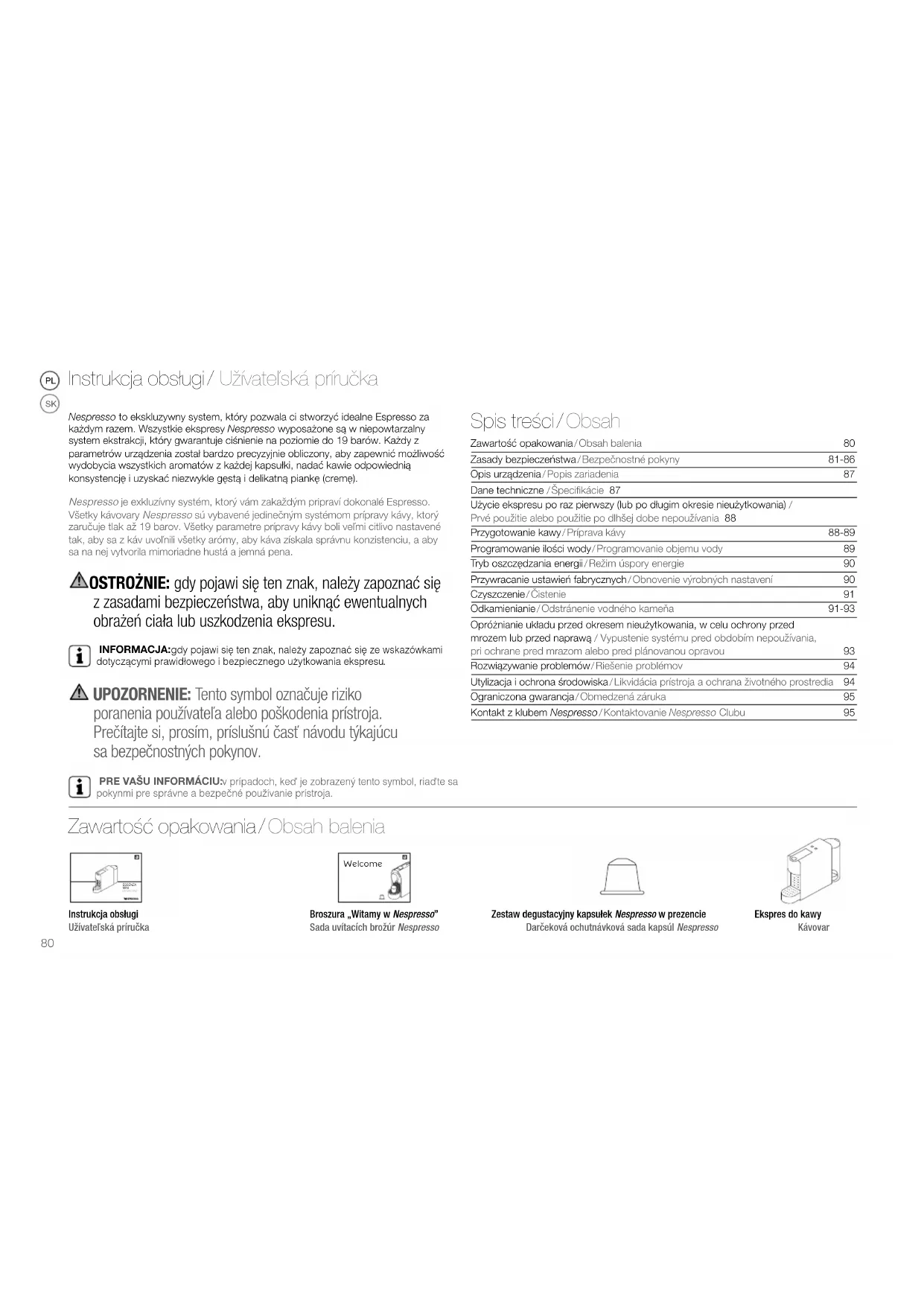 PRE VAŠU INFORMÁCIU: v prípadoch, keď je zobrazený tento symbol, riaďte sa pokynmi pre správne a bezpečné používanie prístroja. Zawartość opakowania / Obsah balenia Zestaw degustacyjny kapsułek Nespresso w prezencie Darčeková ochutnávková sada kapsúl Nespresso Broszura „Witamy w Nespresso” Sada uvítacích brožúr Nespresso Instrukcja obsługi Užívateľská príručka Ekspres do kawy Kávovar Spis treści / Obsah Zawartość opakowania / Obsah balenia 80 Zasady bezpieczeństwa / Bezpečnostné pokyny 81-86 Opis urządzenia / Popis zariadenia 87 Dane techniczne / Špecifikácie 87 Użycie ekspresu po raz pierwszy (lub po długim okresie nieużytkowania) / Prvé použitie alebo použitie po dlhšej dobe nepoužívania 88 Przygotowanie kawy / Príprava kávy 88-89 Programowanie ilości wody / Programovanie objemu vody 89 Tryb oszczędzania energii / Režim úspory energie 90 Przywracanie ustawień fabrycznych / Obnovenie výrobných nastavení 90 Czyszczenie / Čistenie 91 Odkamienianie / Odstránenie vodného kameňa 91-93 Opróżnianie układu przed okresem nieużytkowania, w celu ochrony przed mrozem lub przed naprawą / Vypustenie systému pred obdobím nepoužívania, pri ochrane pred mrazom alebo pred plánovanou opravou 93 Rozwiązywanie problemów / Riešenie problémov 94 Utylizacja i ochrona środowiska / Likvidácia prístroja a ochrana životného prostredia 94 Ograniczona gwarancja / Obmedzená záruka 95 Kontakt z klubem Nespresso / Kontaktovanie Nespresso Clubu 95