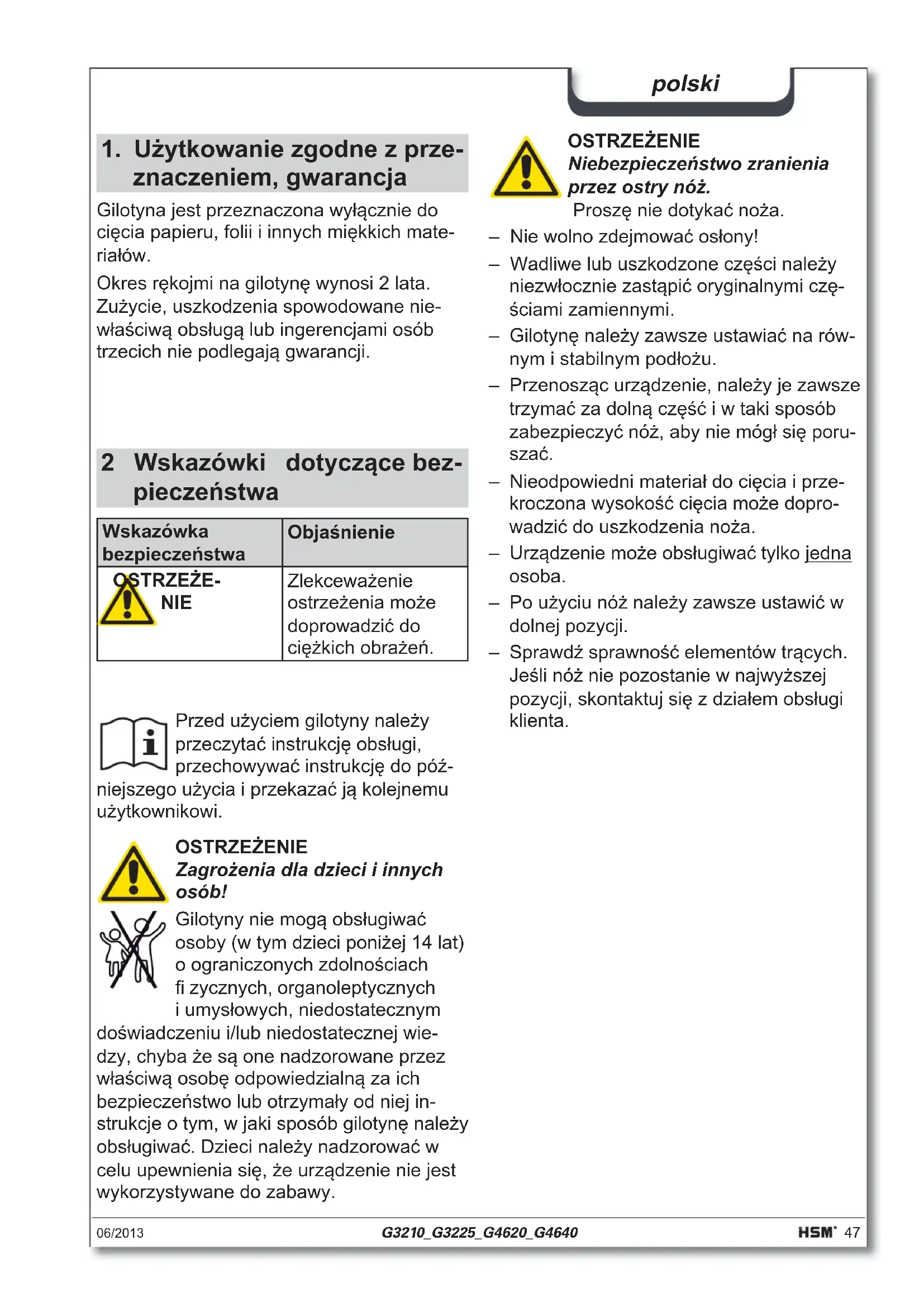 znaczeniem, gwarancja Gilotyna jest przeznaczona wyłącznie do cięcia papieru, folii i innych miękkich mate- riałów. Okres rękojmi na gilotynę wynosi 2 lata. Zużycie, uszkodzenia spowodowane nie- właściwą obsługą lub ingerencjami osób trzecich nie podlegają gwarancji. 2 Wskazówki dotyczące bez- pieczeństwa48 G3210_G3225_G4620_G4640 06/2013 polski OSTRZEŻENIE Używanie gilotyny bez osłony może doprowadzić do ciężkich obrażeń i jest zabronione!