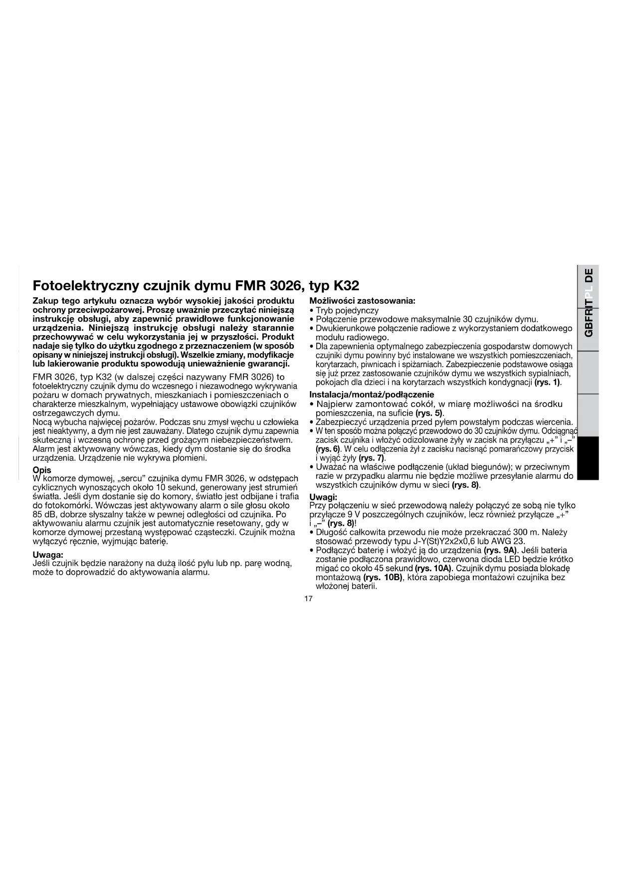 - Podłączyćbaterięiwłożyćjądourządzenia(rys. 9A).Jeślibateria zostaniepodłączonaprawidłowo,czerwonadiodaLEDbędziekrótko migaćcookoło45sekund(rys. 10A).Czujnikdymuposiadablokadę montażową(rys. 10B),którazapobiegamontażowiczujnikabez włożonejbaterii. Zakup tego artykułu oznacza wybór wysokiej jakości produktu ochrony przeciwpożarowej. Proszę uważnie przeczytać niniejszą instrukcję obsługi, aby zapewnić prawidłowe funkcjonowanie urządzenia. Niniejszą instrukcję obsługi należy starannie przechowywać w celu wykorzystania jej w przyszłości. Produkt nadaje się tylko do użytku zgodnego z przeznaczeniem (w sposób opisany w niniejszej instrukcji obsługi). Wszelkie zmiany, modyfikacje lub lakierowanie produktu spowodują unieważnienie gwarancji. FMR3026,typK32(wdalszejczęścinazywanyFMR3026)to fotoelektrycznyczujnikdymudowczesnegoiniezawodnegowykrywania pożaruwdomachprywatnych,mieszkaniachipomieszczeniacho charakterzemieszkalnym,wypełniającyustawoweobowiązkiczujników ostrzegawczychdymu. Nocąwybuchanajwięcejpożarów.Podczassnuzmysłwęchuuczłowieka jestnieaktywny,adymniejestzauważany.Dlategoczujnikdymuzapewnia skutecznąiwczesnąochronęprzedgrożącymniebezpieczeństwem. Alarmjestaktywowanywówczas,kiedydymdostaniesiędośrodka urządzenia.Urządzenieniewykrywapłomieni. Opis Wkomorzedymowej,„sercu”czujnikadymuFMR3026,wodstępach cyklicznychwynoszącychokoło10sekund,generowanyjeststrumień światła.Jeślidymdostaniesiędokomory,światłojestodbijaneitraa dofotokomórki.Wówczasjestaktywowanyalarmosiległosuokoło 85dB,dobrzesłyszalnytakżewpewnejodległościodczujnika.Po aktywowaniualarmuczujnikjestautomatycznieresetowany,gdyw komorzedymowejprzestanąwystępowaćcząsteczki.Czujnikmożna wyłączyćręcznie,wyjmującbaterię. Uwaga: Jeśliczujnikbędzienarażonynadużąilośćpyłulubnp.paręwodną, możetodoprowadzićdoaktywowaniaalarmu. Fotoelektryczny czujnik dymu FMR 3026, typ K3218